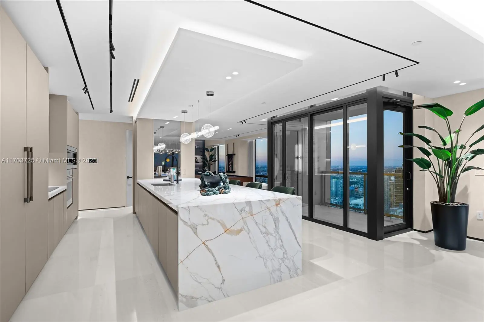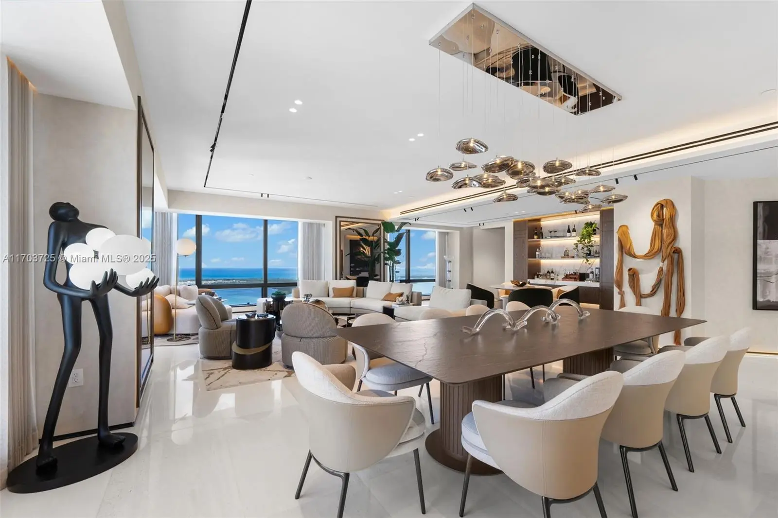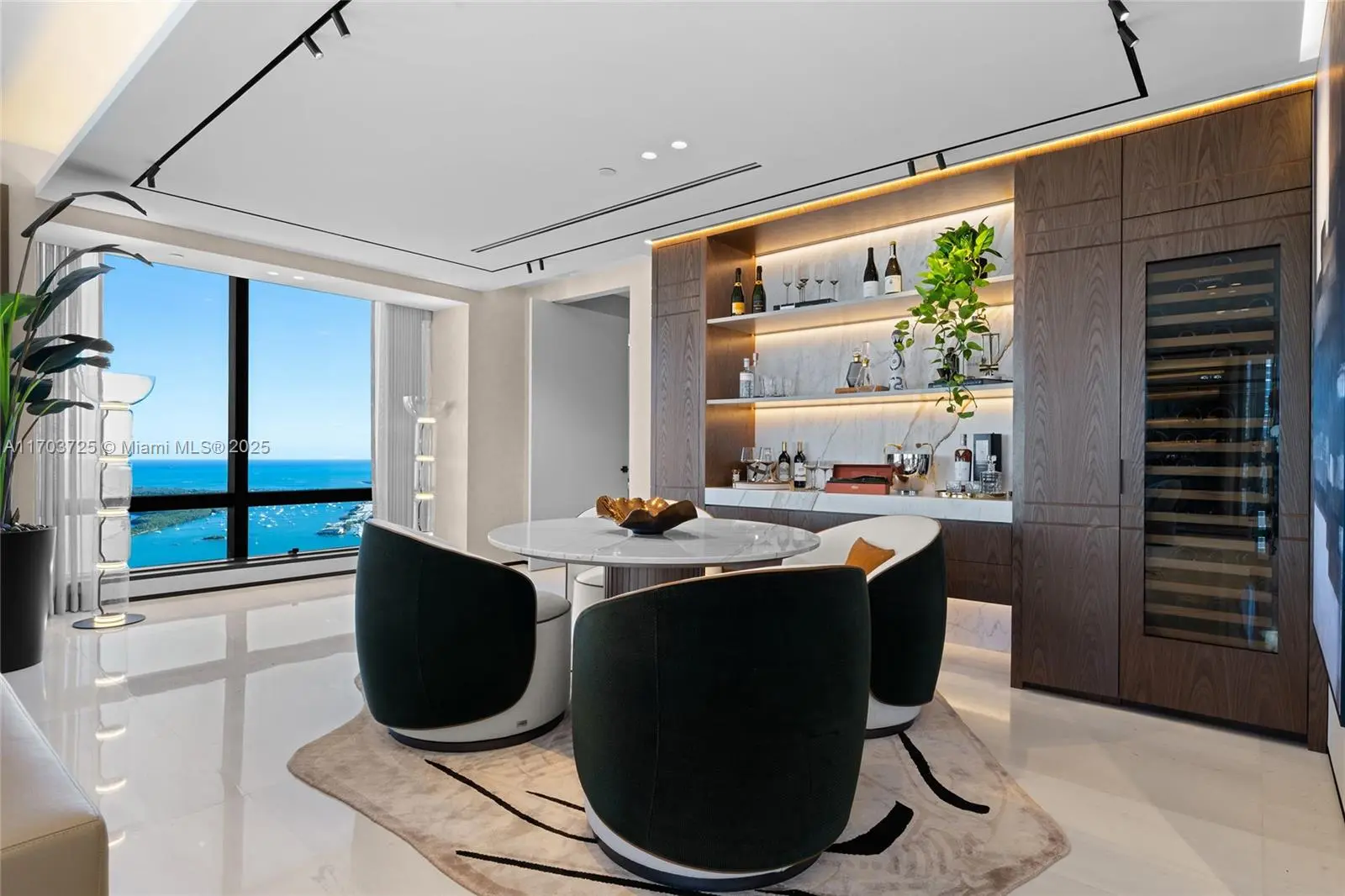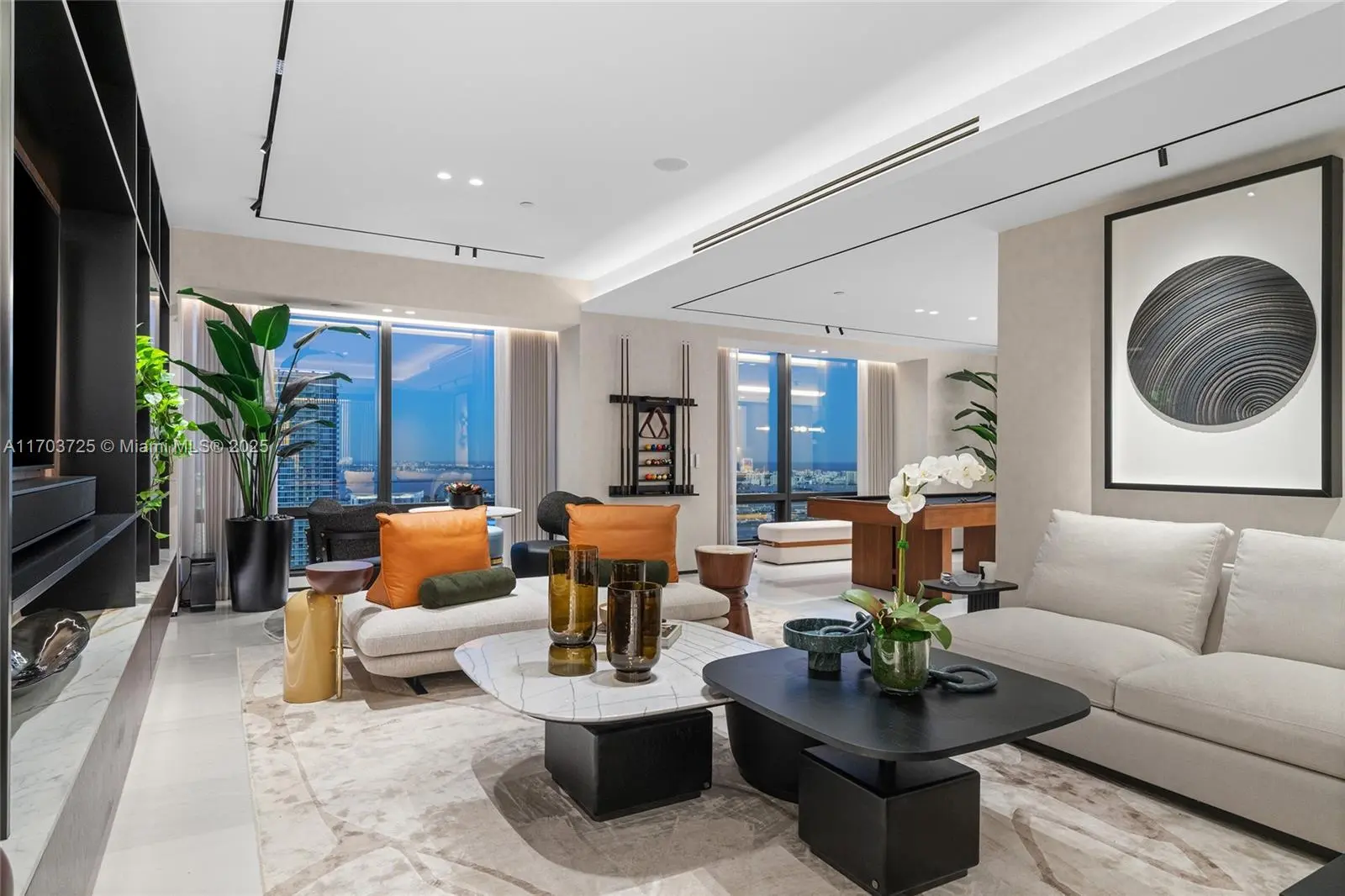 Welcome to Lower Penthouse 66. This fully renovated turnkey masterpiece in the prestigious Four Seasons Residences is situated on the 66th floor, in the building’s most desirable lines, D & E. This residence seamlessly merges two units, offering panoramic ocean and city views from every room. The interiors exude sophistication with Bianco Ondulato marble floors and an Ornare kitchen featuring Calacatta countertops. Furnished by Fendi, Minotti, and Luxury Living. Spa-like bathrooms with Armani fixtures, LED-lit recessed baseboards, gunmetal accents, and smart home technology. Ideal for entertaining, the home includes a lounge, bar, private office, family room, and maid’s quarters. World-class amenities include an Equinox fitness center, spa, multiple pools, and 24-hour concierge services. Furniture and décor are included in the sale.