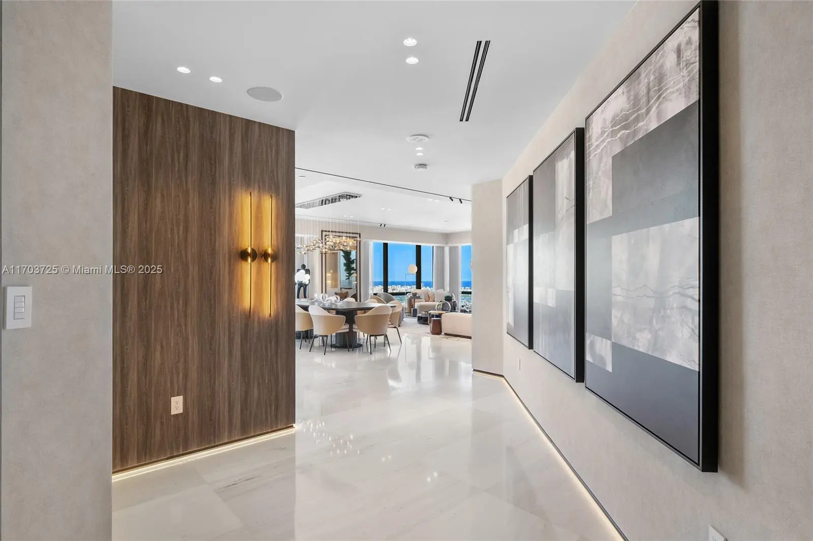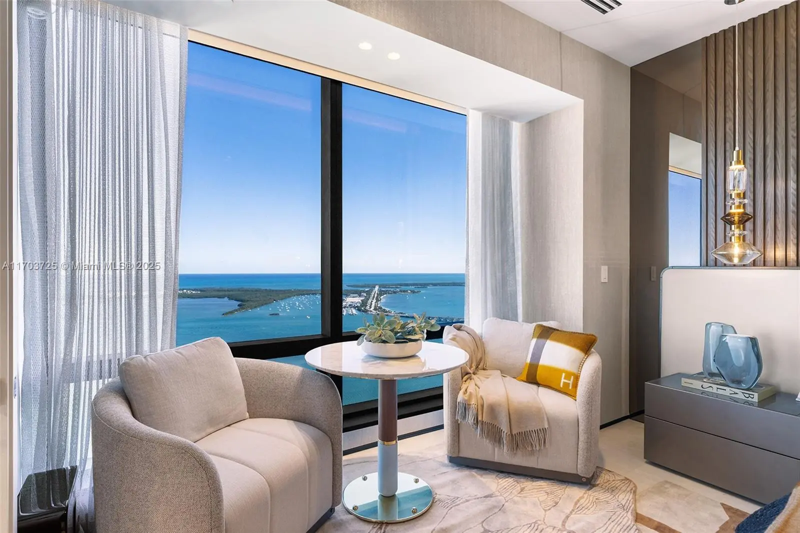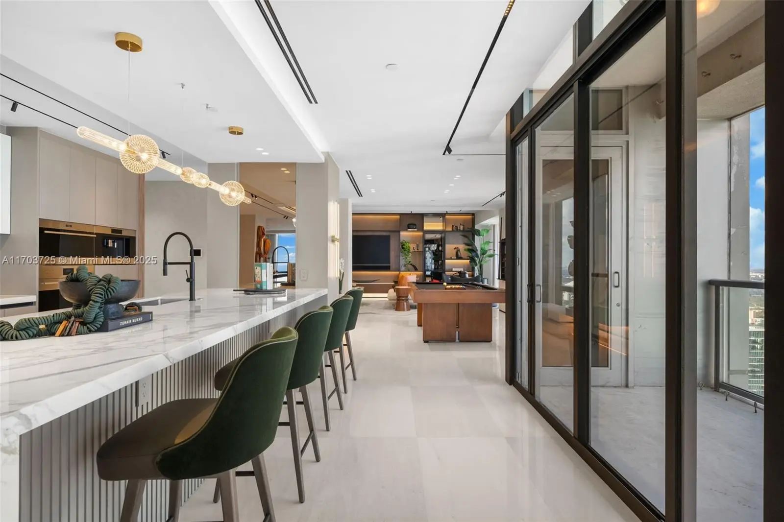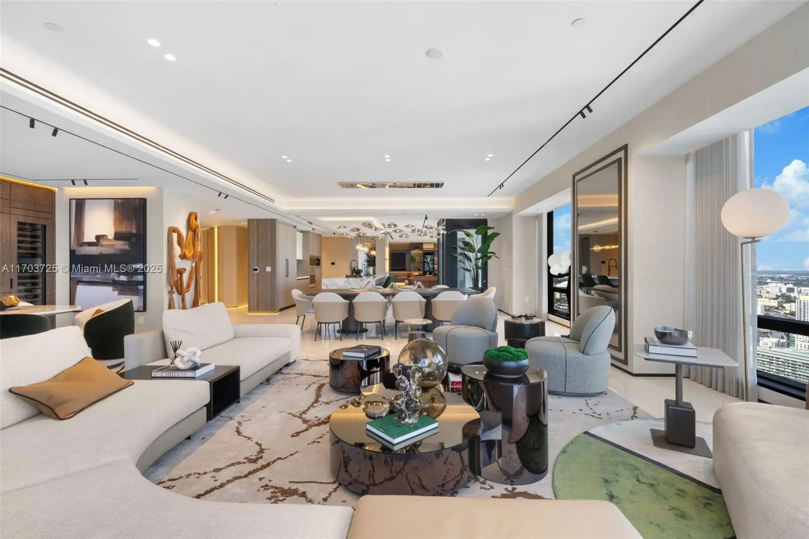 Welcome to Lower Penthouse 66. This fully renovated turnkey masterpiece in the prestigious Four Seasons Residences is situated on the 66th floor, in the building’s most desirable lines, D & E. This residence seamlessly merges two units, offering panoramic ocean and city views from every room. The interiors exude sophistication with Bianco Ondulato marble floors and an Ornare kitchen featuring Calacatta countertops. Furnished by Fendi, Minotti, and Luxury Living. Spa-like bathrooms with Armani fixtures, LED-lit recessed baseboards, gunmetal accents, and smart home technology. Ideal for entertaining, the home includes a lounge, bar, private office, family room, and maid’s quarters. World-class amenities include an Equinox fitness center, spa, multiple pools, and 24-hour concierge services. Furniture and décor are included in the sale.