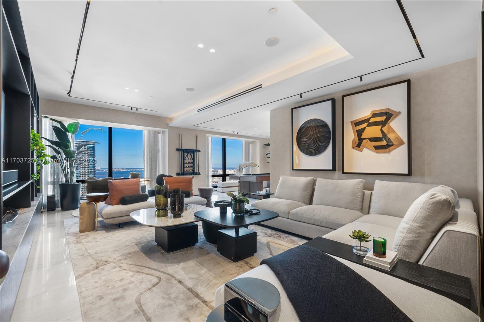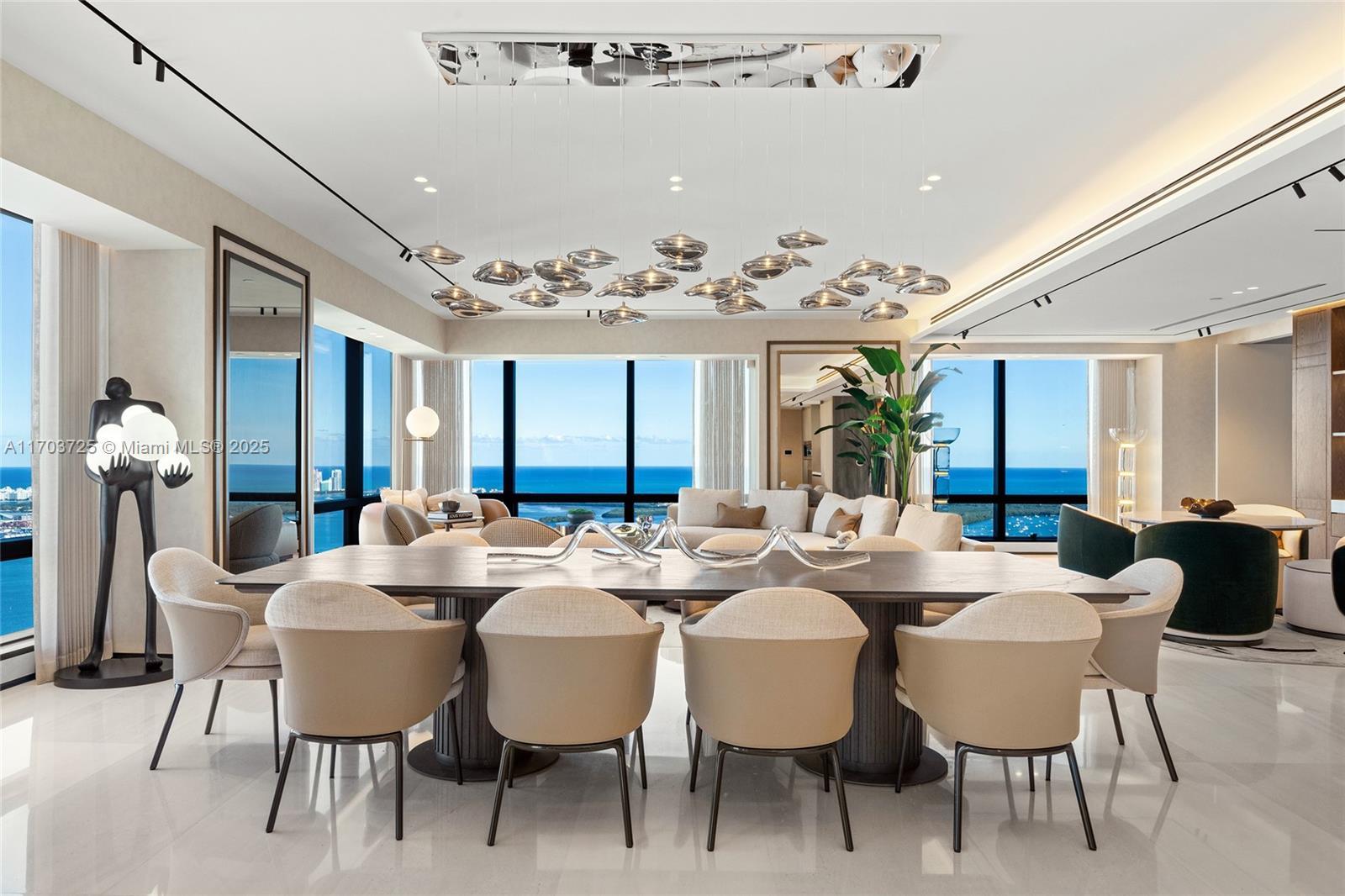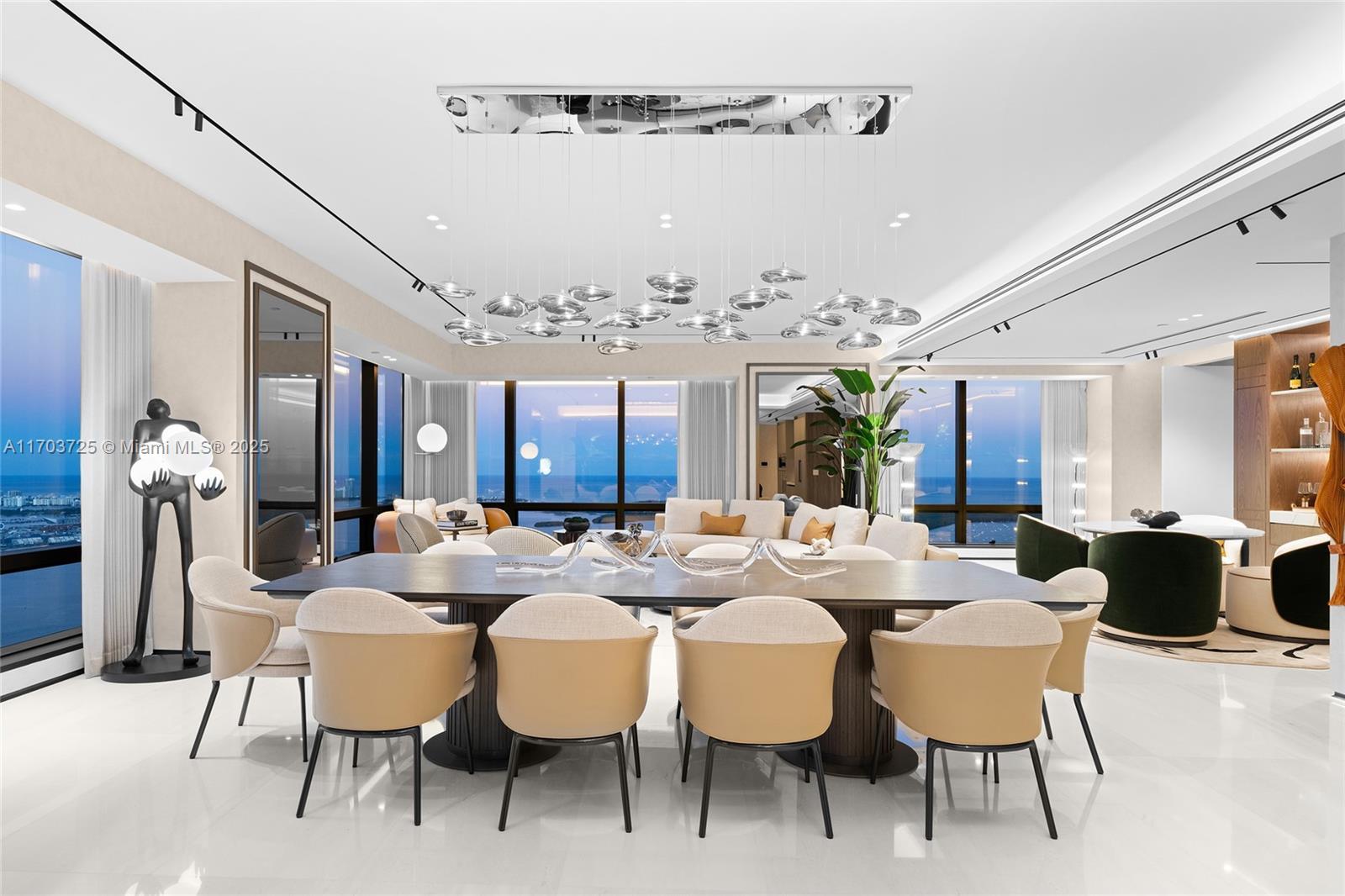Welcome to Lower Penthouse 66. This fully renovated turnkey masterpiece in the prestigious Four Seasons Residences is situated on the 66th floor, in the building’s most desirable lines, D & E. This residence seamlessly merges two units, offering panoramic ocean and city views from every room. The interiors exude sophistication with Bianco Ondulato marble floors and an Ornare kitchen featuring Calacatta countertops. Furnished by Fendi, Minotti, and Luxury Living. Spa-like bathrooms with Armani fixtures, LED-lit recessed baseboards, gunmetal accents, and smart home technology. Ideal for entertaining, the home includes a lounge, bar, private office, family room, and maid’s quarters. World-class amenities include an Equinox fitness center, spa, multiple pools, and 24-hour concierge services