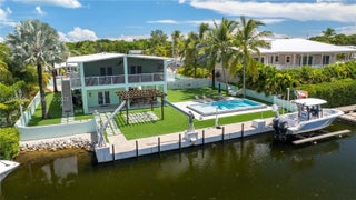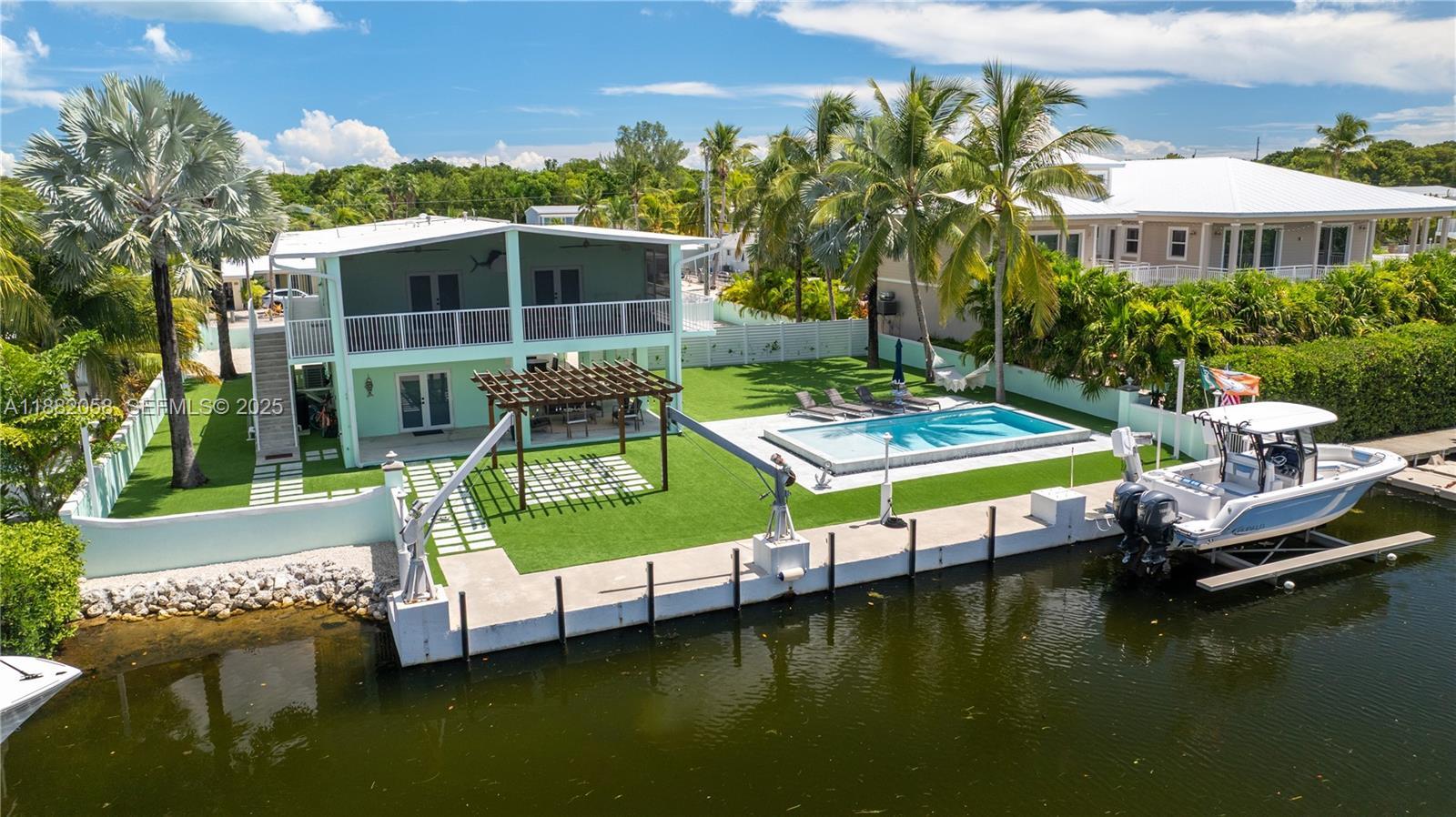 Welcome to your very own Florida Keys compound Set on an oversized 13,000 sq ft Key Largo lot, this private oasis blends style, space, and tranquility perfectly. Dive into the large swimming pool, outfitted with vibrant LED lighting, and a heater/chiller system. This 3-bedroom, 2-bath retreat thoughtfully updated and decorated with coastal flair, featuring a wraparound balcony and a large screened patio overlooking the peaceful 70 ft wide canal. Downstairs, you’ll find a 1/1 approx 720 Sq Ft—ideal for guests and entertaining. The property boasts 100 feet of waterfront frontage along a wide canal, anchored by a solid concrete deep-water dock equipped with a convenient 10K elevator boat lift. This lot spans 100 feet wide by 130 feet deep, fully secured behind two electric gates.