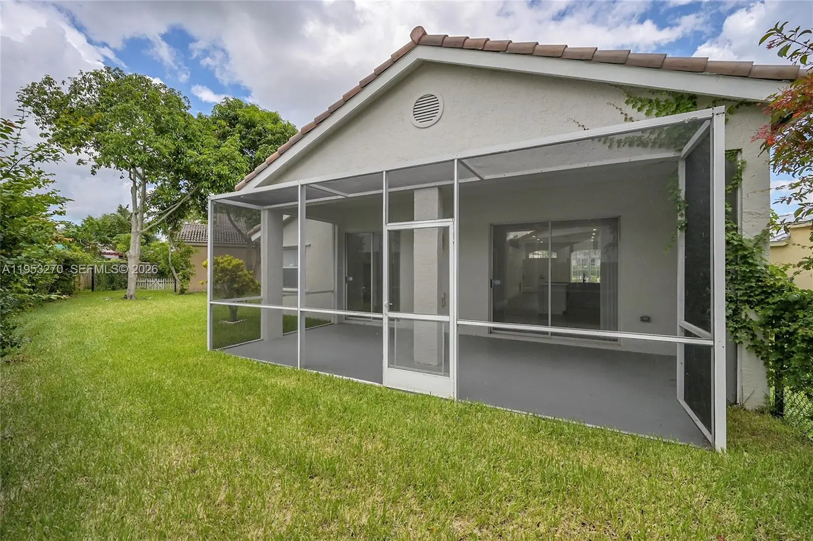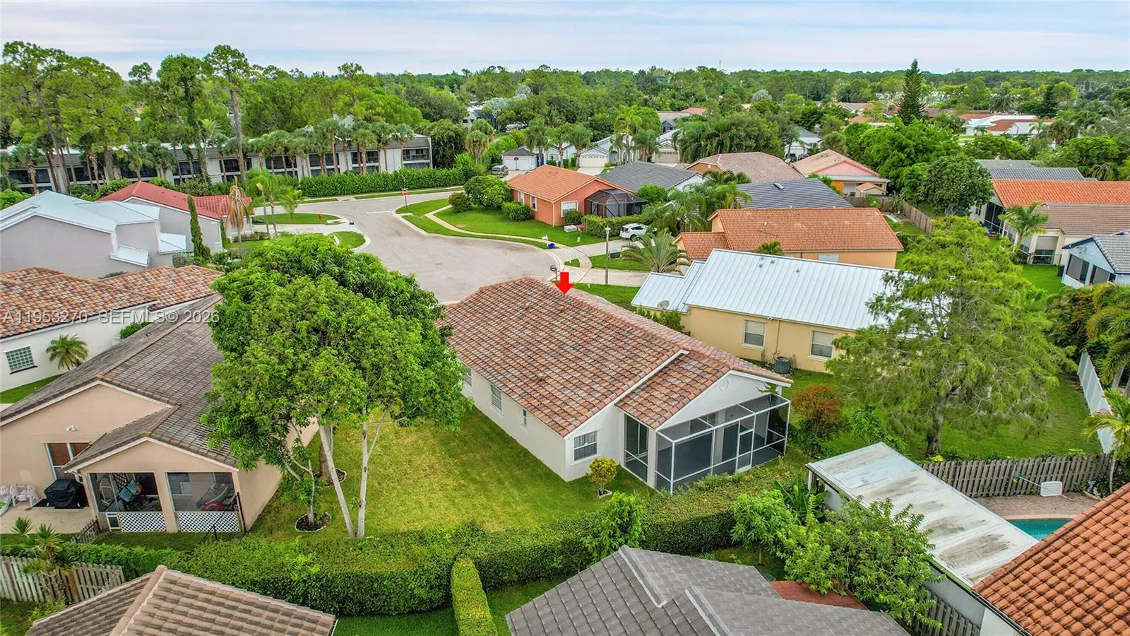 This 3-bedroom, 2-bathroom single-family home sits on an oversized lot on a quiet cul-de-sac with a 2-car garage and low HOA fees. The exterior features a 2022 BARREL TILE ROOF, a 2023 water heater, and a fully sprinklered lawn with mature fruit trees. Inside, the open layout receives lots of natural light and includes waterproof luxury vinyl flooring, quartz countertops, and a kitchen equipped with white shaker cabinets, an island, and stainless steel appliances, also includes washer and dryer. Both bathrooms feature porcelain tile and walk-in showers with frameless glass, with the master suite adding dual sink vanities and a floating tub. A large screened-in patio overlooks the backyard, which provides space for a pool and gatherings.