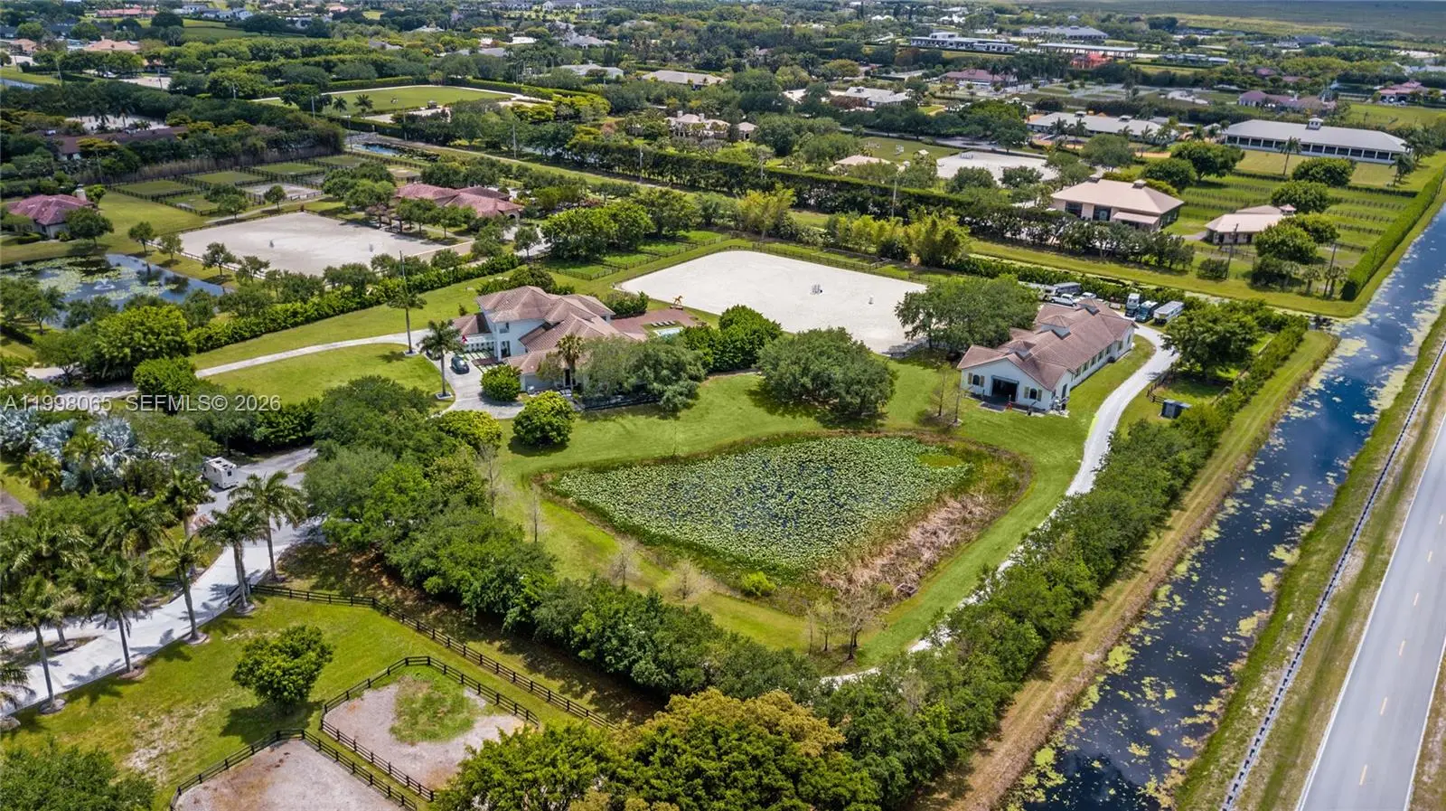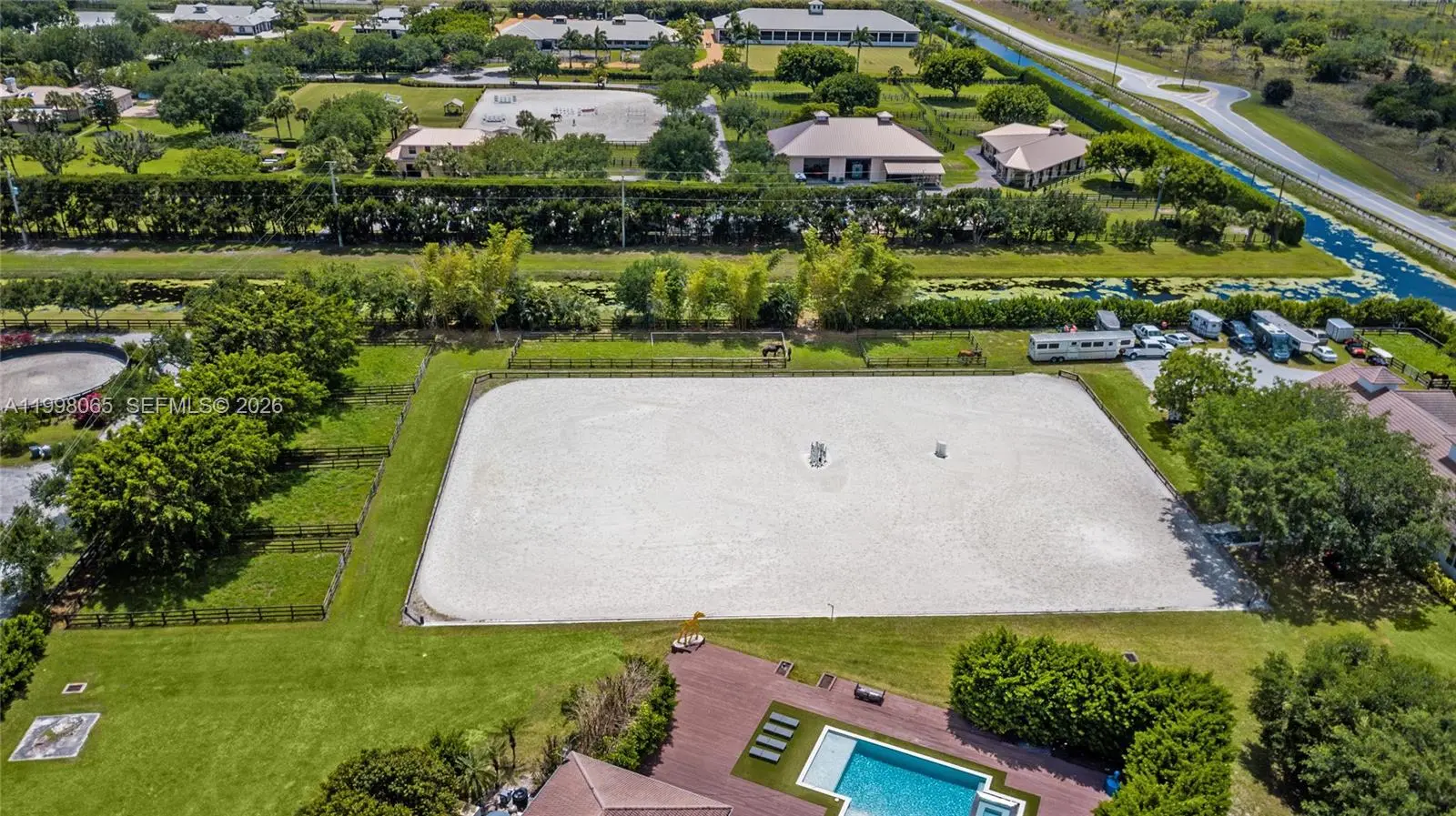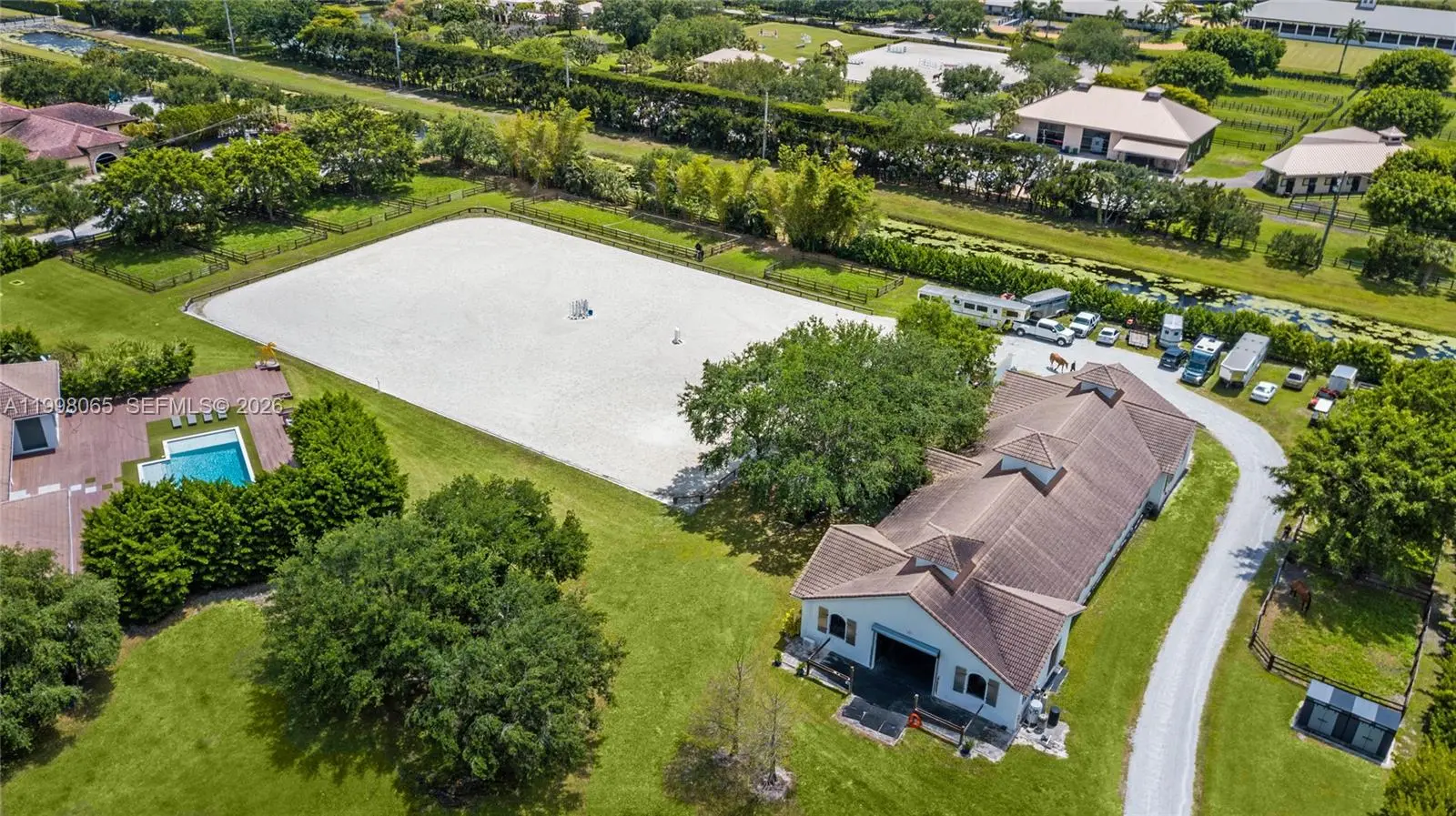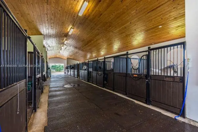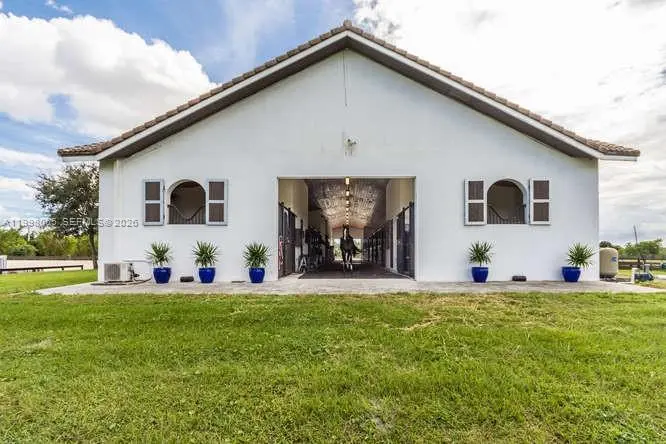 Breathtaking contemporary estate in Palm Beach Point set on over 7 acres of prime equestrian land. This exceptional property features soaring 30-foot ceilings, 8 spacious bedrooms, 9 bathrooms, plus 2 studio staff or grooms quarters in the barn with full kitchen and baths. Designed with both luxury and functionality in mind, the property includes a brand-new 12-stall center-aisle barn complete with tack room, feed room, laundry room, and two wash and grooming stalls. Nine irrigated grass paddocks provide ample turnout, while the impressive 230 x 150 arena is finished with premium Martin Collins “Clopf” footing. A stunning pool overlooks the arena, creating the perfect balance between high-end living and world-class equestrian facilities.