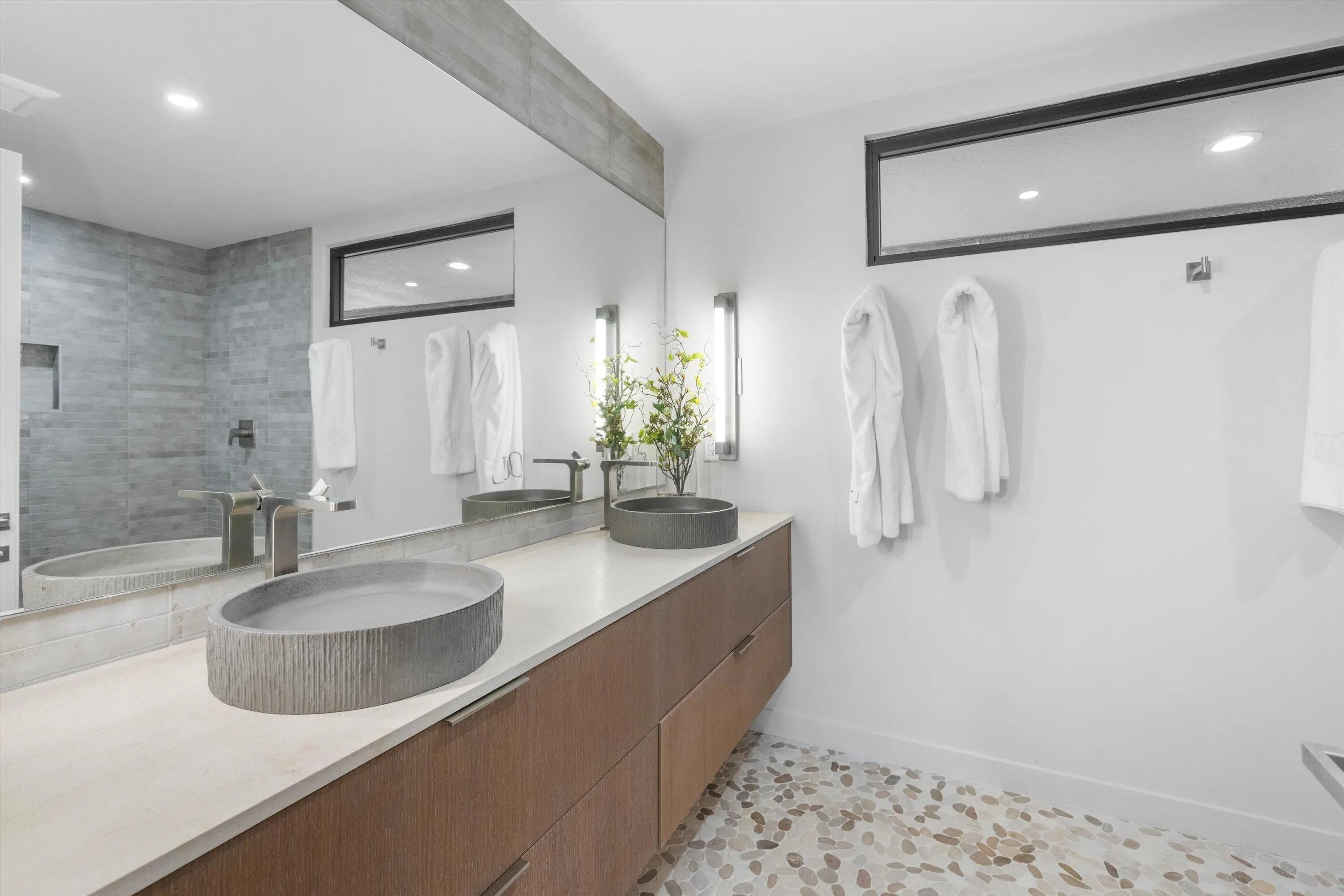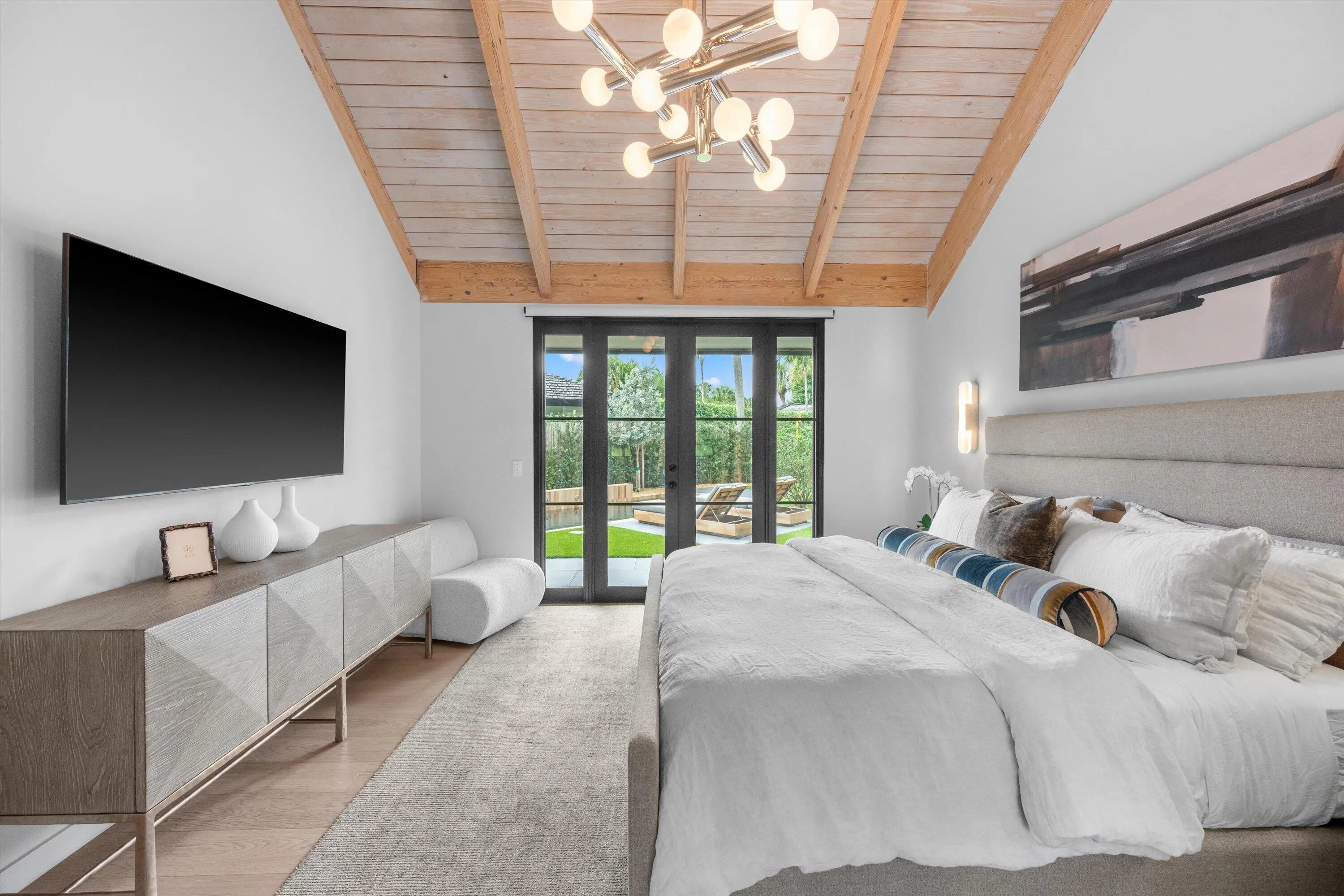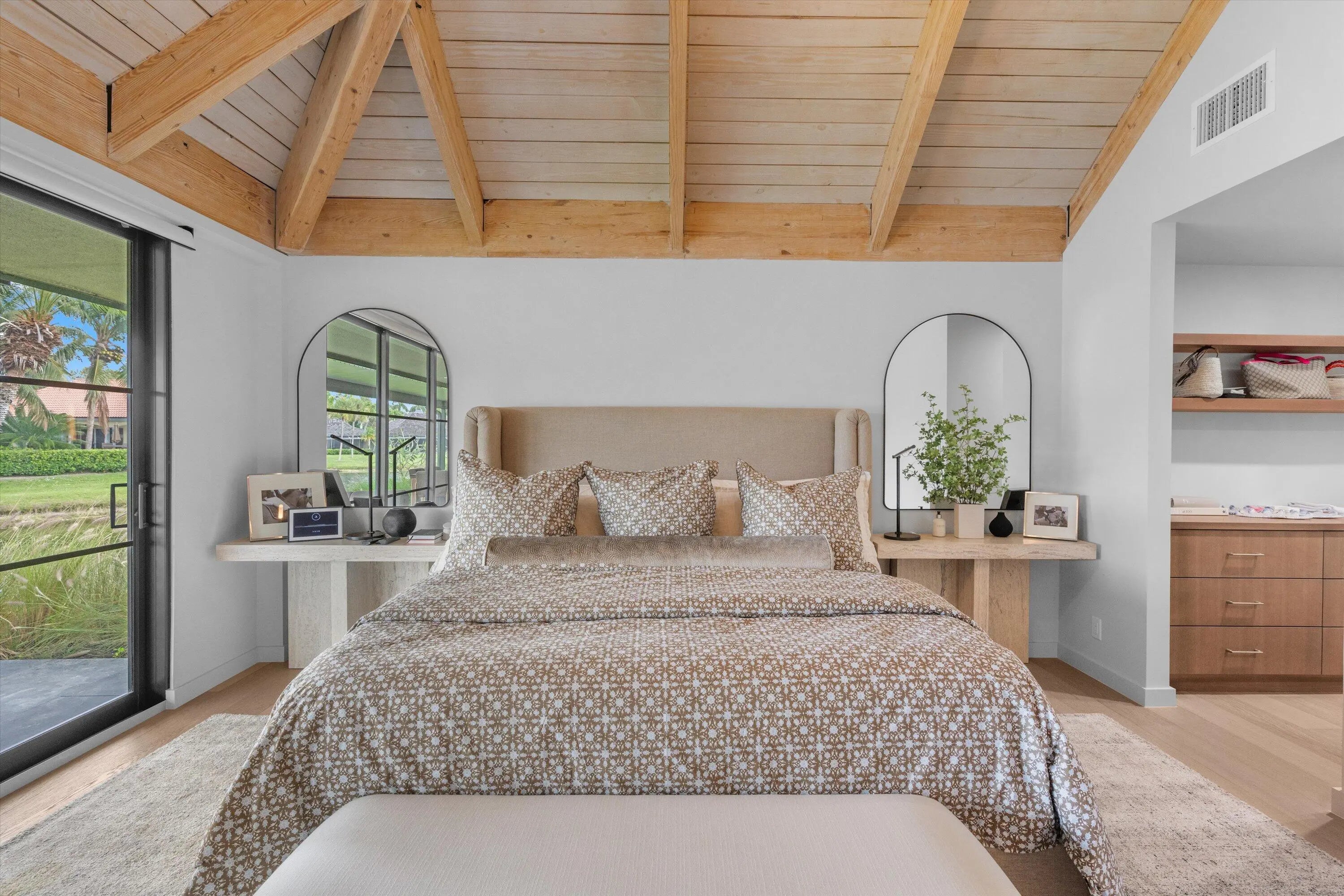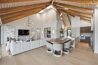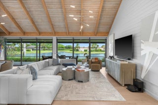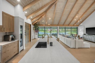 Tucked within the sought-after Palm Beach Polo community, this fully renovated 3-bedroom, 3-bathroom bungalow offers a refined blend of modern design and effortless indoor-outdoor living. Designed by Soco Interiors and offered fully furnished, the home is move-in ready with a clean, cohesive aesthetic throughout. Vaulted wood-beamed ceilings create a warm architectural statement, while wide-plank flooring and soft neutral tones enhance the light-filled, open layout. The kitchen is both functional and beautifully finished, featuring custom cabinetry, premium appliances, and a generous island that flows into the main living area. Expansive sliders open to a covered patio with wide water views. Outdoors, a private pool and thoughtfully landscaped grounds create a polished, low-maintenance setting. Additional highlights include a one-car garage and a prime location within one of Wellington's most desirable communities, just moments from the equestrian venues, dining, and shopping.