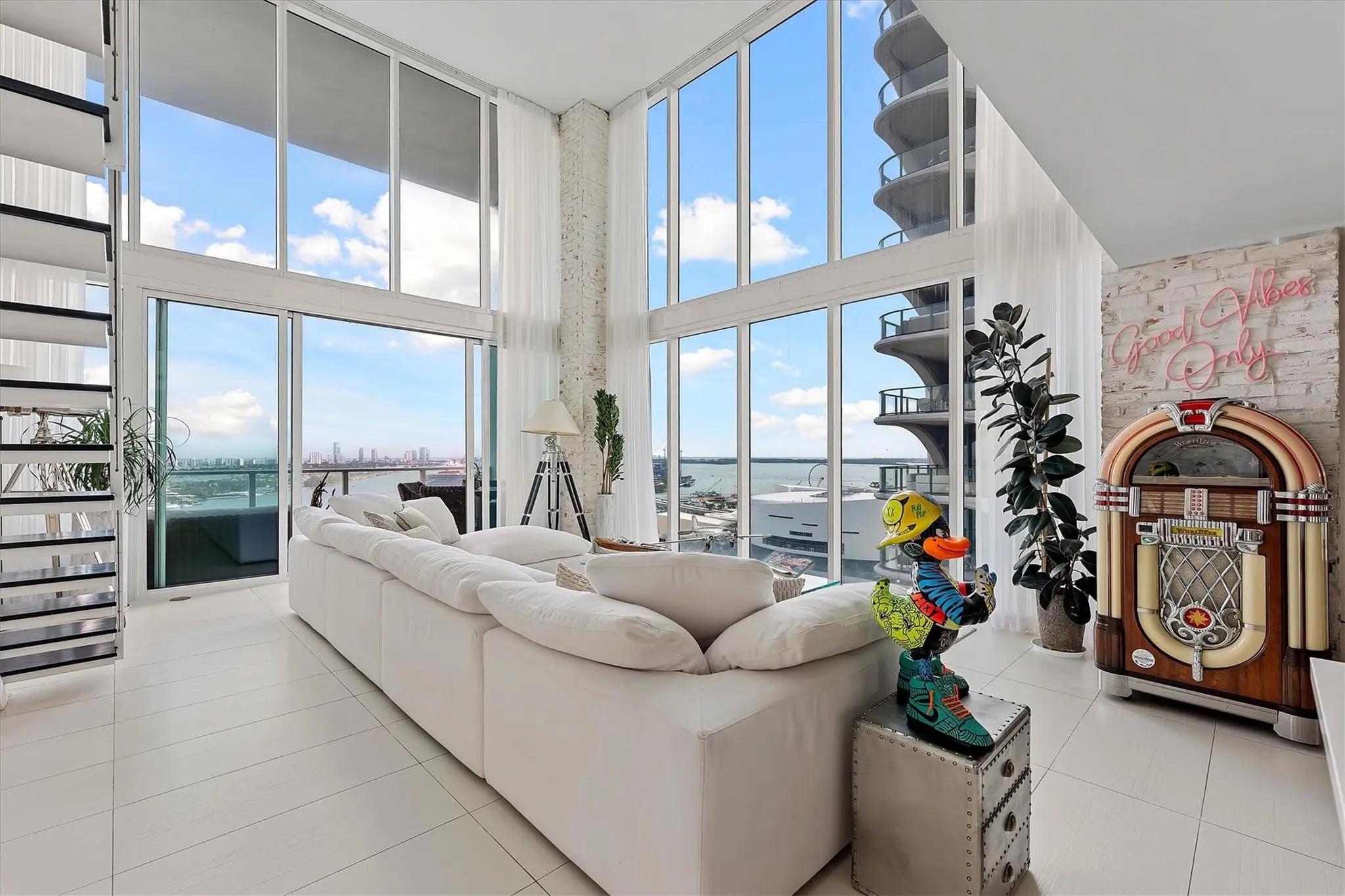 A true fortress in the sky. This fully furnished, oversized 2-bed loft at Ten Museum Park delivers 20-ft ceilings, iconic Restoration Hardware interiors, and one-of-a-kind statement pieces—including a vintage 1960s jukebox and gas-station pump accents. Floor-to-ceiling glass opens to a 10x20 balcony overlooking Maurice A. Ferré Park and front-row views of cruise ships entering and leaving the Port of Miami. The flexible second bedroom doubles as a media room with en-suite bath, privacy doors, and blackout shades. Primary suite features a newly renovated micro-cement shower. Boutique tower of just 200 well-connected residents with effortless access to I-95—15 minutes to MIA, Miami Beach, Brickell, Edgewater, the Grove, and Gables. Available now for a 12-month lease.