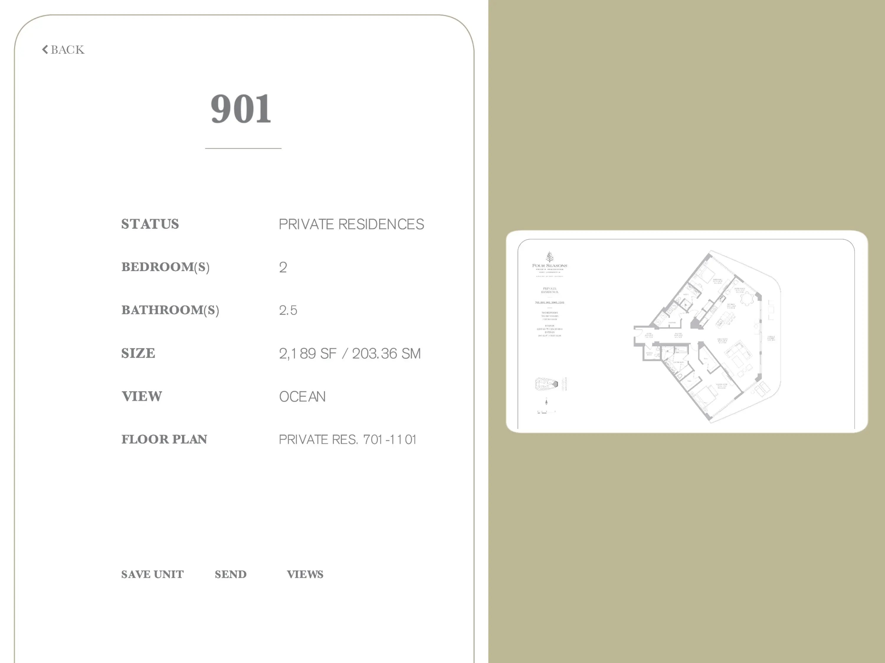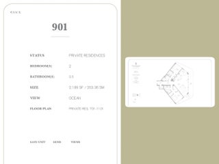 BRAND NEW FOUR SEASONS PRIVATE RESIDENCES, Ninth floor, private residence with 2 bedroom, 2 1/2 bath and a Direct east Oceanfront exposure with direct ocean views. Dramatic floor to ceiling glass and gracious open terraces afford you ample natural light throughout the home. Gourmet kitchen with custom lacquered cabinetry, Dornbracht faucets, Sub Zero, Miele, and Wolf appliances. Dual owners retreat configuration optimizes privacy between you and your guests. Abundant closet space throughout this luxury residence. Baths are adorned with signature marble, custom oak cabinetry, and brushed nickel Waterworks fittings. The oversized terrace extends the entire width of this luxury residence with access from main living area.