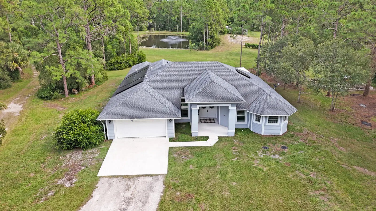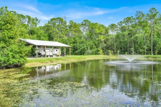 Modern elegance meets wide-open freedom, welcome to your private sanctuary! Nestled within the equestrian enclave of El Rancho Waite, this newer construction home rests on 5.44 acres of high and dry land along a paved road with NO HOA; offering the perfect balance of luxury and serenity. Every detail of this 4-bedroom, 3-bath home/PLUS A DEN was designed for both comfort and sophistication. This gem features impact windows and doors, plantation shutters, and tile flooring throughout creating a timeless aesthetic that's as durable as it is beautiful. The open, sunlit floor plan invites effortless flow from the stylish kitchen to the expansive living and dining spaces, while the split-bedroom layout provides privacy for the primary suite and ensuite with HUGE shower! At the heart of the home, the bright modern kitchen shines with upgraded stainless-steel appliances, 42-inch cabinetry complete with crown molding and quartz countertops. The design flows seamlessly making it ideal for gatherings, holidays, and everyday moments alike. Step outside and the possibilities unfold. A 60 × 40 pole barn stands ready; complete with a concrete pad, water, and 100-amp service, plus dual 50-amp utility hookups for added convenience. Whether you envision a future pool, guest house, RV hookups or the ultimate equestrian setup, this property offers the freedom to create it all. The possibilities are truly endless! The thoughtful upgrades continue with a reverse osmosis water system, a screened-in lanai, and a private pond equipped with a soothing fountain that turns every evening into a moment of calm! A new two-tier 16 kW solar system keeps energy costs low while adding an eco-conscious touch of innovation. Property has water and electric hookups on both north and south sides of the property along with private access service roads/driveways on both sides. This Loxahatchee gem has it all and is nestled just minutes from the vibrant City of Westlake! You'll enjoy easy access to top-rated schools, dining, shopping and fitness without ever sacrificing the peace and privacy of acreage living.