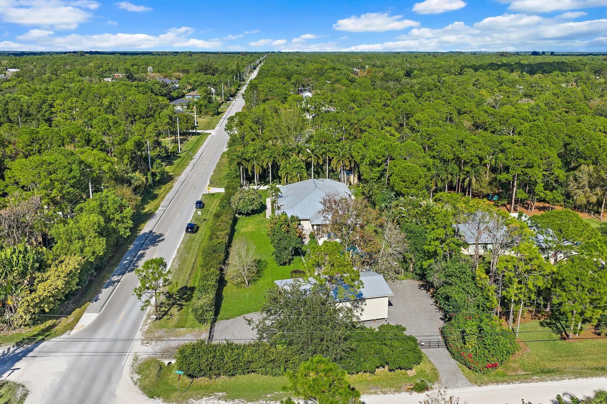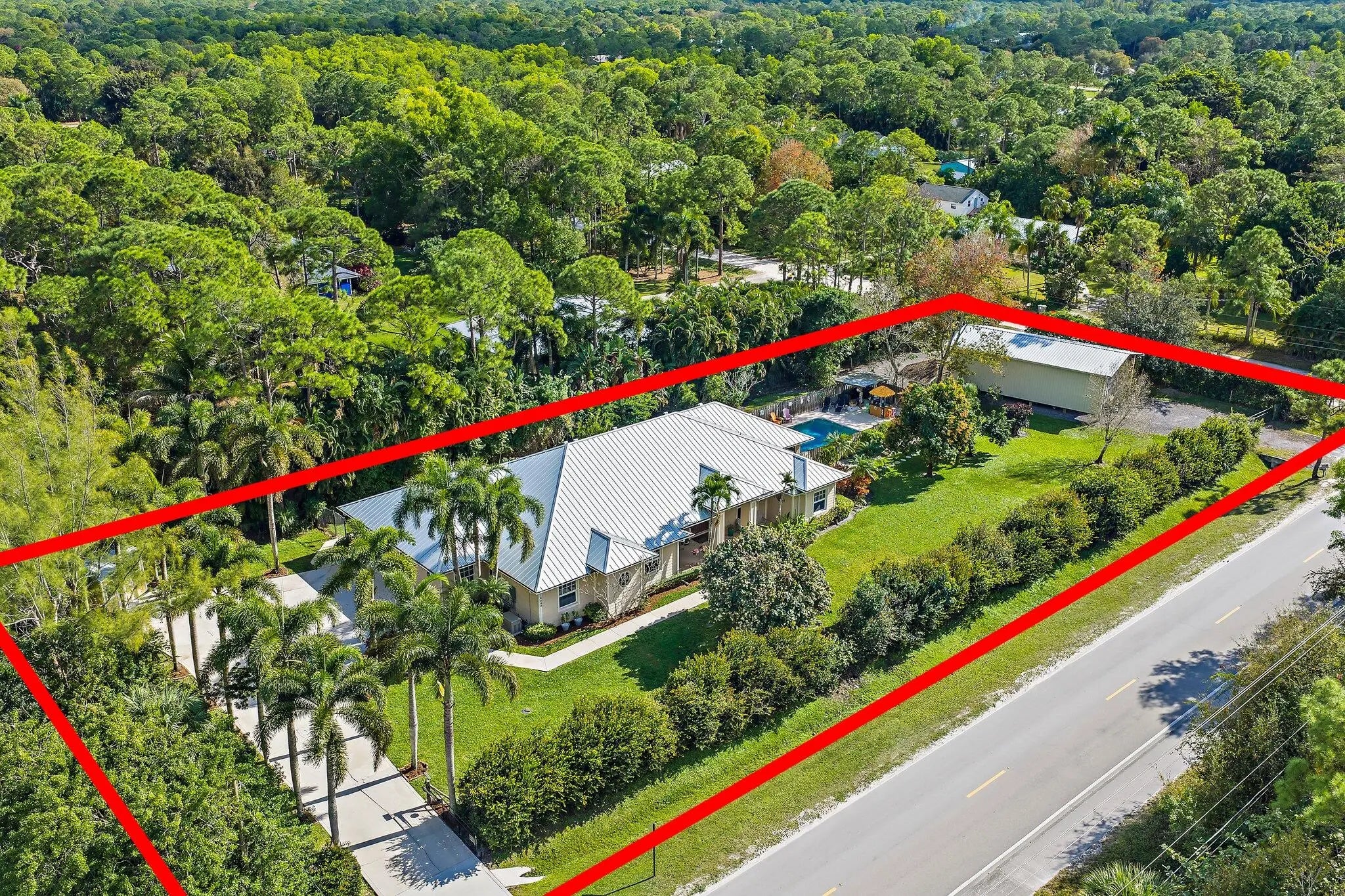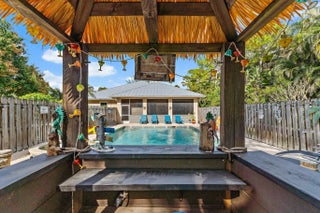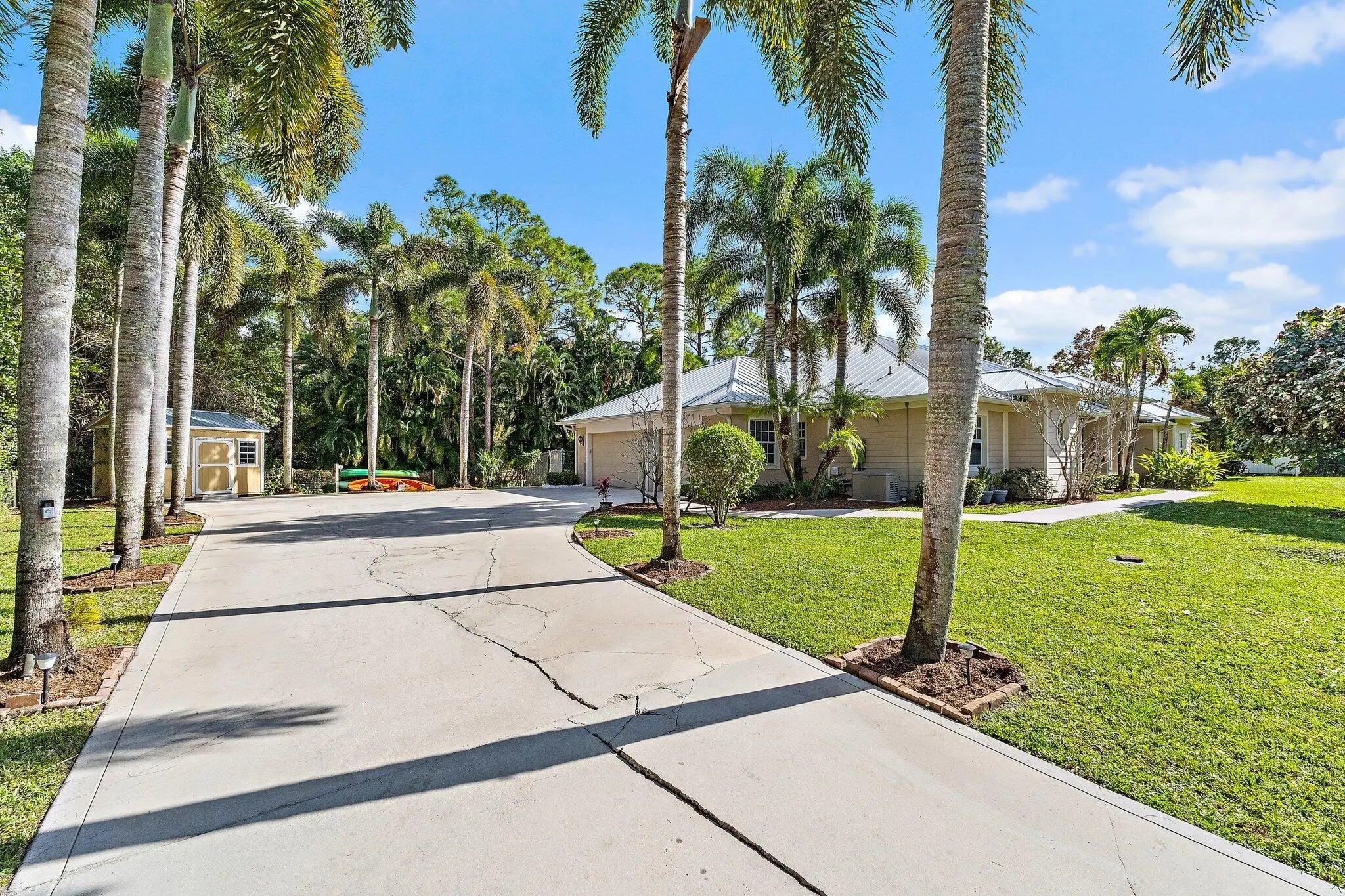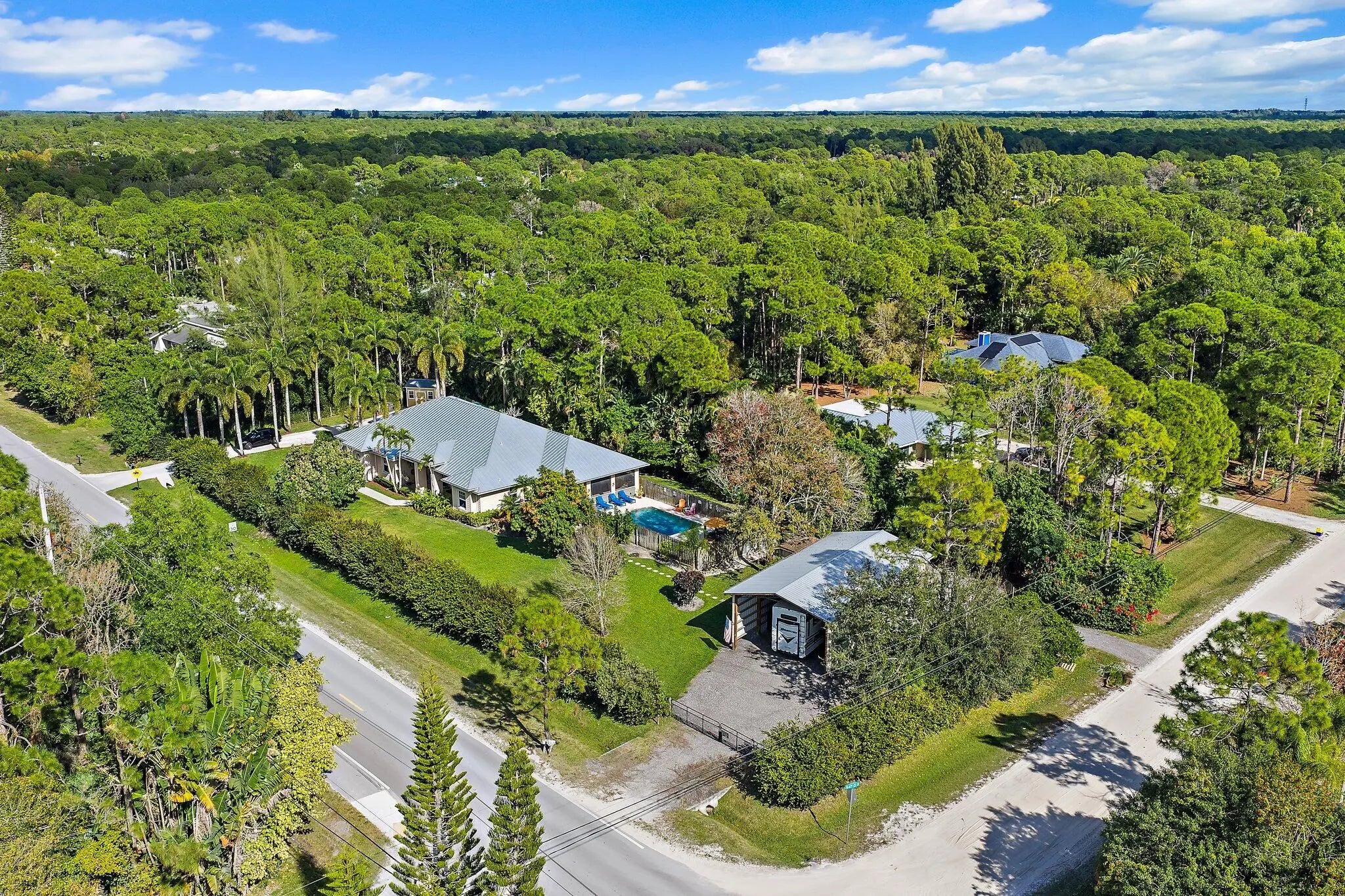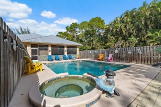 Built solid with concrete block construction, this Jupiter Farms pool home with a detached pole shed offers a rare blend of privacy, functionality, and comfort on just under an acre with no HOA. The well-designed floor plan features 12-foot ceilings, 4 bedrooms, 2.5 bathrooms, and a true split layout for added privacy. The large kitchen offers generous cabinet storage and prep space, flowing into the main living area and out to a screened-in patio ideal for year-round use. A heated saltwater pool highlights the backyard, complemented by new sod, fresh landscaping, and a full irrigation system with Wi-Fi control. The 48x25x16 pole shed, added in 2022, includes 50 amp RV service and 110/120V outlets, offering excellent flexibility for storage, equipment, or recreational use. A separate 10x12 she-shed, built in late 2022, is insulated and outfitted with a window A/C unit, making it ideal for hobbies, creative space, or a quiet retreat. Additional highlights include full impact windows and doors, a new roof (2022), new HVAC system, and a 2022 water heater. A buried 500-gallon propane tank powers the 26kW Kohler whole house generator, providing backup security and peace of mind. The pool heater is electric. Situated on a paved corner lot and fully fenced, the property allows room for RVs, boats, or future expansion. With a strong foundation and valuable systems in place, this home offers long-term potential in one of Jupiter's most desirable acreage neighborhoods.