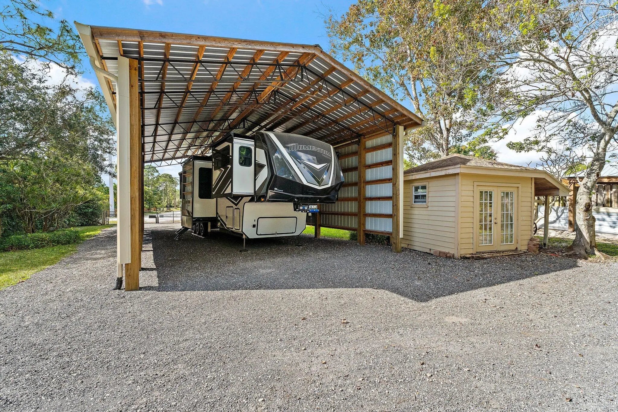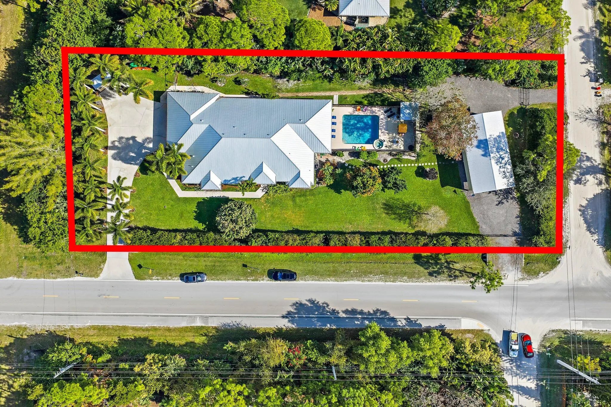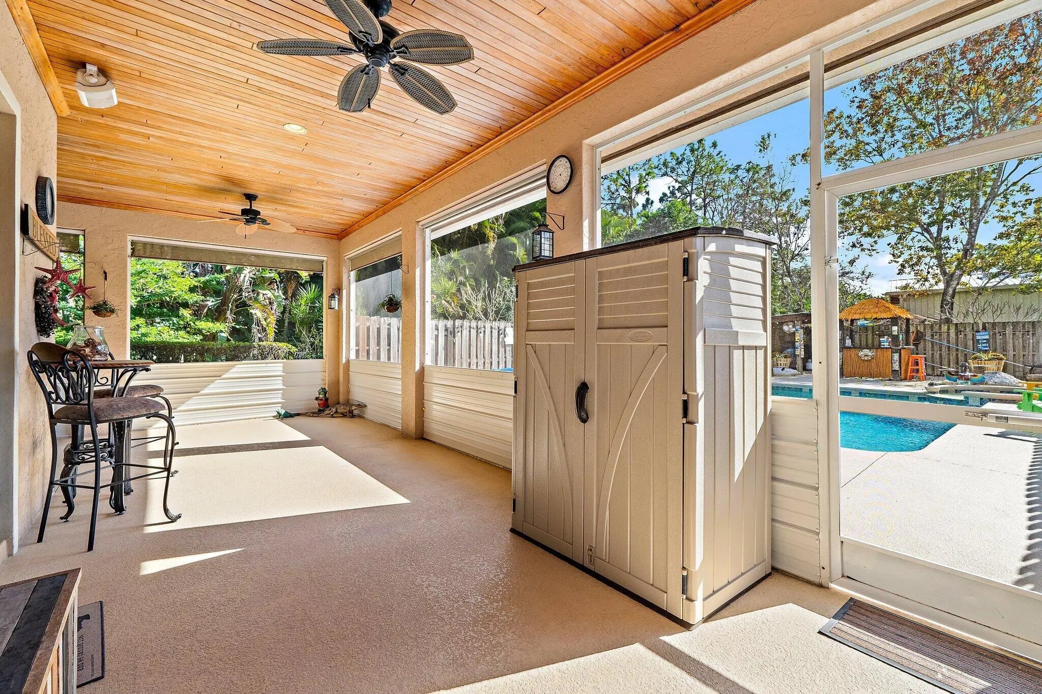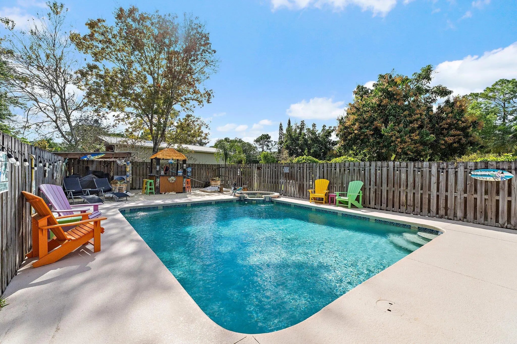 Built solid with concrete block construction, this Jupiter Farms pool home with a detached pole shed offers a rare blend of privacy, functionality, and comfort on just under an acre with no HOA. The well-designed floor plan features 12-foot ceilings, 4 bedrooms, 2.5 bathrooms, and a true split layout for added privacy. The large kitchen offers generous cabinet storage and prep space, flowing into the main living area and out to a screened-in patio ideal for year-round use. A heated saltwater pool highlights the backyard, complemented by new sod, fresh landscaping, and a full irrigation system with Wi-Fi control. The 48x25x16 pole shed, added in 2022, includes 50 amp RV service and 110/120V outlets, offering excellent flexibility for storage, equipment, or recreational use. A separate 10x12 she-shed, built in late 2022, is insulated and outfitted with a window A/C unit, making it ideal for hobbies, creative space, or a quiet retreat. Additional highlights include full impact windows and doors, a new roof (2022), new HVAC system, and a 2022 water heater. A buried 500-gallon propane tank powers the 26kW Kohler whole house generator, providing backup security and peace of mind. The pool heater is electric. Situated on a paved corner lot and fully fenced, the property allows room for RVs, boats, or future expansion. With a strong foundation and valuable systems in place, this home offers long-term potential in one of Jupiter's most desirable acreage neighborhoods.
