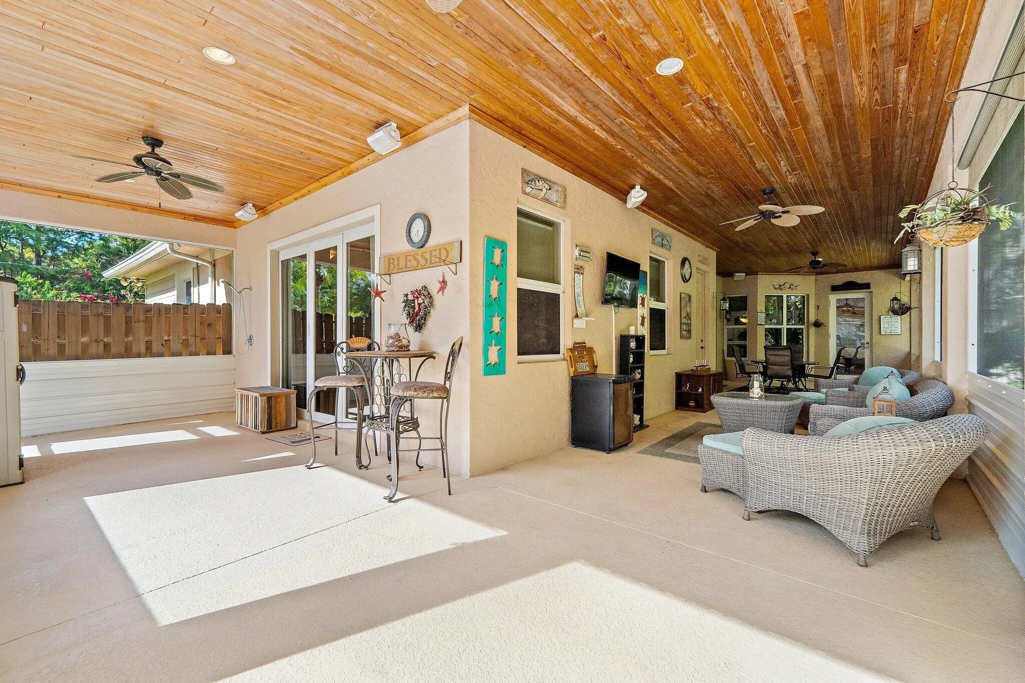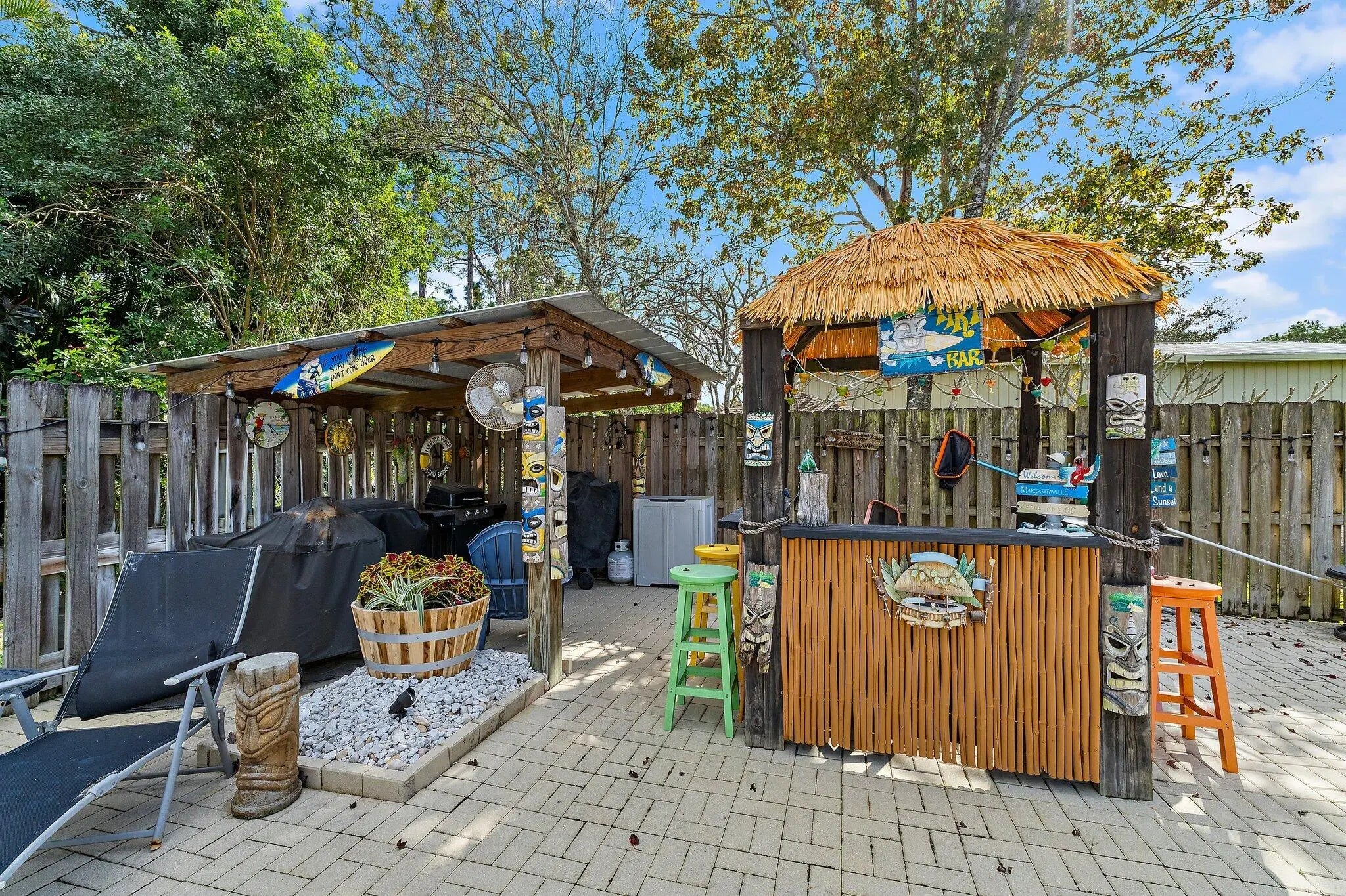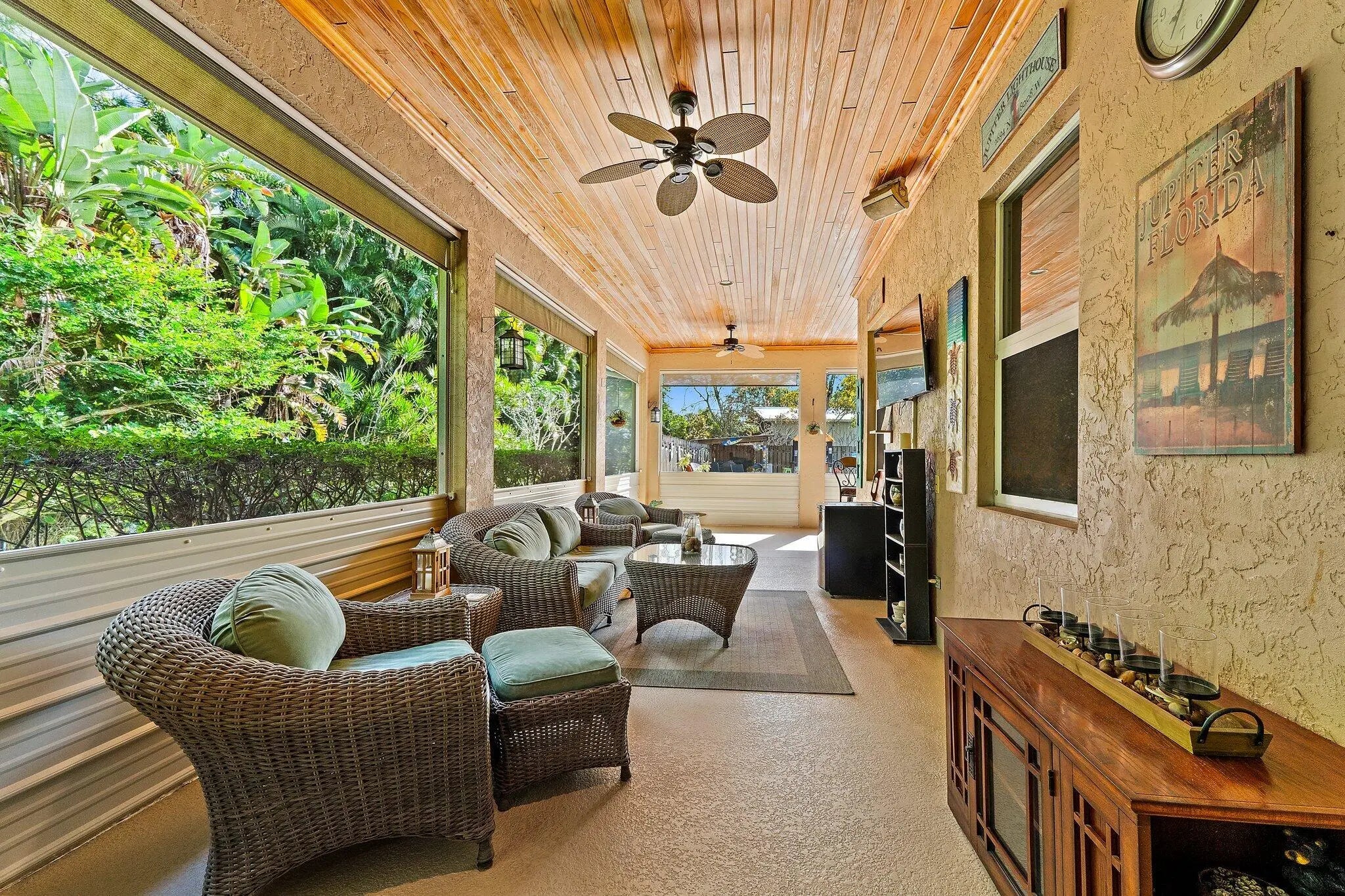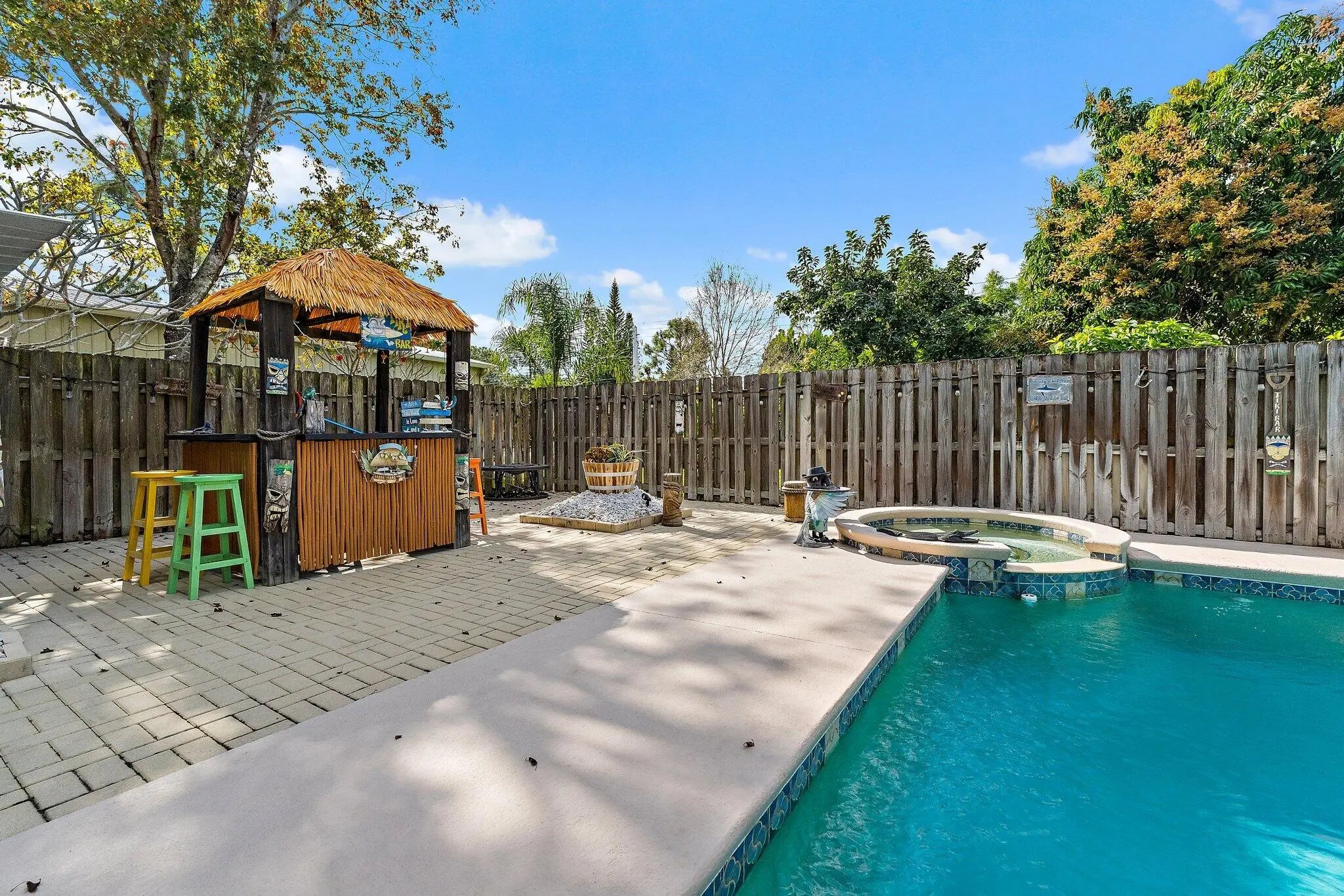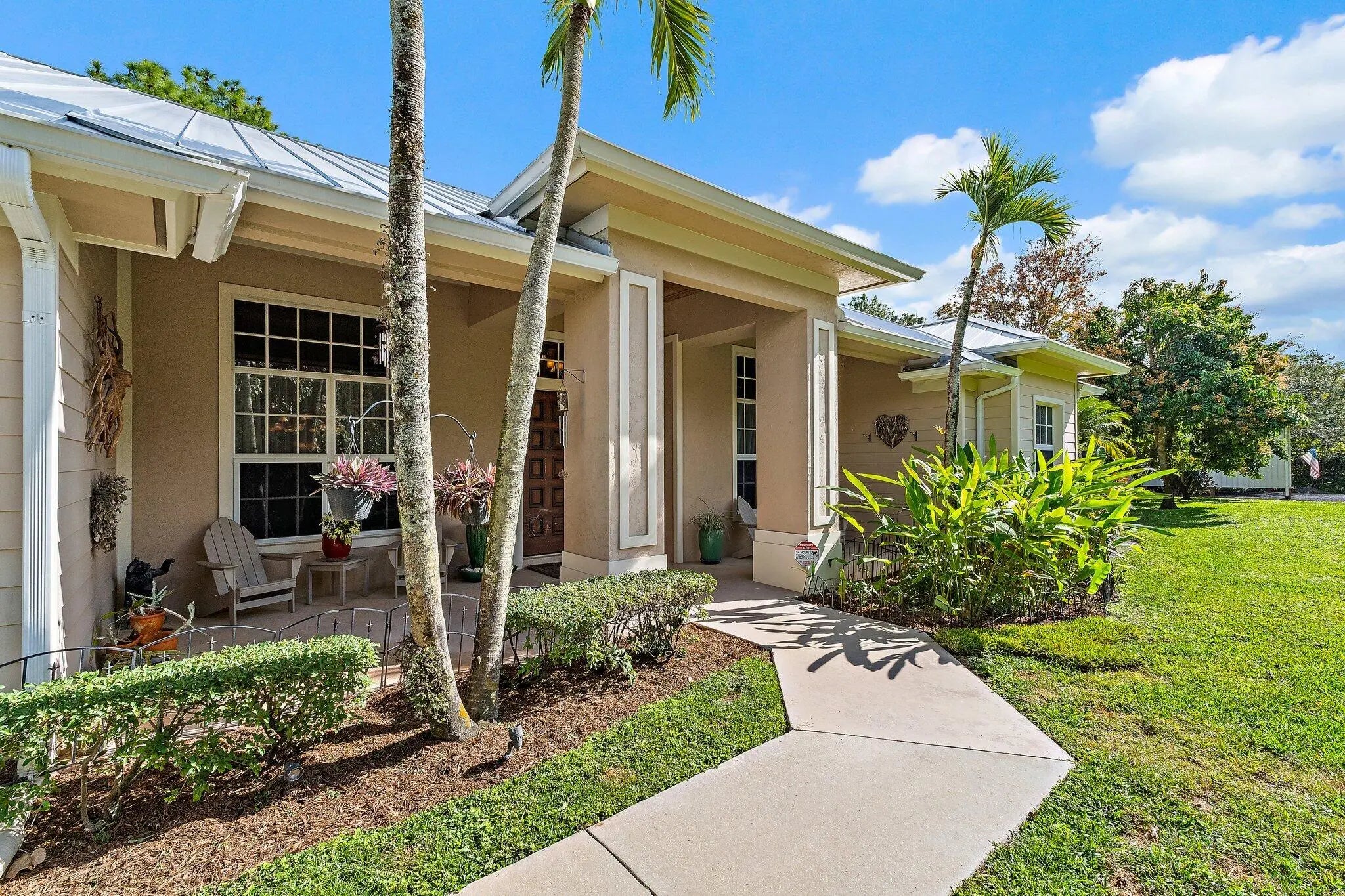 Built solid with concrete block construction, this Jupiter Farms pool home with a detached pole shed offers a rare blend of privacy, functionality, and comfort on just under an acre with no HOA. The well-designed floor plan features 12-foot ceilings, 4 bedrooms, 2.5 bathrooms, and a true split layout for added privacy. The large kitchen offers generous cabinet storage and prep space, flowing into the main living area and out to a screened-in patio ideal for year-round use. A heated saltwater pool highlights the backyard, complemented by new sod, fresh landscaping, and a full irrigation system with Wi-Fi control. The 48x25x16 pole shed, added in 2022, includes 50 amp RV service and 110/120V outlets, offering excellent flexibility for storage, equipment, or recreational use. A separate 10x12 she-shed, built in late 2022, is insulated and outfitted with a window A/C unit, making it ideal for hobbies, creative space, or a quiet retreat. Additional highlights include full impact windows and doors, a new roof (2022), new HVAC system, and a 2022 water heater. A buried 500-gallon propane tank powers the 26kW Kohler whole house generator, providing backup security and peace of mind. The pool heater is electric. Situated on a paved corner lot and fully fenced, the property allows room for RVs, boats, or future expansion. With a strong foundation and valuable systems in place, this home offers long-term potential in one of Jupiter's most desirable acreage neighborhoods.