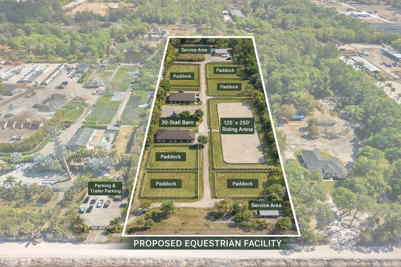 Computer generated possible equestrian facilities. Situated on a sprawling 7.08-acre parcel, this unique property features a charming rustic 3-bedroom, 2-bath single-family home designed with an open-concept layout that promotes comfortable, relaxed living. The setting offers a rare blend of privacy and space while maintaining unbeatable proximity to the city. Ideally located in Palm Beach County, you'll enjoy quick access to top destinations, including hospitals, shopping, dining, and Palm Beach International Airport. Equestrian enthusiasts will appreciate being just minutes from the renowned International Polo Club Palm Beach and the area's premier polo and riding facilities--truly the best of both worlds. and Palm Beach International Airport, the location offers both accessibility and exclusivity. For equestrian enthusiasts, this property is especially compelling--just minutes from the renowned International Polo Club Palm Beach and world-class polo and riding facilities. With ample acreage to develop barns, paddocks, arenas, or a custom equestrian estate, the possibilities are truly exceptional. The road A Road is undergoing a widening and paving upgrade. This is definitely a rare offering that combines location (3rd lot from Okeechoobee Blvd) land, and limitless potential--this is an opportunity not to be missed.