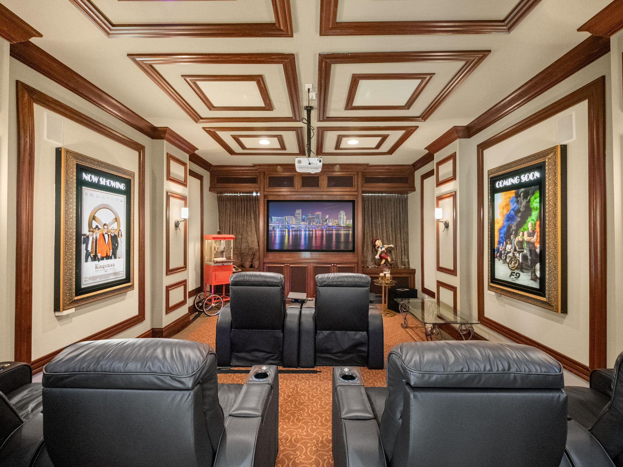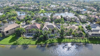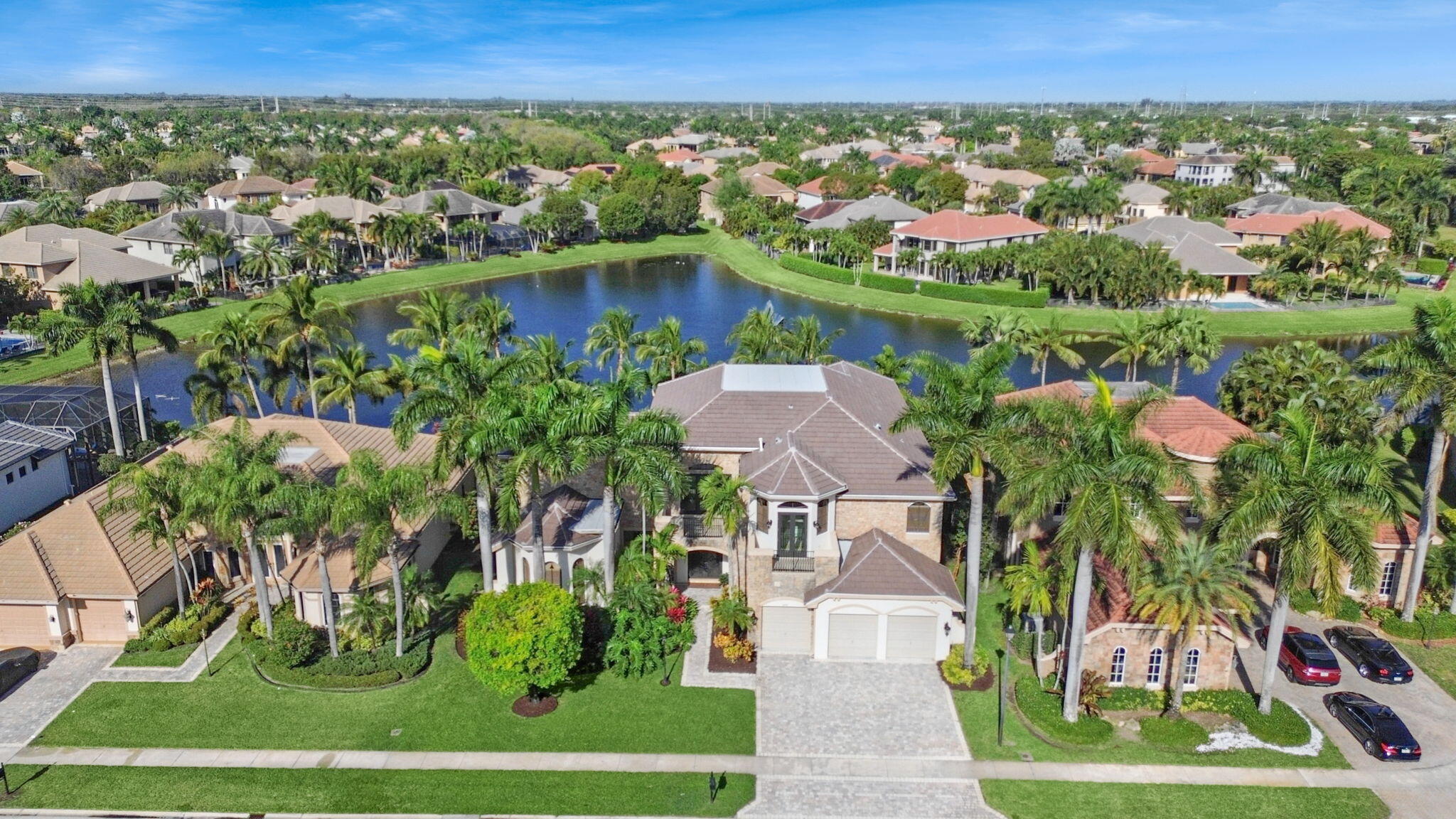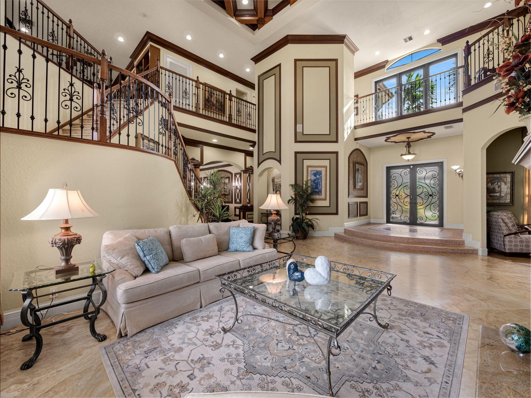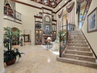 Magnificent former builder's model in Wellington's upscale Versailles sits on a breathtaking lakefront lot with an infinity-edge heated saltwater pool and spa ,travertine tile patio, outdoor kitchen and mango trees. Offering 5 bedrooms 6 1/2 baths and a 3 car garage, this Marseilles model also includes an executive office/library a theater and a spacious loft. Dramatic soaring 23 foot coffered ceilings and the French inspired architectural designs, stately columns, beautified walls, saturnia marble floors, multiple inlaid mosaic insets and diverse custom ceilings, accentuate the uniqueness of this estate home. In 2024,the roof was replaced, complete water filtration system was installed as was LVP flooring in the bedrooms and loft. In 2023 impact doors were installed and a whole housegenerator the year before. Three air conditioners have been replaced . There is a gas fireplace in the living room, wired speakers throughout the house, incredible built in cabinets in several rooms, as well as crown and picture frame moldings. Ground level grand primary suite has a sitting area, extravagant his and hers separate bathrooms, built in wall units, and 2 walk-in outfitted closets."Her" primary bath offers a retreat into refined elegance with its dual vanities, Roman tub, glass enclosed shower, and water closet with bidet. An executive office with wood floors and bookcases and a guest suite are also on the first floor. Gourmet dream kitchen replete with custom 42" wood cabinetry, granite counters and an oversized center island, includes double wall ovens, gas range, and warming tray. Palatial windows in the primary, formal living, and family room bring in abundant light while providing spectacular views of the pool and lake. Designer finishes throughout, light fixtures, accessories, draperies, and a picturesque granite curved staircase with opulent metal railings. Two balconies adorn the front of this masterpiece with its pristine paver driveway leading to the spacious 3 car driveway and to the custom front double doors. They open into the elegant foyer with its mosaic inlay and steps to the stunning living room, luxurious formal dining room, amazing kitchen, impressive family room, stylish powder room, and laundry room complete with a sink and cabinets. As we ascend the majestic staircase to the upstairs loft embellished with its own sizeable wall unit, our journey is far from over. On this 2nd level we have 2 ensuite themed guest bedrooms and another with a full bath opposite, intended to also accommodate guests at the astonishing theater (media room)with fantastic seating and movie goers' delights. The builder spared no expense in creating this masterpiece. It can be purchased with its lavish furniture and accessories, completely ready for the discerning buyer to appreciate. This gem exists in this private neighborhood on a cul de sac block, walking distance from Club Versailles with its clubhouse, heated pool and spa, fitness center, lighted tennis courts, cabana, billiards, picnic area, playground, and more. Versailles of Wellington's impressive gated entry with gazebos, fountains, and lush foliage, provides a 24 hour manned gate and security patrols. Included in the reasonable HOA fee is cable, internet, alarm monitoring, front and rear landscaping, an onsite manager, and the use of the community amenities. This highly prestigious neighborhood is in the heart of Wellington's A-rated schools, polo and other equestrian activities, shopping, great restaurants and medical facilities, as well as close to Starbuck's, Trader Joe's, Whole Foods and Wellington Green Mall. Convenient access to highways, the airport, beaches, culture, and everything else that Palm Beach County has to offer. Welcome to Paradise !
