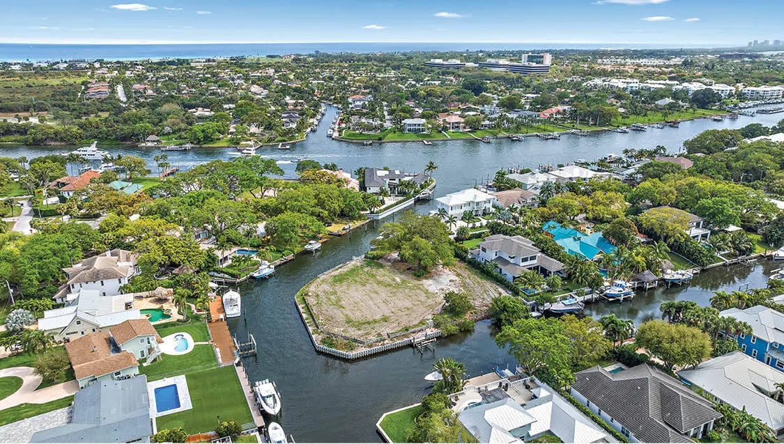 Located just off the Intracoastal this acre + vacant lot offers a safe harbour with 400' of frontage, NEW sea wall, two docks & an 8,000lb boat lift. Build your oversized dream home here, zoning allows for a 20,000 sq ft + estate.Plans available to build home in renderings.
