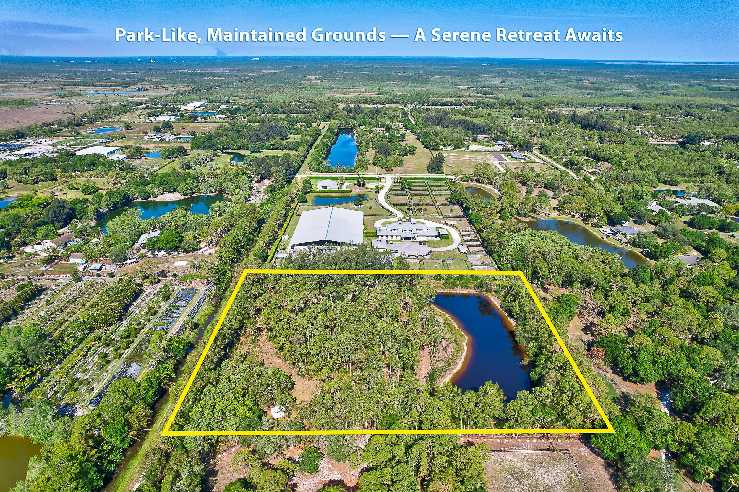 Located in one of the most desirable sections of Jupiter Farms, this park-like, well-maintained 5.18-acre property offers an exceptional opportunity to build your dream compound in a setting known for its larger, more private homesteads. The high and dry grounds are regularly bush-hogged and feature a scenic pond that adds both character and useful water retention.Next to a luxury equestrian facility and just down the road from a European-style nursery garden with a boutique shop and cafe, the location blends rural living with refined surroundings.Site design plans, architectural floor plan, and elevation drawings are available to expedite your build. The property is fully fenced with cleared underbrush and FPL underground utilities ready for hookup. The driveway can be paved from