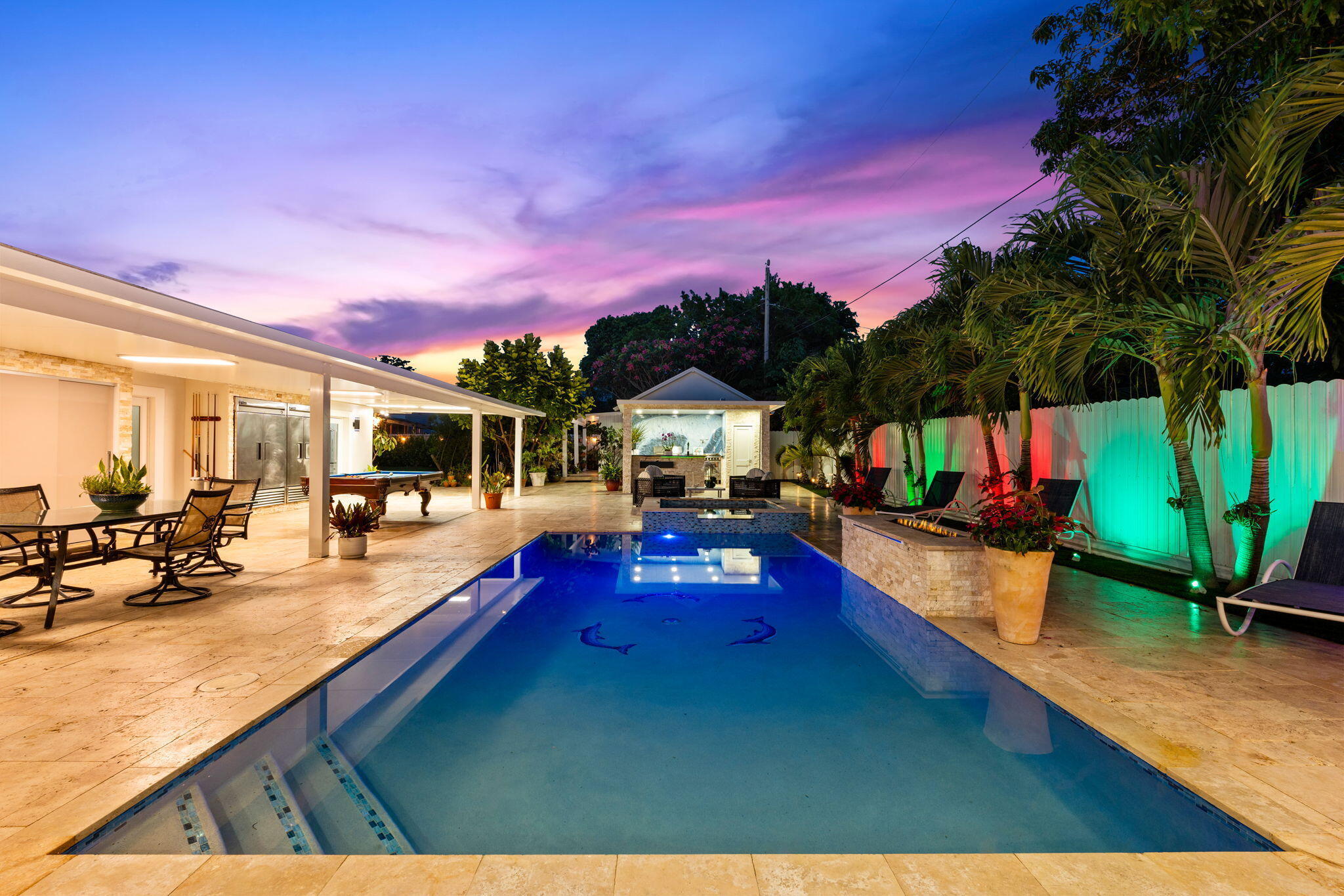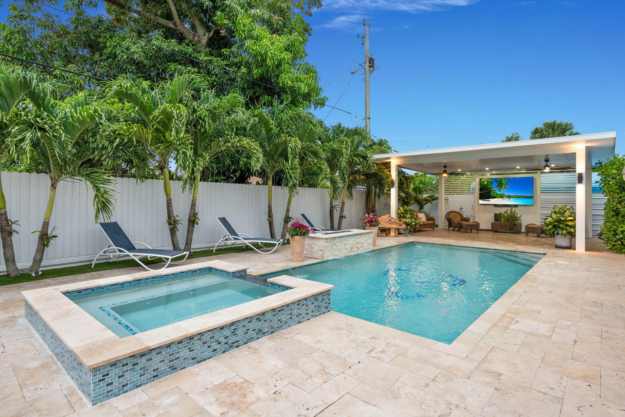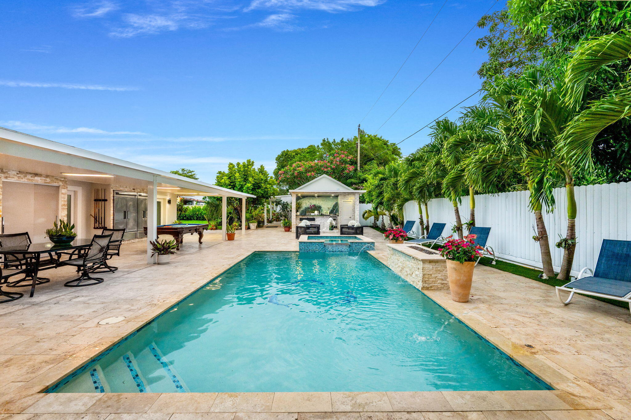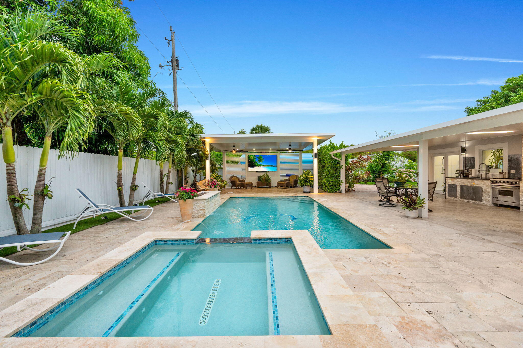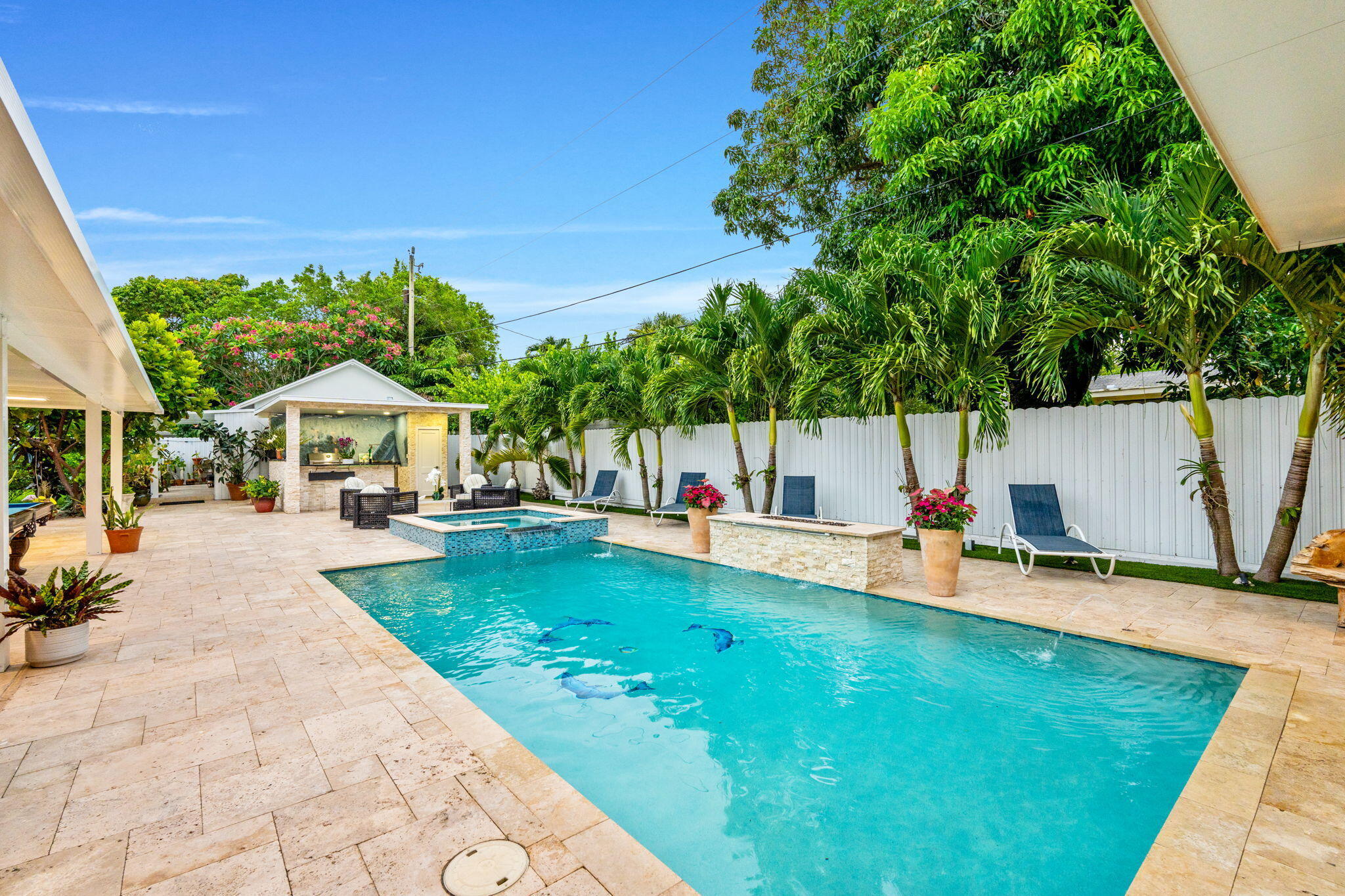 Price Improvement! Step into your own private paradise with this exquisitely renovated 5-bedroom, 4.5-bathroom home including a ''Casita'' in the back. This property is perfectly situated on a rare TRIPLE LOT just under HALF an ACRE. Featuring approximately 2,700 sqft of living space, this custom-designed property was completely renovated late 2020 with top-quality finishes, impact windows and doors, and high-end details throughout. The main home offers a bright open layout with porcelain tile floors, a stunning chef's kitchen with sleek waterfall-edge quartz countertops, custom cabinetry, and premium stainless steel appliances -- one of three fully equipped gas kitchens on the property.The outdoor space is a true resort-style retreat, boasting a sparkling pool, spa, covered lounge with ceiling fans and TV, and a built-in summer kitchen with commercial-grade appliances and bar seating. The lush, fully fenced yard is lined with tropical landscaping and multiple fruit trees. The separate guest cottage or "Casita" with private entrance and a kitchenette offers excellent income potential as an Airbnb or the perfect space for in-laws.This one-of-a-kind home combines modern luxury, income potential, and unbeatable location in a booming neighborhood. Located just 5 minutes to Downtown West Palm Beach and PBI Airport.