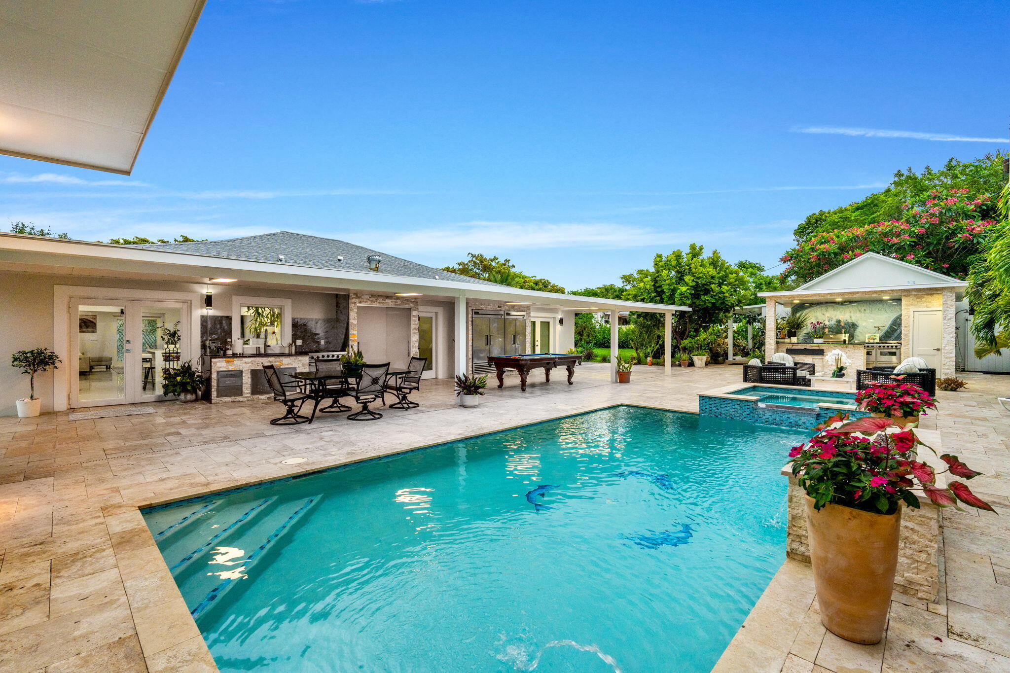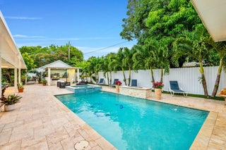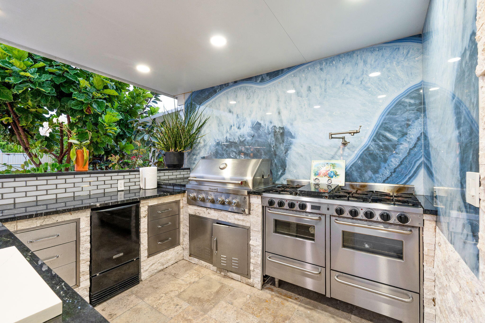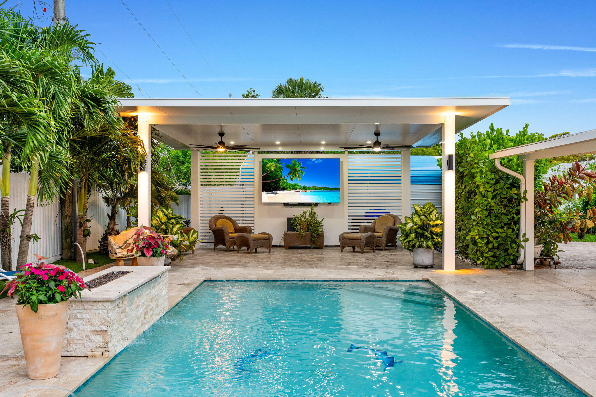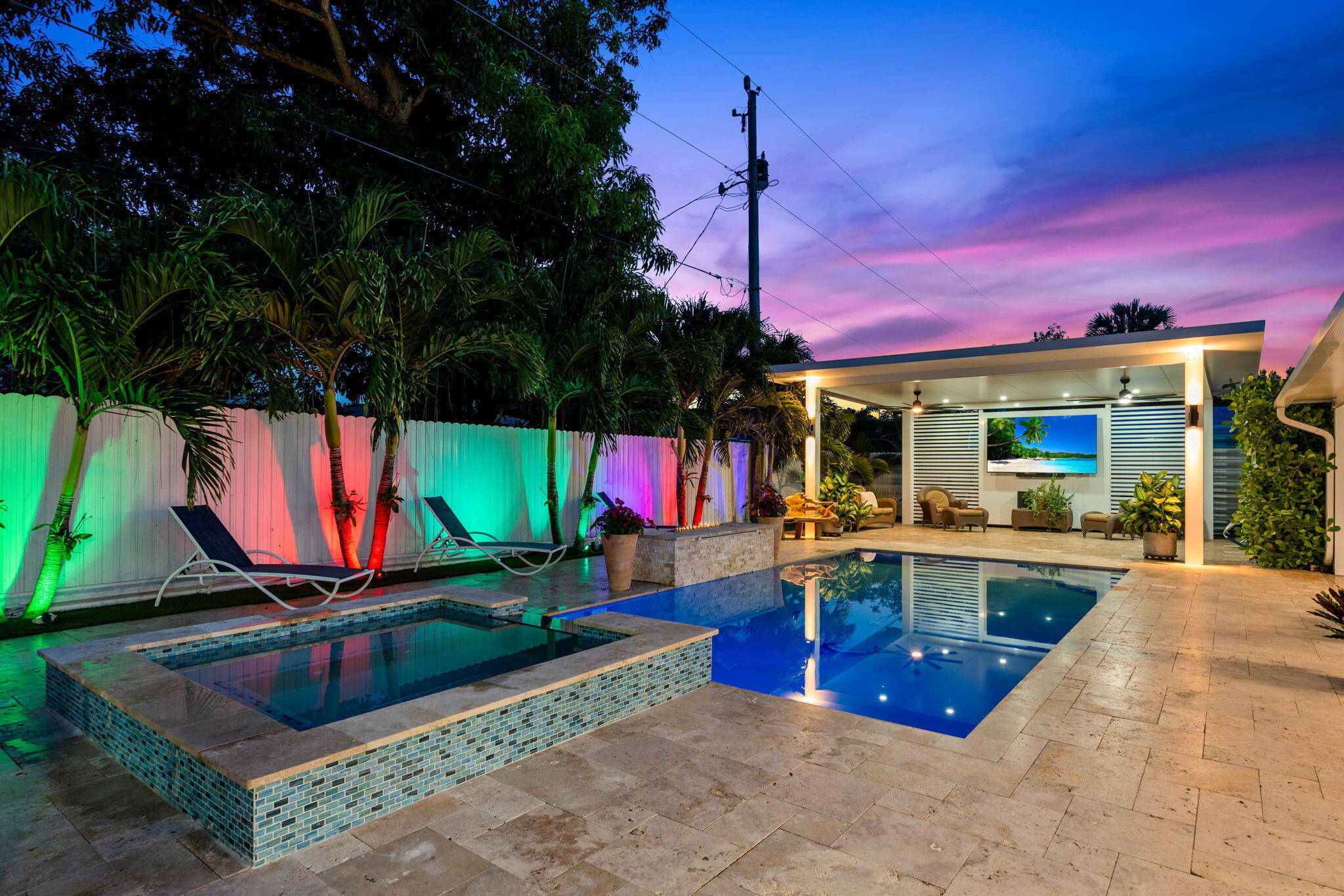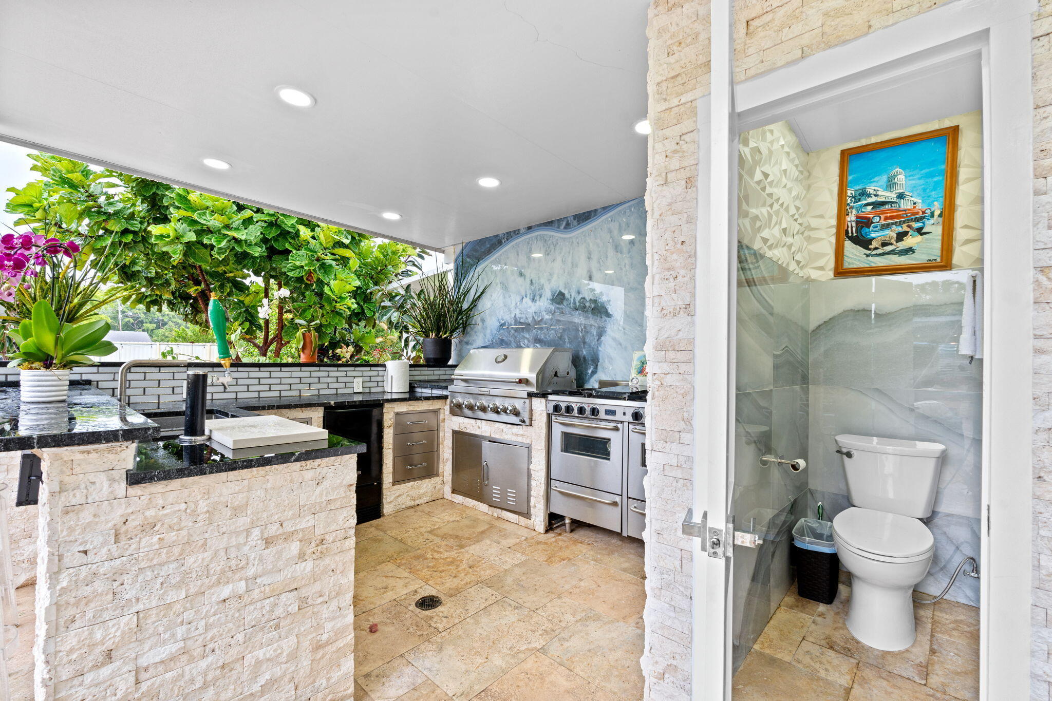 Price Improvement! Step into your own private paradise with this exquisitely renovated 5-bedroom, 4.5-bathroom home including a ''Casita'' in the back. This property is perfectly situated on a rare TRIPLE LOT just under HALF an ACRE. Featuring approximately 2,700 sqft of living space, this custom-designed property was completely renovated late 2020 with top-quality finishes, impact windows and doors, and high-end details throughout. The main home offers a bright open layout with porcelain tile floors, a stunning chef's kitchen with sleek waterfall-edge quartz countertops, custom cabinetry, and premium stainless steel appliances -- one of three fully equipped gas kitchens on the property.The outdoor space is a true resort-style retreat, boasting a sparkling pool, spa, covered lounge with ceiling fans and TV, and a built-in summer kitchen with commercial-grade appliances and bar seating. The lush, fully fenced yard is lined with tropical landscaping and multiple fruit trees. The separate guest cottage or "Casita" with private entrance and a kitchenette offers excellent income potential as an Airbnb or the perfect space for in-laws.This one-of-a-kind home combines modern luxury, income potential, and unbeatable location in a booming neighborhood. Located just 5 minutes to Downtown West Palm Beach and PBI Airport.