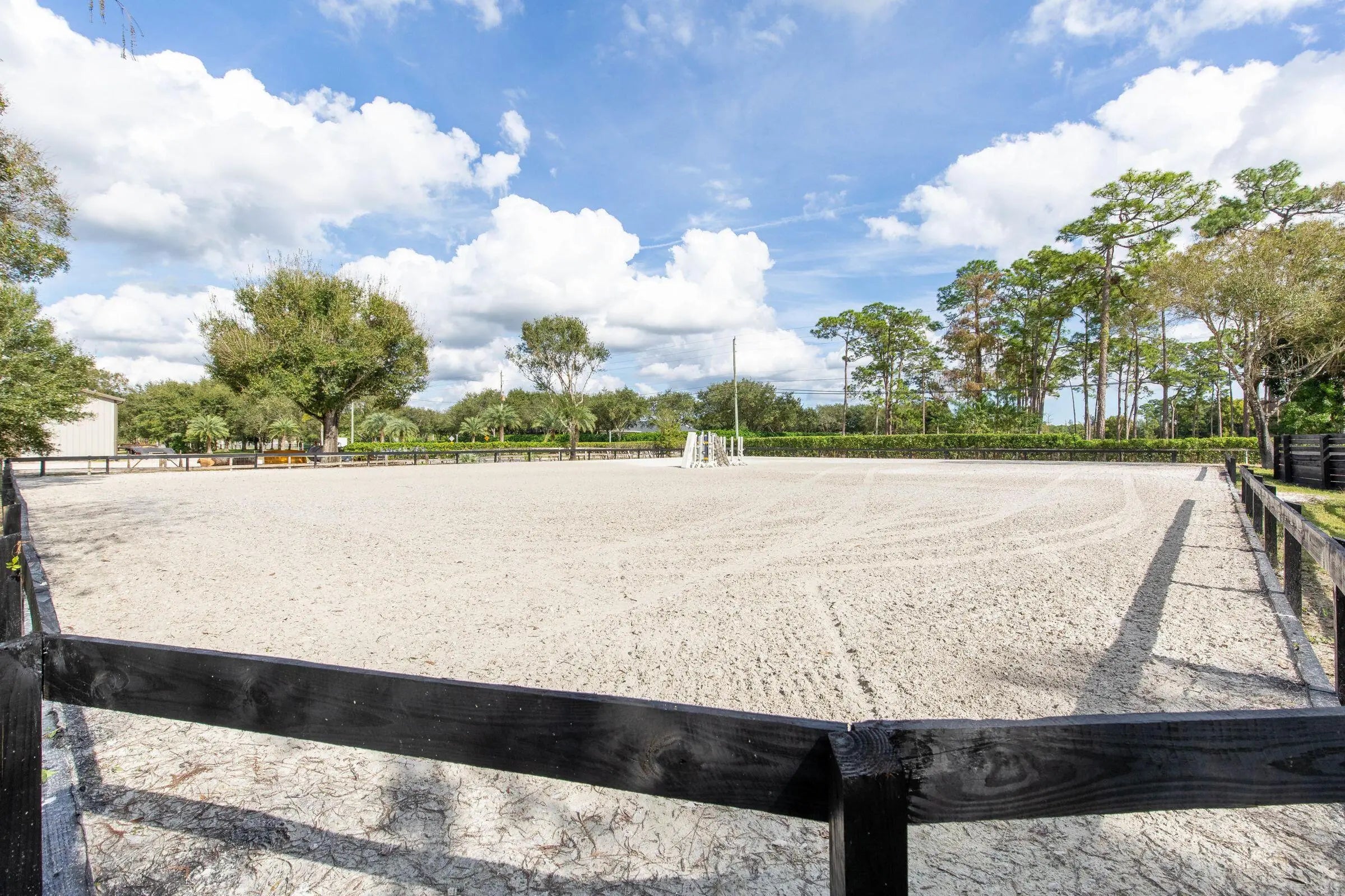 This serene equestrian farm has an amazing location just across Southern Blvd on a paved road and is only about a 10 minute drive to WEF. The house has its own private gate & driveway, and includes 3bdr/2bath with an additional 4th bedroom added in the garage (can easily be converted back). Fully furnished with a fenced in backyard for your 4 legged friends! There is one 6-stall barn and one 10-stall barn, an all-weather 150 x 120 ft GGT arena (bigger arena at neighbors might be available for an additional cost), a 60' round pen and 5 grass paddocks. Treadmill shed, 5 wash racks, two RV hook-ups, separate storage for hay & shavings and plenty of space for parking.