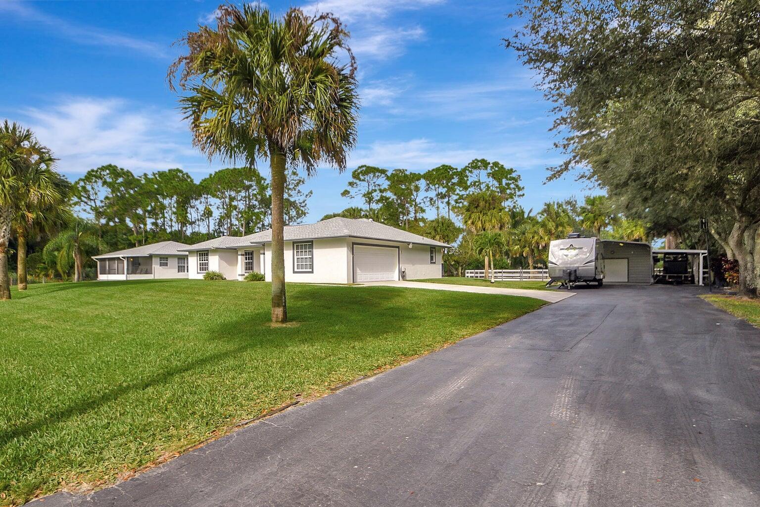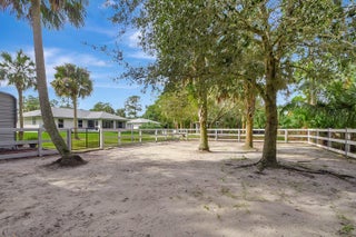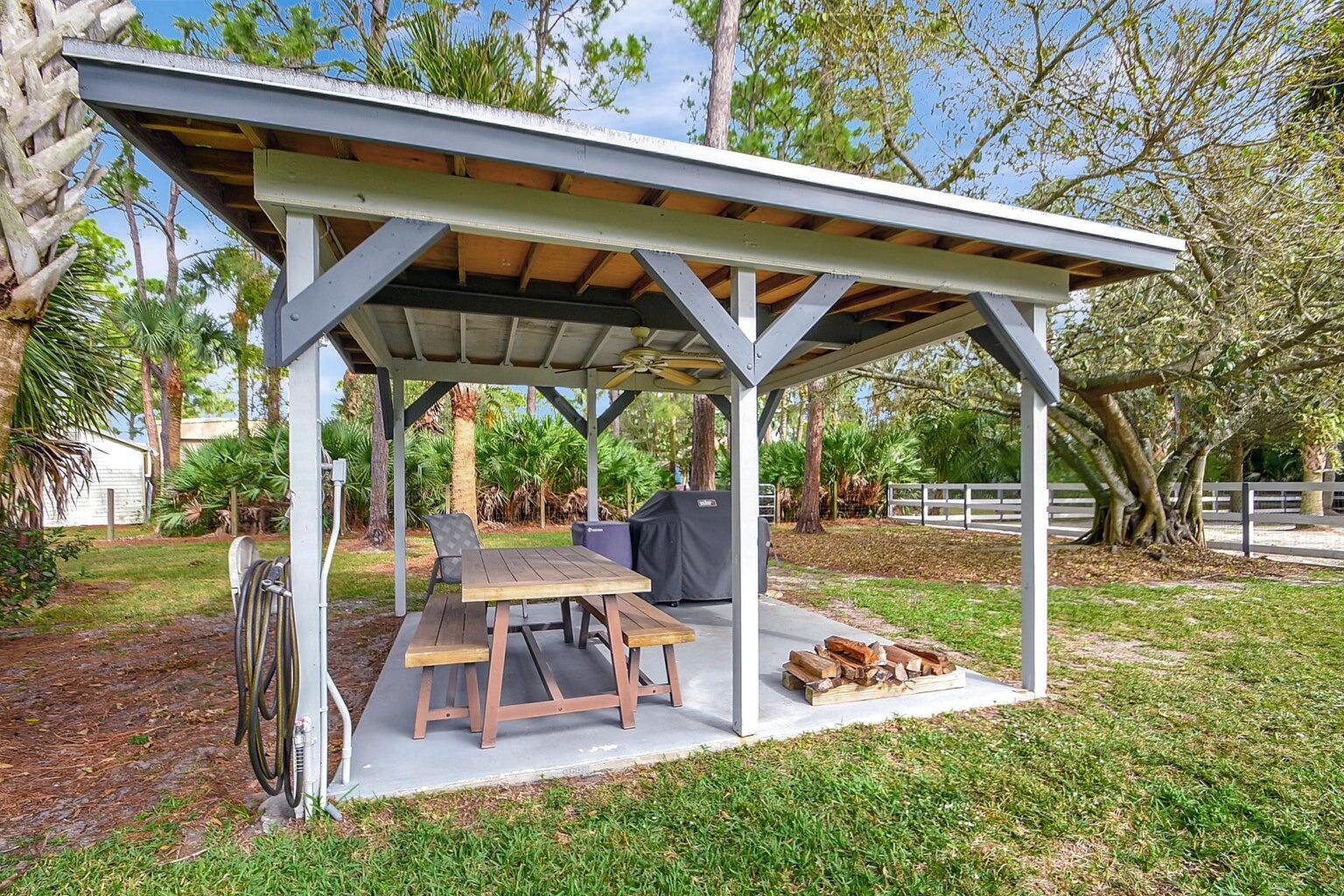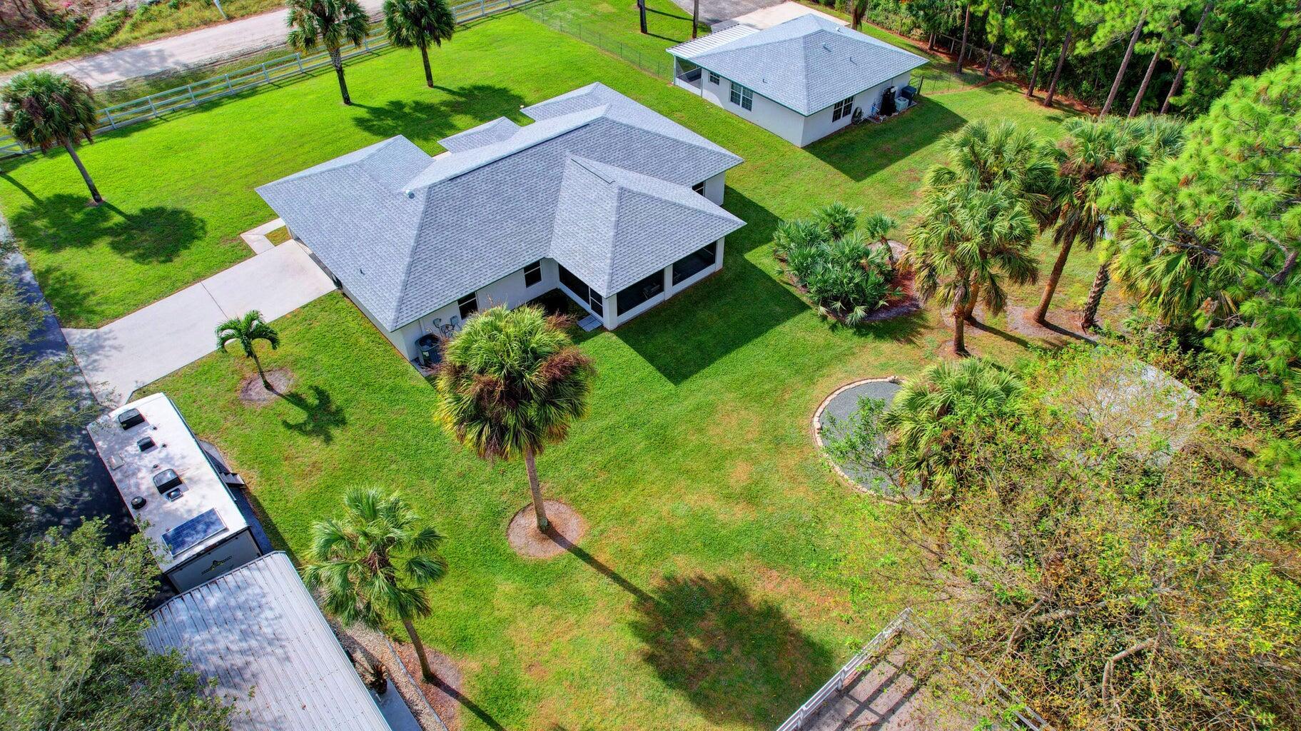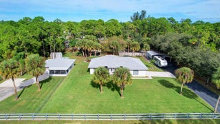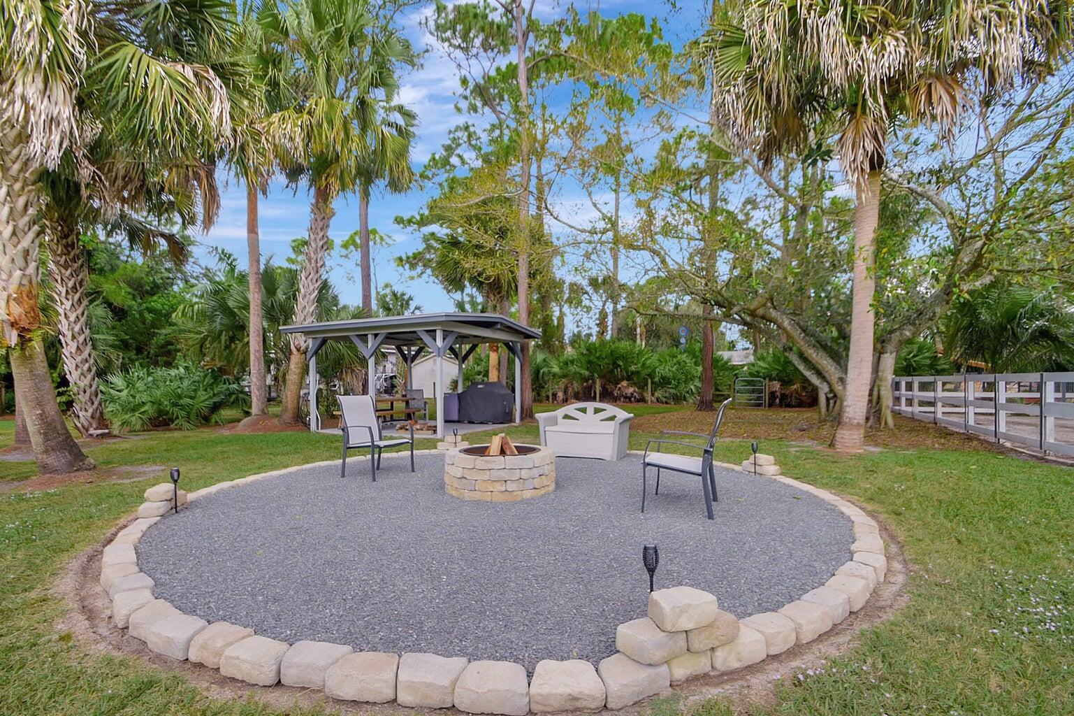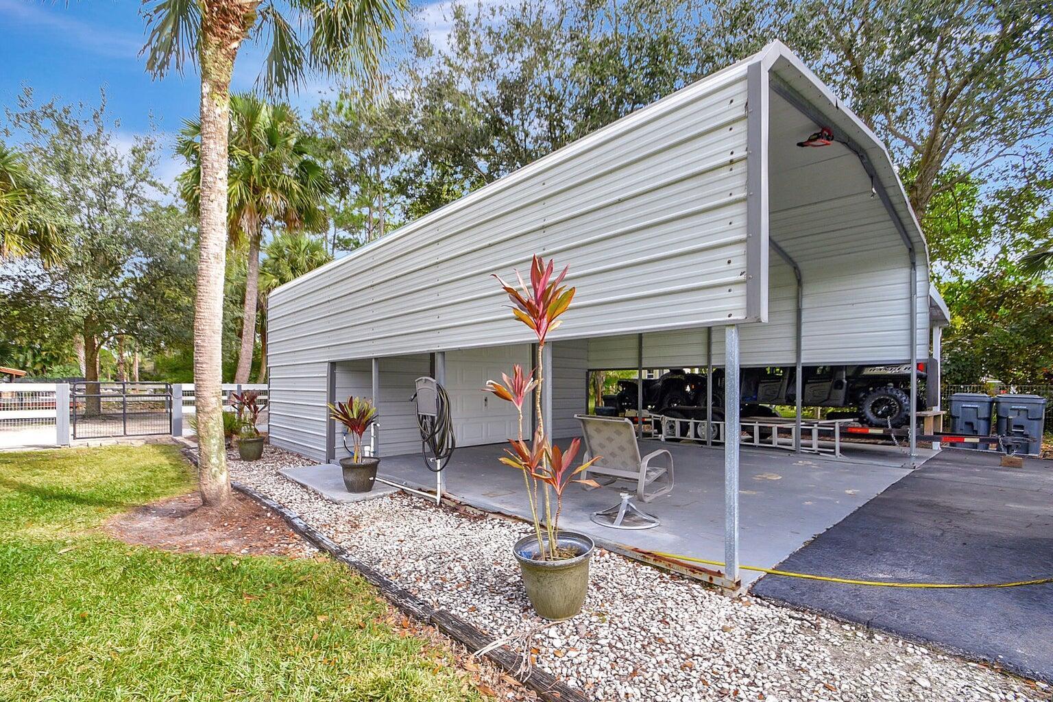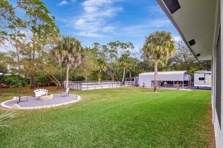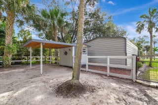 Welcome to this meticulously maintained multi-structure estate offering the perfect combination of comfort, privacy, and functionality. Set behind two separate solar-powered gated driveways, the fully fenced, high-and-dry property features an automatic irrigation system and a thoughtfully designed layout ideal for everyday living, entertaining, and multi-generational use. Outdoor amenities include a 3,400 sq ft fenced corral with a separate tack room, complete with electric and water, a custom fire pit lined with firebrick over a lava rock base and surrounded by crushed granite and weed barrier, and a 20' x 30' warehouse with carport, built-in shelving, workbench, water, stained concrete floors, and a 30-amp RV hookup. New roofs were installed in 2023 on the main house, guest house andgazebo. Additional highlights include a storage shed with electricity, two professionally maintained well systems (one for the main and guest house with a peroxide filtration system, and a separate irrigation system), full hurricane shutters for both residences, and hurricane-rated front and garage doors. The 3-bedroom, 2-bath main house offers an updated and spacious interior with modern upgrades throughout. A 2023 roof, epoxy-coated garage floor, custom rod holders, and electric opener enhance the oversized two-car side-entry garage. Inside, vaulted ceilings in the living room and primary suite elevate the space, while upgraded 5 ¾" baseboards and diagonally installed Aquaguard Salerno waterproof laminate flooring provide durability and elegance. Recessed LED lighting, ceiling fans in every room, and built-in ceiling speakers in the living room add comfort and style. French doors lead to a tiled screened-in patio under the main roof, complete with a ceiling fan, TV mount, and speaker wiring, with potential for future expansion. The kitchen is a chef's dream, featuring soft-close wood cabinets (including double-sided cabinets on the peninsula), lazy Susan corner cabinets, pull-out drawers, and stunning quartzite countertops with a waterfall edge and backsplash. The peninsula includes two pop-up charging stations and a custom cutting board. An oversized Kraus stainless steel sink, under-cabinet lighting, color-changing cabinet accent lights, and GE black appliances complete the well-designed space. Guest bedrooms feature custom shelving in the closets, and the guest bathroom includes a new quartzite countertop and Kraus sink with a tub/shower combination. The spacious primary suite offers a large walk-in closet and a beautifully updated ensuite with quartzite counters, dual Kraus sinks, and an oversized walk-in shower with bench and lighting. A security system services the main home, shed, and warehouse. HVAC was replaced in 2017. The detached guest house includes 2 bedrooms, 1 bathroom, and its own private gated driveway. It features a full kitchen with white appliances, a dining area, and a spacious living room. The primary bedroom has a walk-in closet, and flooring includes Aquaguard Salerno waterproof laminate in the living areas and bedrooms, and ceramic tile in the kitchen and dining spaces. The bathroom has a tub/shower combo, and like the main home, this guest space includes upgraded 5 ¾" baseboards. A screened front porch with stained concrete adds charm and function to this separate living area. This property is truly a rare find, offering modern upgrades, versatile space, and premium features throughout, ideal for those seeking comfort, security, and room to live, work, and entertain.