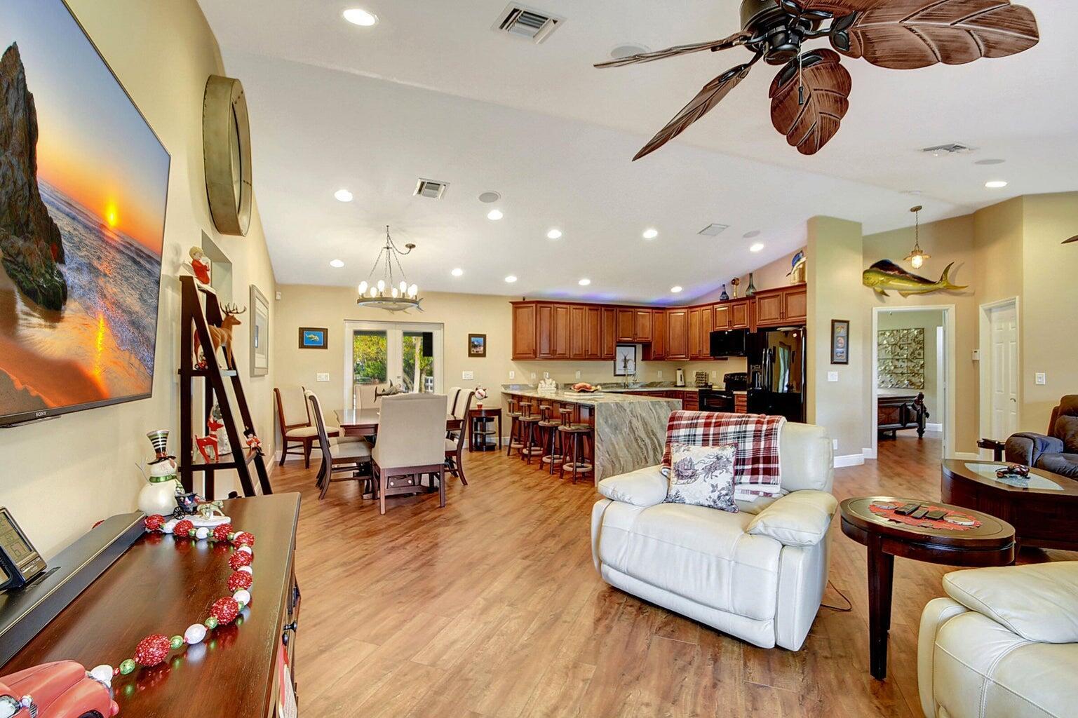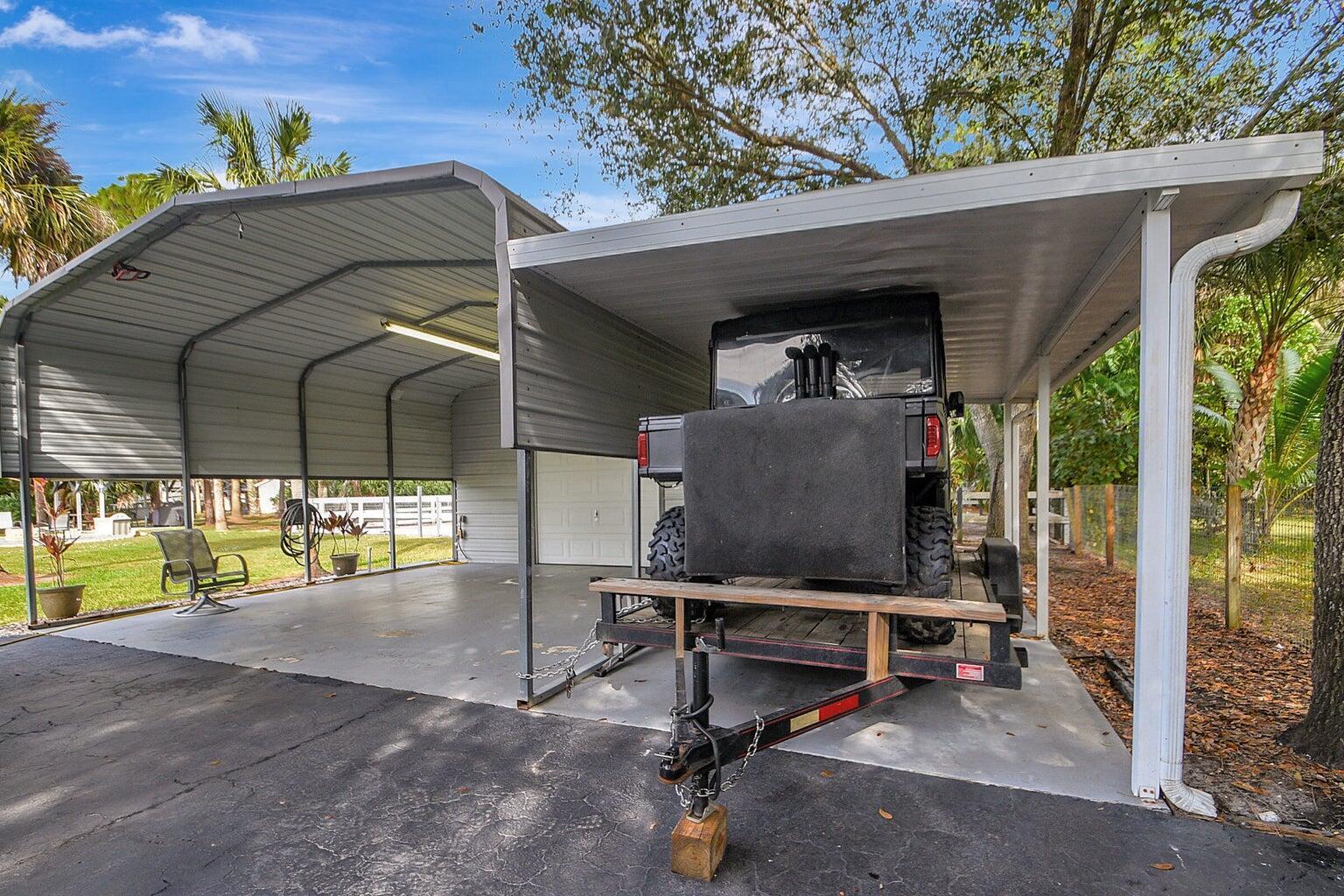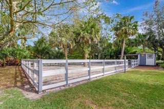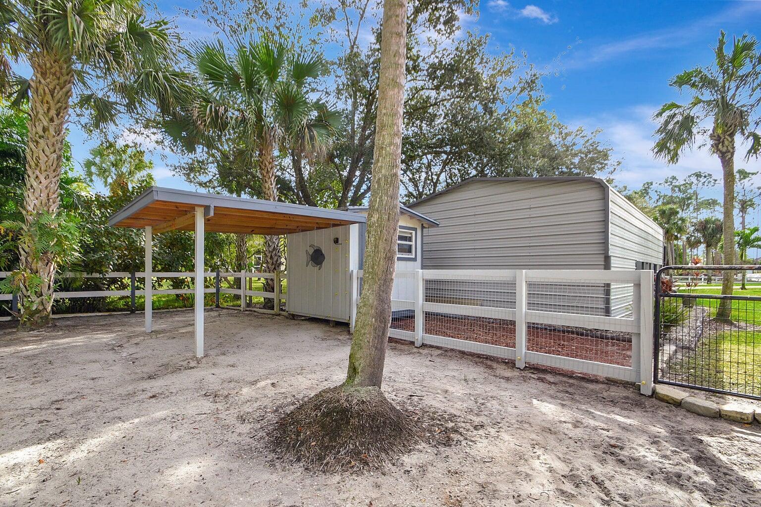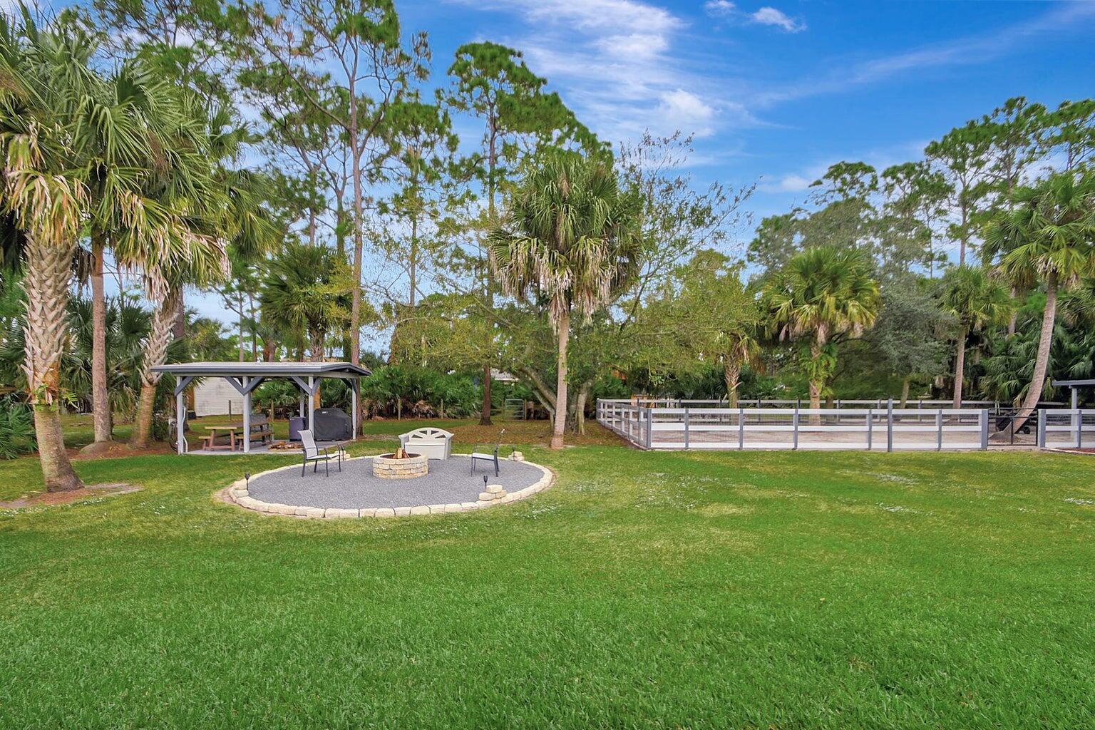 Welcome to this meticulously maintained multi-structure estate offering the perfect combination of comfort, privacy, and functionality. Set behind two separate solar-powered gated driveways, the fully fenced, high-and-dry property features an automatic irrigation system and a thoughtfully designed layout ideal for everyday living, entertaining, and multi-generational use. Outdoor amenities include a 3,400 sq ft fenced corral with a separate tack room, complete with electric and water, a custom fire pit lined with firebrick over a lava rock base and surrounded by crushed granite and weed barrier, and a 20' x 30' warehouse with carport, built-in shelving, workbench, water, stained concrete floors, and a 30-amp RV hookup. New roofs were installed in 2023 on the main house, guest house andgazebo. Additional highlights include a storage shed with electricity, two professionally maintained well systems (one for the main and guest house with a peroxide filtration system, and a separate irrigation system), full hurricane shutters for both residences, and hurricane-rated front and garage doors. The 3-bedroom, 2-bath main house offers an updated and spacious interior with modern upgrades throughout. A 2023 roof, epoxy-coated garage floor, custom rod holders, and electric opener enhance the oversized two-car side-entry garage. Inside, vaulted ceilings in the living room and primary suite elevate the space, while upgraded 5 ¾" baseboards and diagonally installed Aquaguard Salerno waterproof laminate flooring provide durability and elegance. Recessed LED lighting, ceiling fans in every room, and built-in ceiling speakers in the living room add comfort and style. French doors lead to a tiled screened-in patio under the main roof, complete with a ceiling fan, TV mount, and speaker wiring, with potential for future expansion. The kitchen is a chef's dream, featuring soft-close wood cabinets (including double-sided cabinets on the peninsula), lazy Susan corner cabinets, pull-out drawers, and stunning quartzite countertops with a waterfall edge and backsplash. The peninsula includes two pop-up charging stations and a custom cutting board. An oversized Kraus stainless steel sink, under-cabinet lighting, color-changing cabinet accent lights, and GE black appliances complete the well-designed space. Guest bedrooms feature custom shelving in the closets, and the guest bathroom includes a new quartzite countertop and Kraus sink with a tub/shower combination. The spacious primary suite offers a large walk-in closet and a beautifully updated ensuite with quartzite counters, dual Kraus sinks, and an oversized walk-in shower with bench and lighting. A security system services the main home, shed, and warehouse. HVAC was replaced in 2017. The detached guest house includes 2 bedrooms, 1 bathroom, and its own private gated driveway. It features a full kitchen with white appliances, a dining area, and a spacious living room. The primary bedroom has a walk-in closet, and flooring includes Aquaguard Salerno waterproof laminate in the living areas and bedrooms, and ceramic tile in the kitchen and dining spaces. The bathroom has a tub/shower combo, and like the main home, this guest space includes upgraded 5 ¾" baseboards. A screened front porch with stained concrete adds charm and function to this separate living area. This property is truly a rare find, offering modern upgrades, versatile space, and premium features throughout, ideal for those seeking comfort, security, and room to live, work, and entertain.