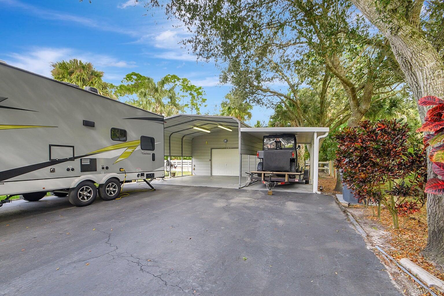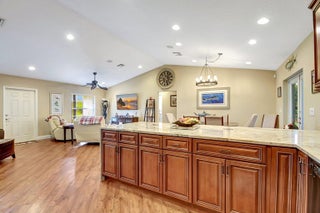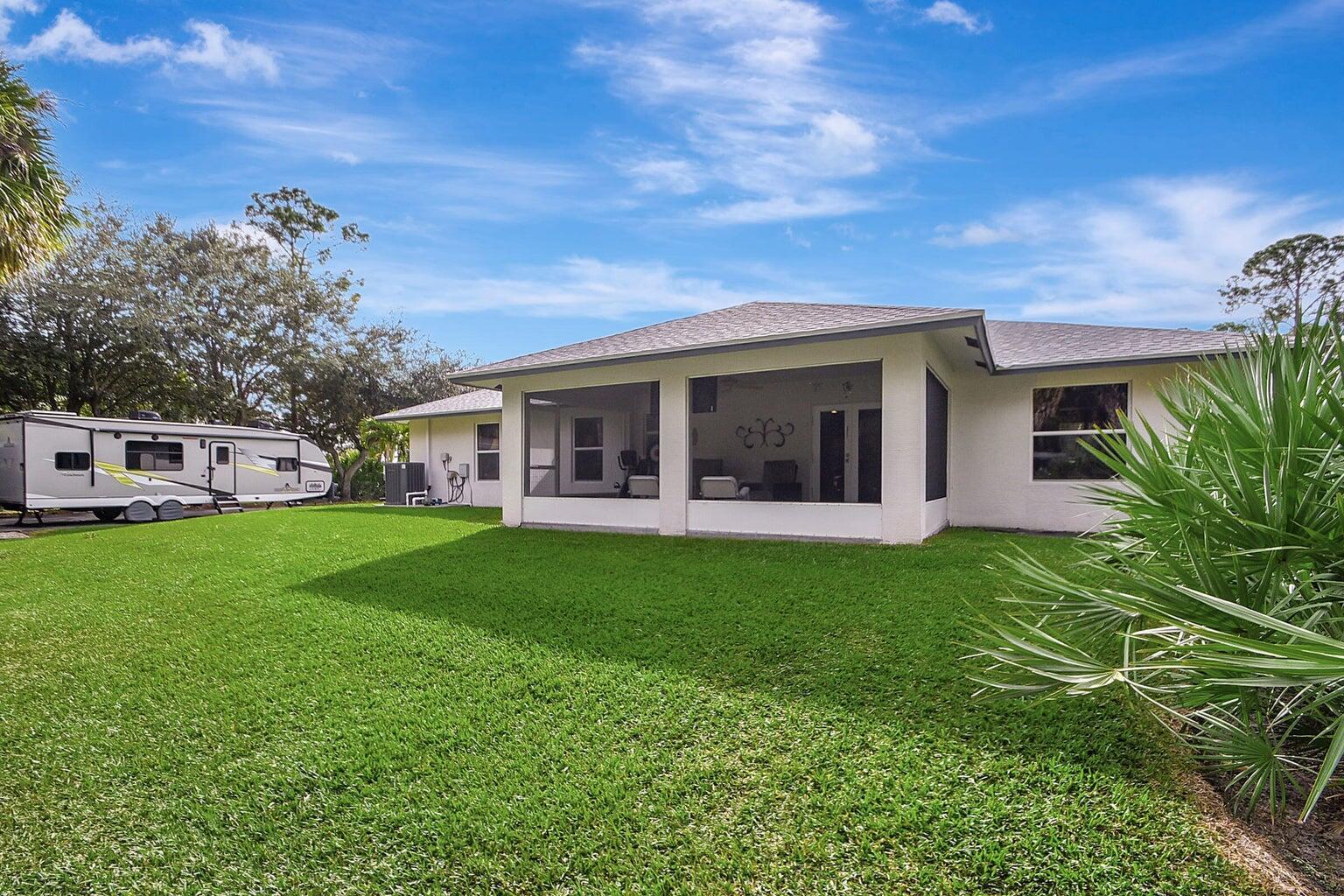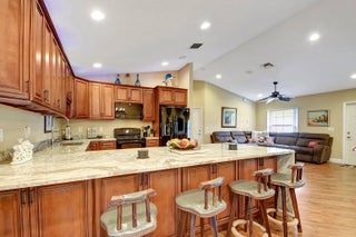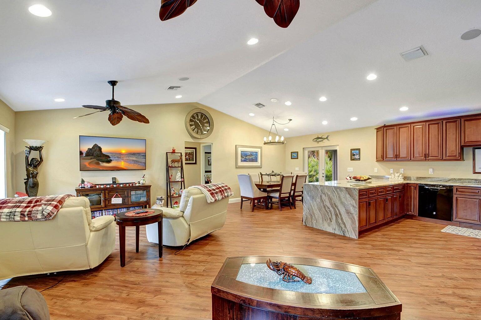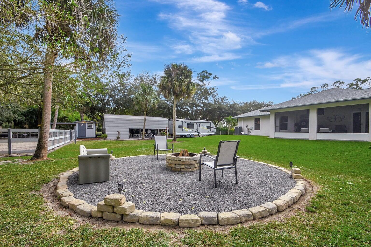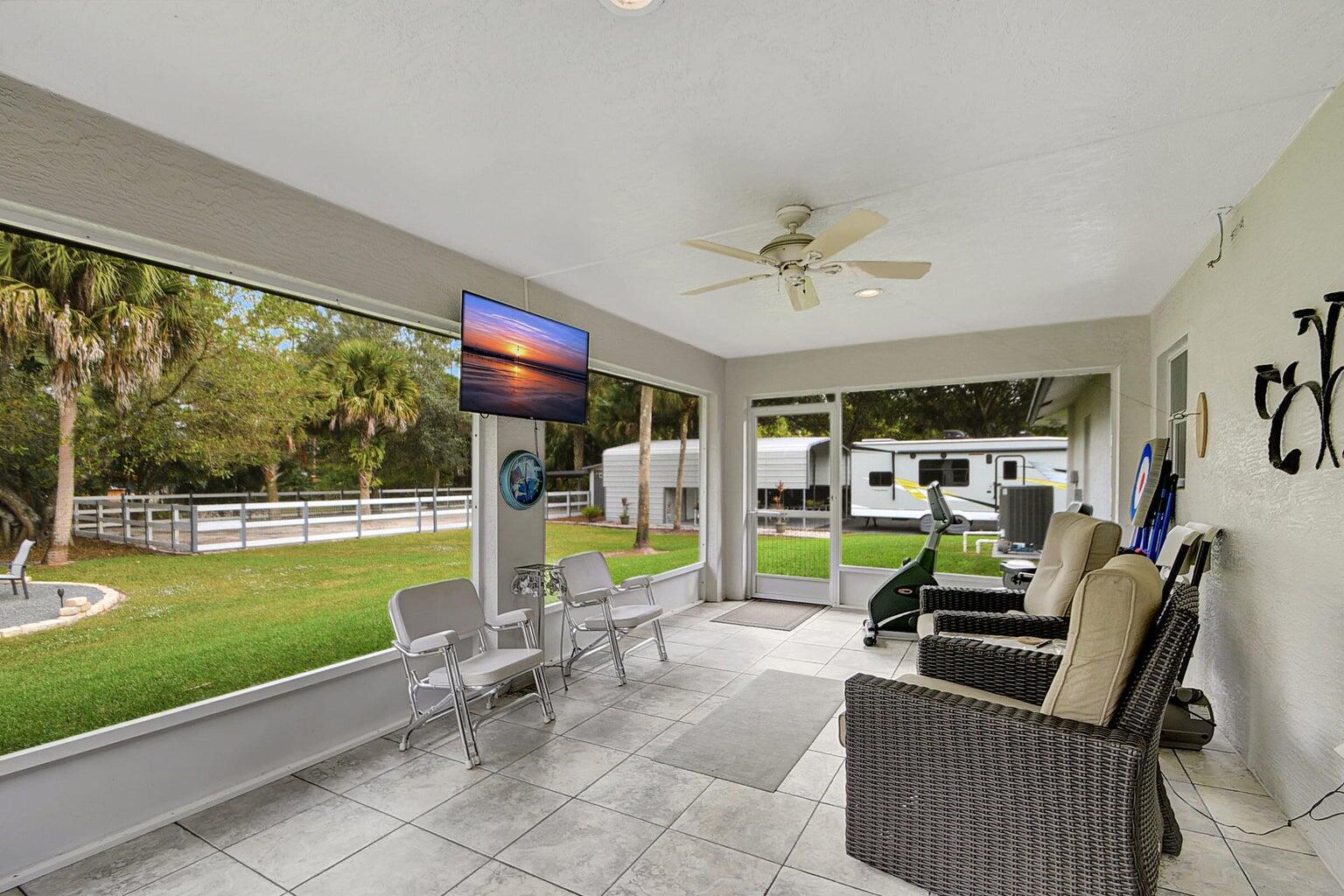 Welcome to this meticulously maintained multi-structure estate offering the perfect combination of comfort, privacy, and functionality. Set behind two separate solar-powered gated driveways, the fully fenced, high-and-dry property features an automatic irrigation system and a thoughtfully designed layout ideal for everyday living, entertaining, and multi-generational use. Outdoor amenities include a 3,400 sq ft fenced corral with a separate tack room, complete with electric and water, a custom fire pit lined with firebrick over a lava rock base and surrounded by crushed granite and weed barrier, and a 20' x 30' warehouse with carport, built-in shelving, workbench, water, stained concrete floors, and a 30-amp RV hookup. New roofs were installed in 2023 on the main house, guest house andgazebo. Additional highlights include a storage shed with electricity, two professionally maintained well systems (one for the main and guest house with a peroxide filtration system, and a separate irrigation system), full hurricane shutters for both residences, and hurricane-rated front and garage doors. The 3-bedroom, 2-bath main house offers an updated and spacious interior with modern upgrades throughout. A 2023 roof, epoxy-coated garage floor, custom rod holders, and electric opener enhance the oversized two-car side-entry garage. Inside, vaulted ceilings in the living room and primary suite elevate the space, while upgraded 5 ¾" baseboards and diagonally installed Aquaguard Salerno waterproof laminate flooring provide durability and elegance. Recessed LED lighting, ceiling fans in every room, and built-in ceiling speakers in the living room add comfort and style. French doors lead to a tiled screened-in patio under the main roof, complete with a ceiling fan, TV mount, and speaker wiring, with potential for future expansion. The kitchen is a chef's dream, featuring soft-close wood cabinets (including double-sided cabinets on the peninsula), lazy Susan corner cabinets, pull-out drawers, and stunning quartzite countertops with a waterfall edge and backsplash. The peninsula includes two pop-up charging stations and a custom cutting board. An oversized Kraus stainless steel sink, under-cabinet lighting, color-changing cabinet accent lights, and GE black appliances complete the well-designed space. Guest bedrooms feature custom shelving in the closets, and the guest bathroom includes a new quartzite countertop and Kraus sink with a tub/shower combination. The spacious primary suite offers a large walk-in closet and a beautifully updated ensuite with quartzite counters, dual Kraus sinks, and an oversized walk-in shower with bench and lighting. A security system services the main home, shed, and warehouse. HVAC was replaced in 2017. The detached guest house includes 2 bedrooms, 1 bathroom, and its own private gated driveway. It features a full kitchen with white appliances, a dining area, and a spacious living room. The primary bedroom has a walk-in closet, and flooring includes Aquaguard Salerno waterproof laminate in the living areas and bedrooms, and ceramic tile in the kitchen and dining spaces. The bathroom has a tub/shower combo, and like the main home, this guest space includes upgraded 5 ¾" baseboards. A screened front porch with stained concrete adds charm and function to this separate living area. This property is truly a rare find, offering modern upgrades, versatile space, and premium features throughout, ideal for those seeking comfort, security, and room to live, work, and entertain.