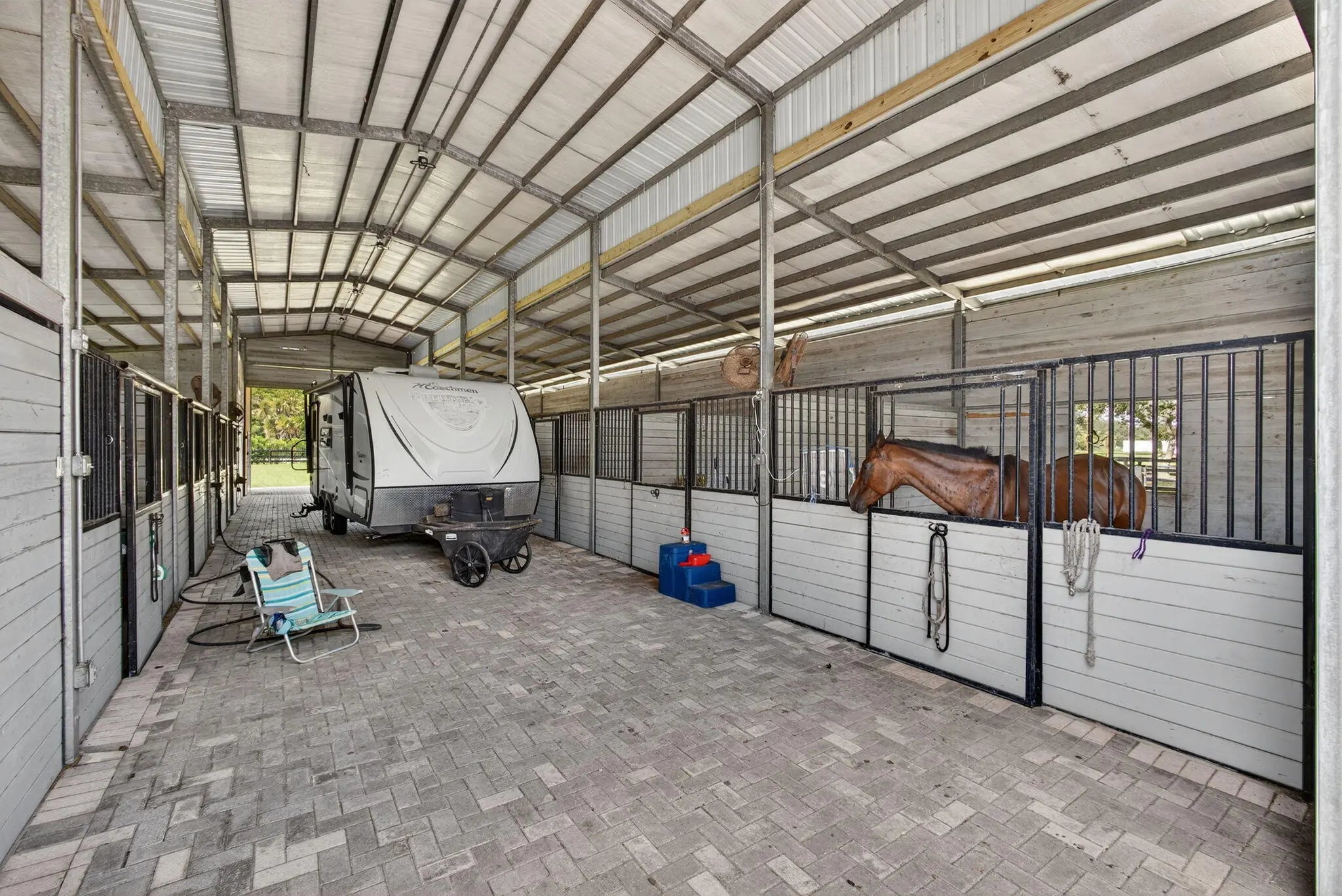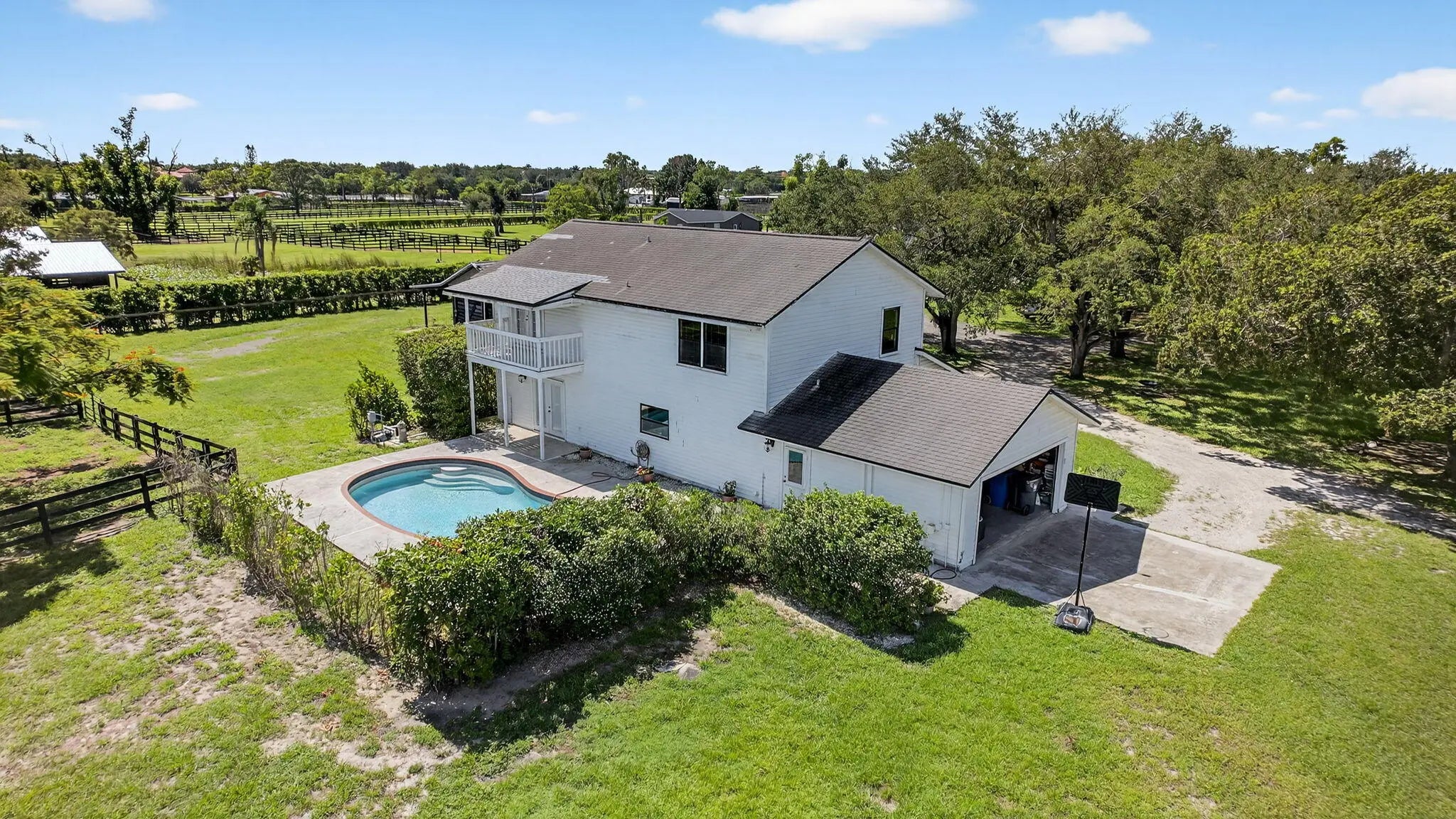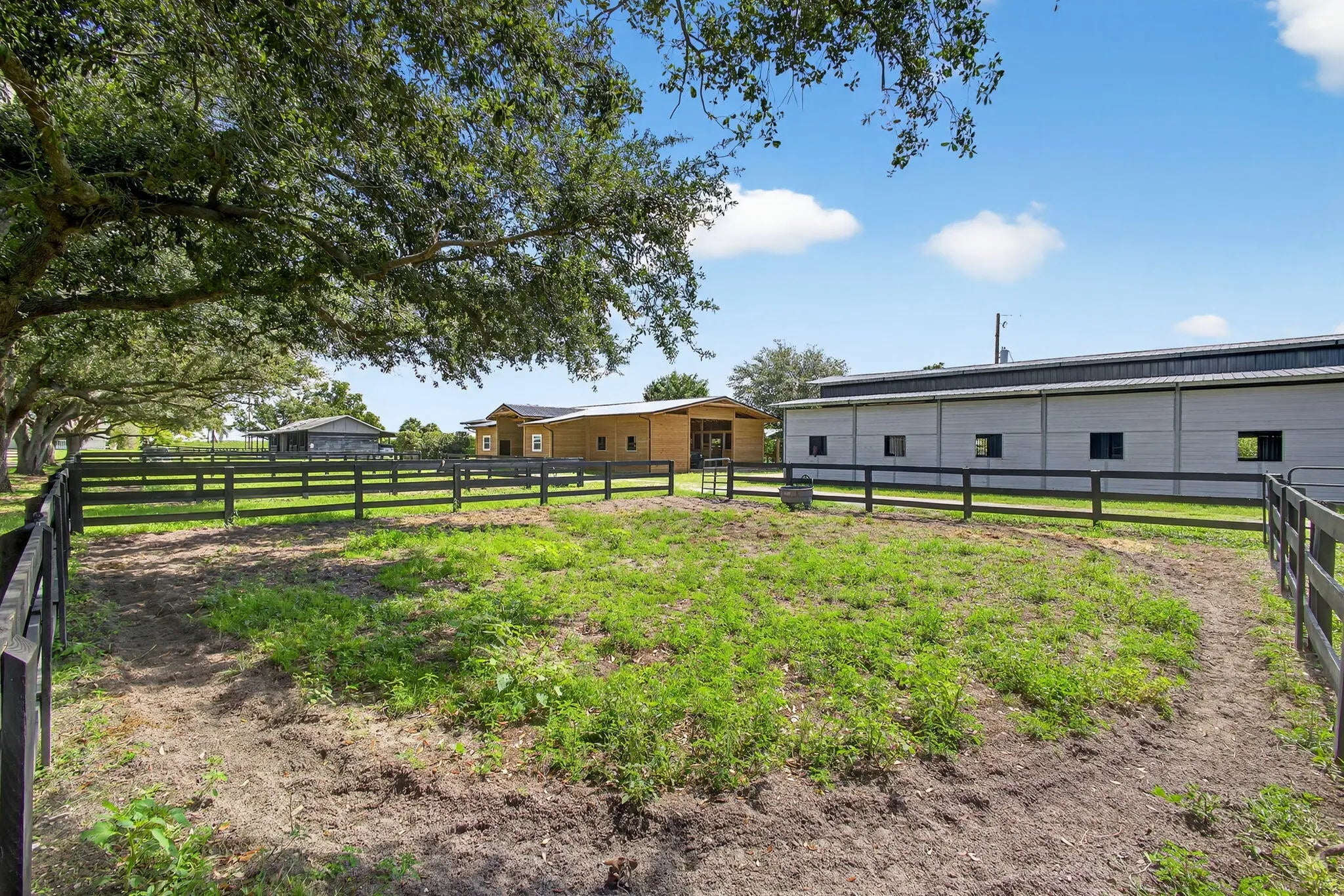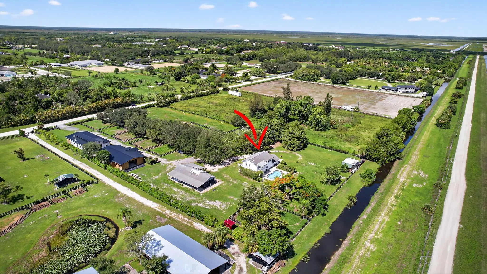 EXCEPTIONAL TURNKEY EQUESTRIAN FACILITY ON 6 ACRES IN RUSTIC RANCHES ESTATESBeautiful equestrian property offering privacy, charm, and functionality in the heart of Rustic Ranches. Walking distance to Wellington's Environmental Preserve and just a short hack to top Wellington shows, with miles of trails at your doorstep.The 4BD/2.5BA home features 2,288 sq ft under air, a garage, pool, and outdoor spaces. Equestrian amenities include 2 new barns (22 stalls), groom's quarters, a horse walker, 7 paddocks, a large field, and room for a riding arena. High and dry property with drainage, public and well water, irrigation, double-fencing, mature oaks, and more. Move-in ready!A MUST-SEE for the discerning equestrian seeking a move-in-ready facility in the heart of Wellington.