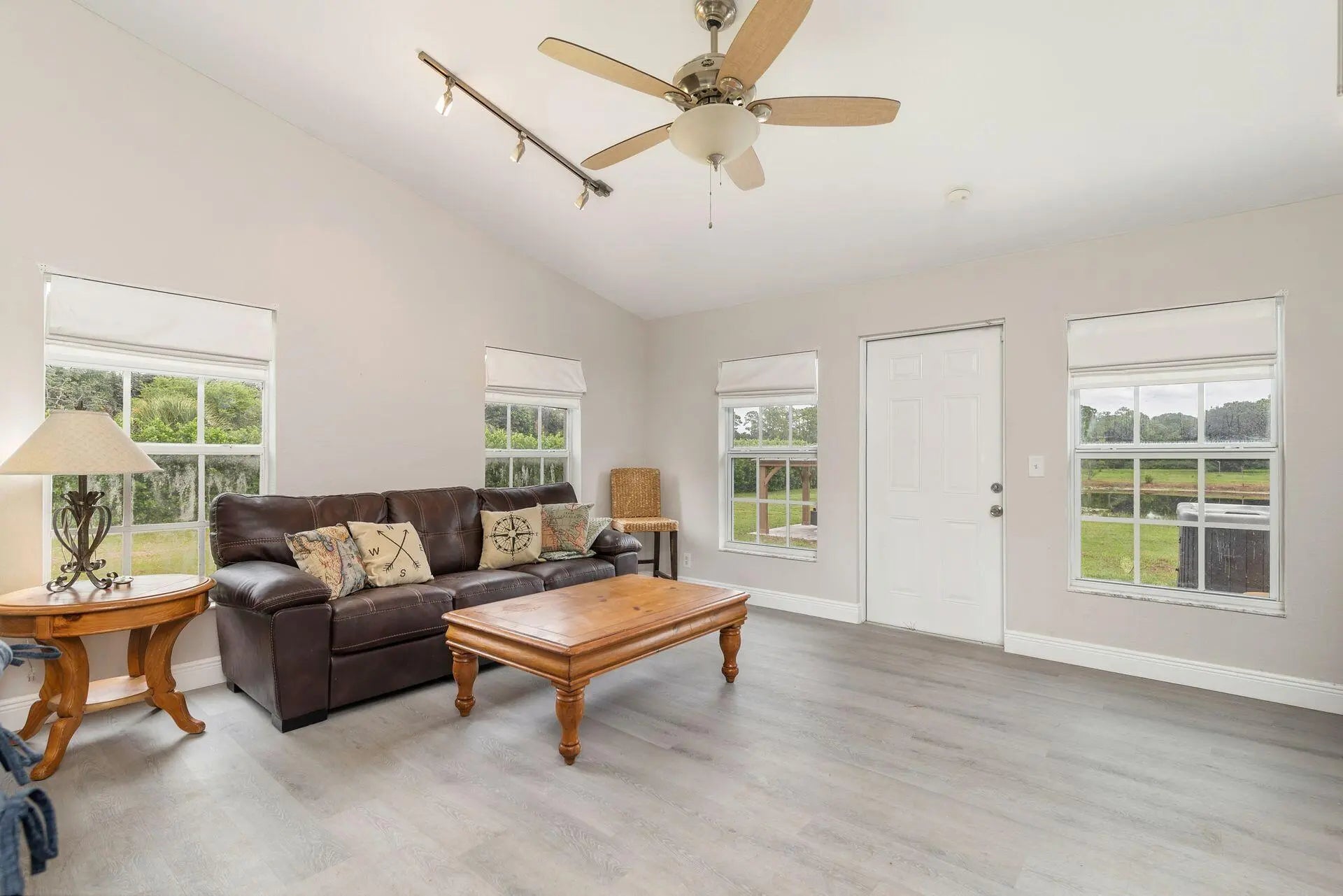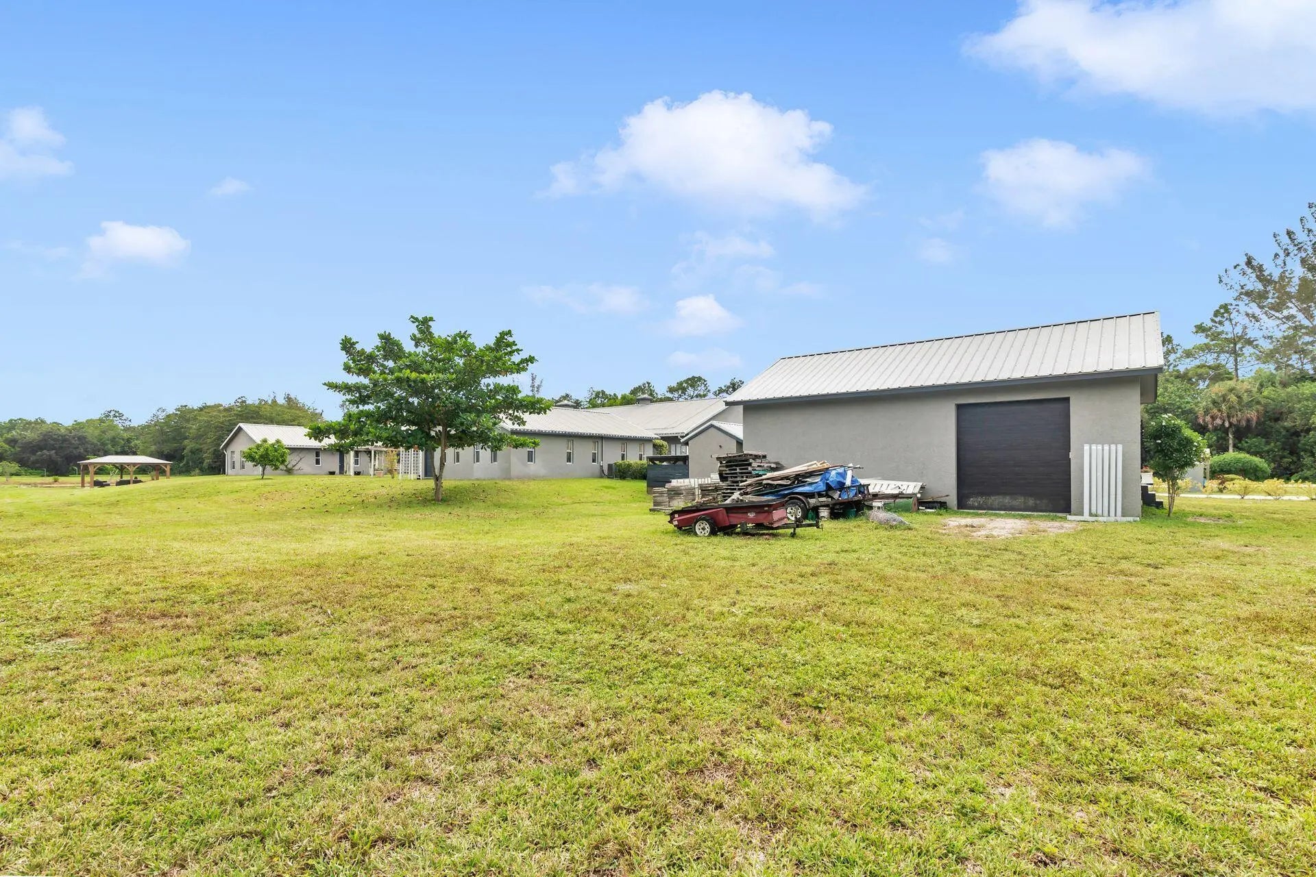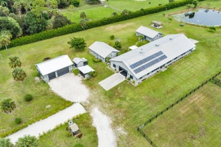 Beautiful 10-acre property with center aisle poured concrete barn- 8 supersized stalls, all with hurricane shutters and screens, 2 wash stalls, full bathroom, tack room, 2 utility/feed rooms, and laundry room. Solar panels for barn and apartments. Oversized 3 car garage. 2 living structures, a 2 bedroom 1 bath with an efficiency and a separate entrance, as well as a large one bedroom one bath house. Newer central A/C units throughout. The 6 paddocks all have new fencing, sand ring with great drainage and improved footing. Pond- beautiful pastures, private- fully fenced with privacy hedge. Solar power entrance gate. There is plenty of room to add more paddocks, a private home, etc. This property is turnkey & only 20-30 minutes from the Wellington Equestrian Center.