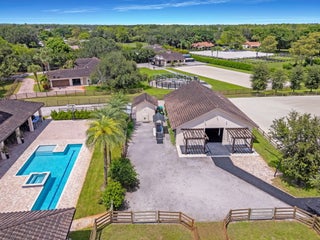 An equestrian dream opportunity: two adjoining properties totaling 3.75 acres with world-class equestrian facilities, including a fully equipped 7-stall barn with tack, feed, laundry, and full bath; a 5-stall barn with tack and feed rooms; multiple wash stalls; two sand arenas; a hot walker; and five paddocks. Three gated driveways and mature landscaping provide privacy and ease of access, just minutes from the Wellington International, Global Dressage venues, and Wellington's dining and shopping--perfectly timed for show season.The main residence is a modern entertainer's dream with bright, wide-open spaces, soaring ceilings, and nearly floor-to-ceiling windows. The entry leads into a striking, one-of-a-kind wine room. Italian marble and wood flooring flow throughout,complemented by a custom office, formal dining, a gorgeous loft, and a spectacular kitchen with a huge center island, custom cabinetry, and a double pantry. An elegant indoor bar provides a separate space for entertaining. The main-level primary suite is a luxurious retreat with dual spa-inspired bathrooms, a freestanding soaking tub, double vanities, a huge walk-in shower, a sitting area, an oversized closet, and a cabana-style bath. Living areas open to a resort-style pool with summer kitchen, putting green, and cabana bath. A 4-car garage, coffee bar, and state-of-the-art laundry with automated lighting complete the residence. A separate 1-bedroom apartment with a full kitchen and laundry provides private guest or staff accommodations. The second residence offers 3 bedrooms, 2 baths, an office, formal dining, partial hurricane-impact windows, its own pool, a detached studio efficiency, and a 3-car garage. This rare Wellington property blends luxury living with exceptional equestrian amenities, offering an unparalleled lifestyle for entertaining, leisure, and equestrian pursuits.