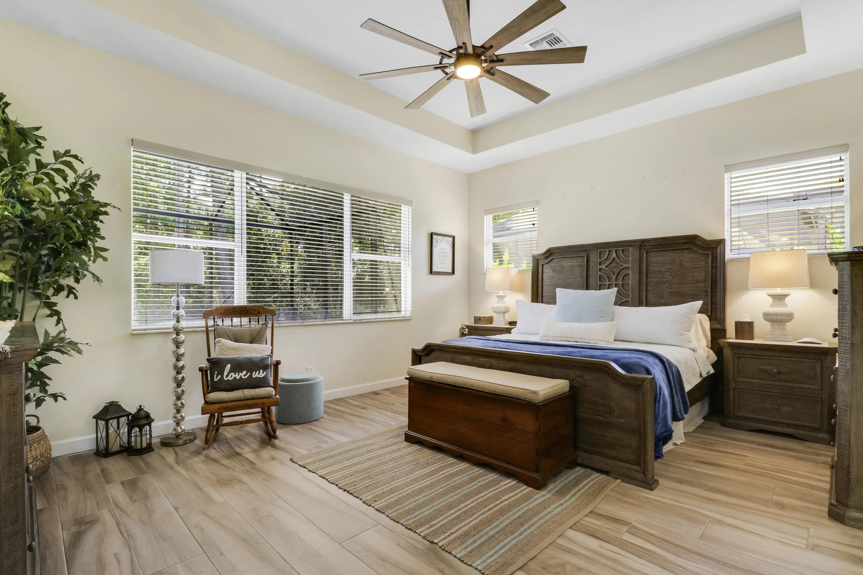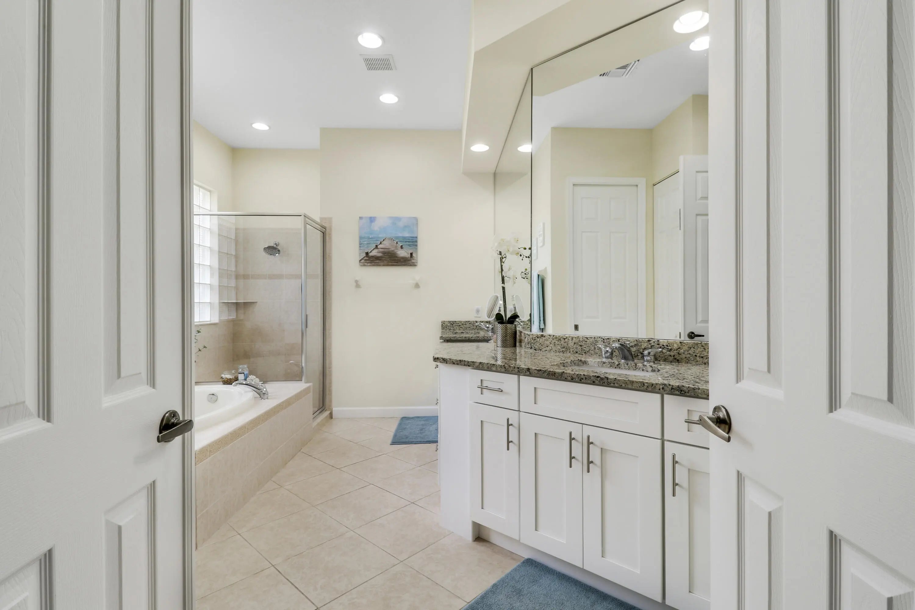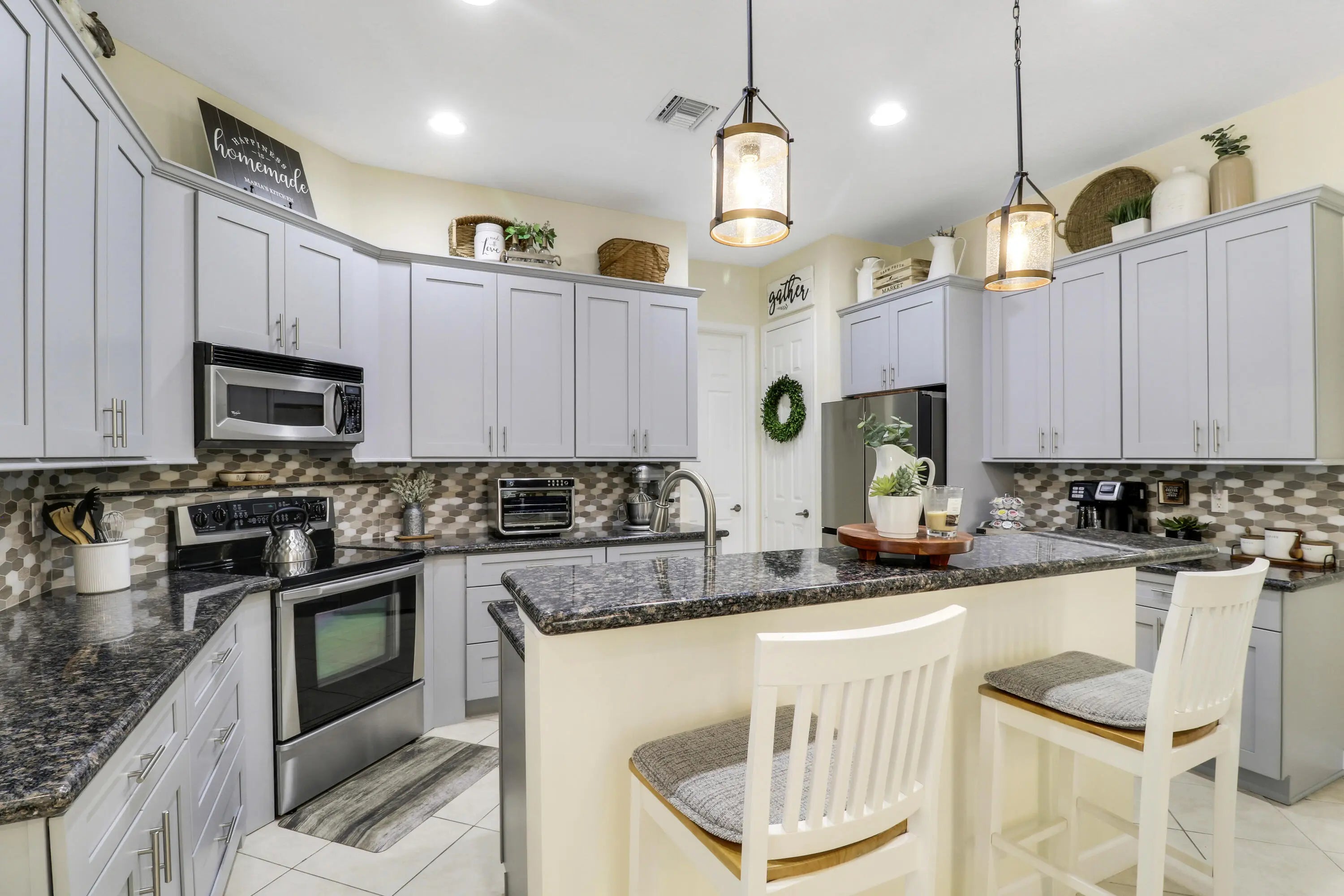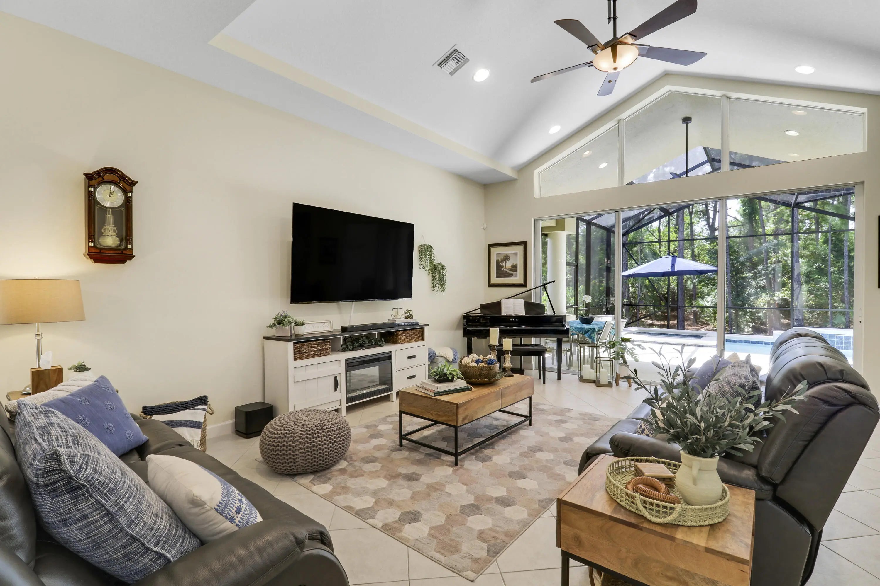 WELCOME HOME! Popular Fairview plan in PGA Village w/ NEW 2024 SALTWATER POOL & SPA! This 2BR+Den/2BA/2CG home has an open floor plan ideal for entertaining & modern living. Special features include tile flooring throughout, decorative glass entry front door, neutral interior paint, new refrigerator, washer, dryer and water heater, vaulted ceilings, updated cabinetry and more. The spacious kitchen features gray cabinetry, granite counters, tile backsplash, SS appliances, pantry closet and breakfast bar. Master Suite has large walk-in closets and a spa like ensuite w/ soaking tub, walk in shower and large vanity w/ dual sinks. The guest bedroom and den are both close to the hall bathroom. Spacious laundry room leads to the garage. The star of the show is the NEW POOL & SPA, built in 2024.