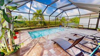 This 2-bedroom, 2-bath home plus den offers just under 1,700 square feet of open living space with a thoughtful split floor plan, ideal for hosting family and guests. The true highlight is the stunning oversized screened lanai and pool area. Featuring a sparkling heated pool, expansive covered space with room for seating and a TV, hurricane screens, and upgraded landscaping, this outdoor retreat provides the ultimate in privacy and relaxation--perfect for year-round Florida living and entertaining. Inside, the kitchen overlooks the dining and family rooms and is beautifully appointed with granite countertops, 42-inch cabinets, a gas range, and an upgraded backsplash.