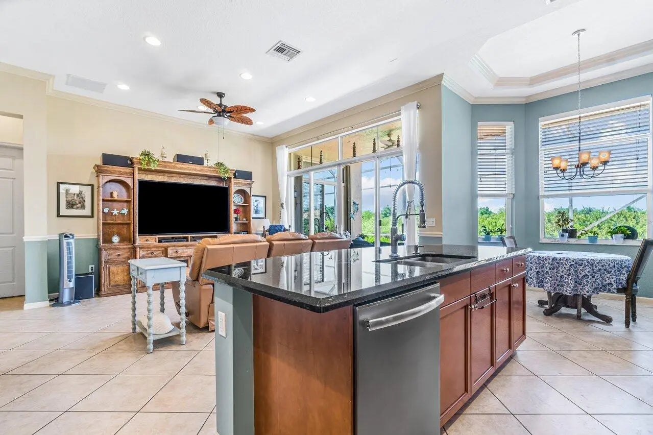 Beautiful home for sale in Wellington's premier active adult 55+ community, Buena Vida! Situated on a private waterfront lot overlooking a peaceful preserve this one-story home features 2 bedrooms + den, 2.5 bathrooms, a 2 car garage, and over 3,000 square feet of indoor and outdoor living. Recent upgrades include a NEW AC (Oct 2023), NEW accordion hurricane shutters (2022), NEW refrigerator (2023), NEW water heater (2022), and NEW Shaw luxury vinyl flooring throughout the bedrooms and den.As you step through the double doors you'll be greeted by a circular foyer that leads to the well-appointed formal living room and dining room. Designed with entertainment in mind, the formal areas flow seamlessly into the family room and kitchen.