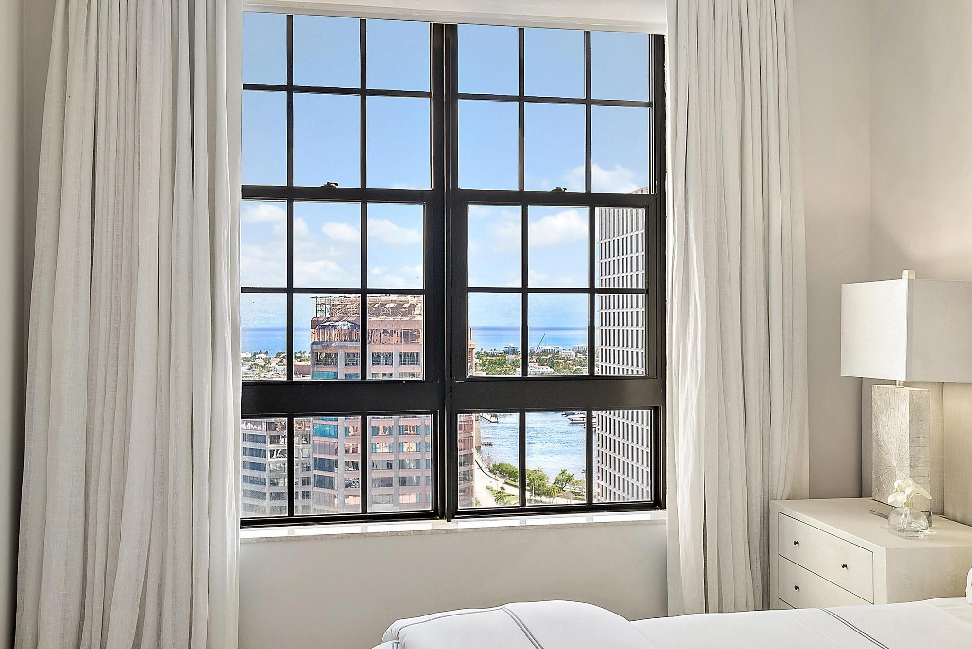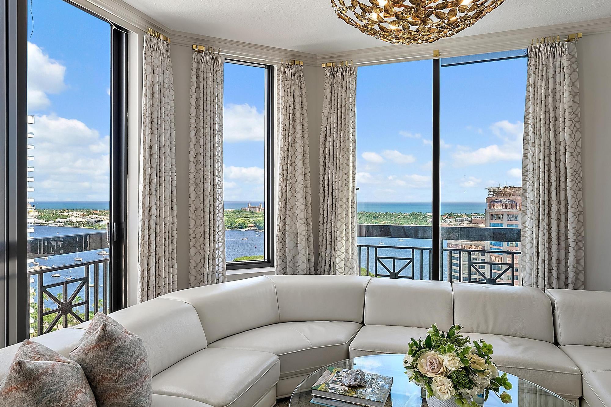 Breathtaking views high above downtown West Palm Beach. This 20th floor 3BR+ penthouse captures sweeping views of the Intracoastal, Palm Beach & the Atlantic Ocean. Thoughtfully designed for comfortable & sophisticated daily living & entertaining over expansive water views. Enjoy a graciously scaled open living room w/ a custom bar, 11' floor-to-ceiling glass & an open chef's kitchen. PH includes 2 premium parking spaces w/EV charging & climate-controlled storage w/electric & wine coolers. Building amenities include a rooftop pool deck w/ grills, dog park, & TVs, 24 hr security, plus a 5th floor gym, club room, theatre, & spa w/ steam & dry saunas. No upcoming assessments. Seller open to selling w/ furniture. Moments away from downtown WPB & PB, PBI Airport, & world-class dining & retail.
