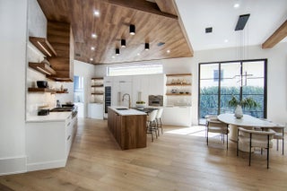 Step into this newly constructed residence that transcends the ordinary, a home where architectural artistry meets effortless livability. Every space has been curated with exquisite attention to detail, blending natural textures, timeless materials, and cutting -edge design. A show -stopping kitchen anchors the home with rich wood finishes, quartz countertops, & floating shelves framed against a soft porcelain back splash. The dramatic island with custom wood inlay invite both gathering and gourmet creation. Integrated professional grade appliances & statement lighting complete this sophisticated culinary space.