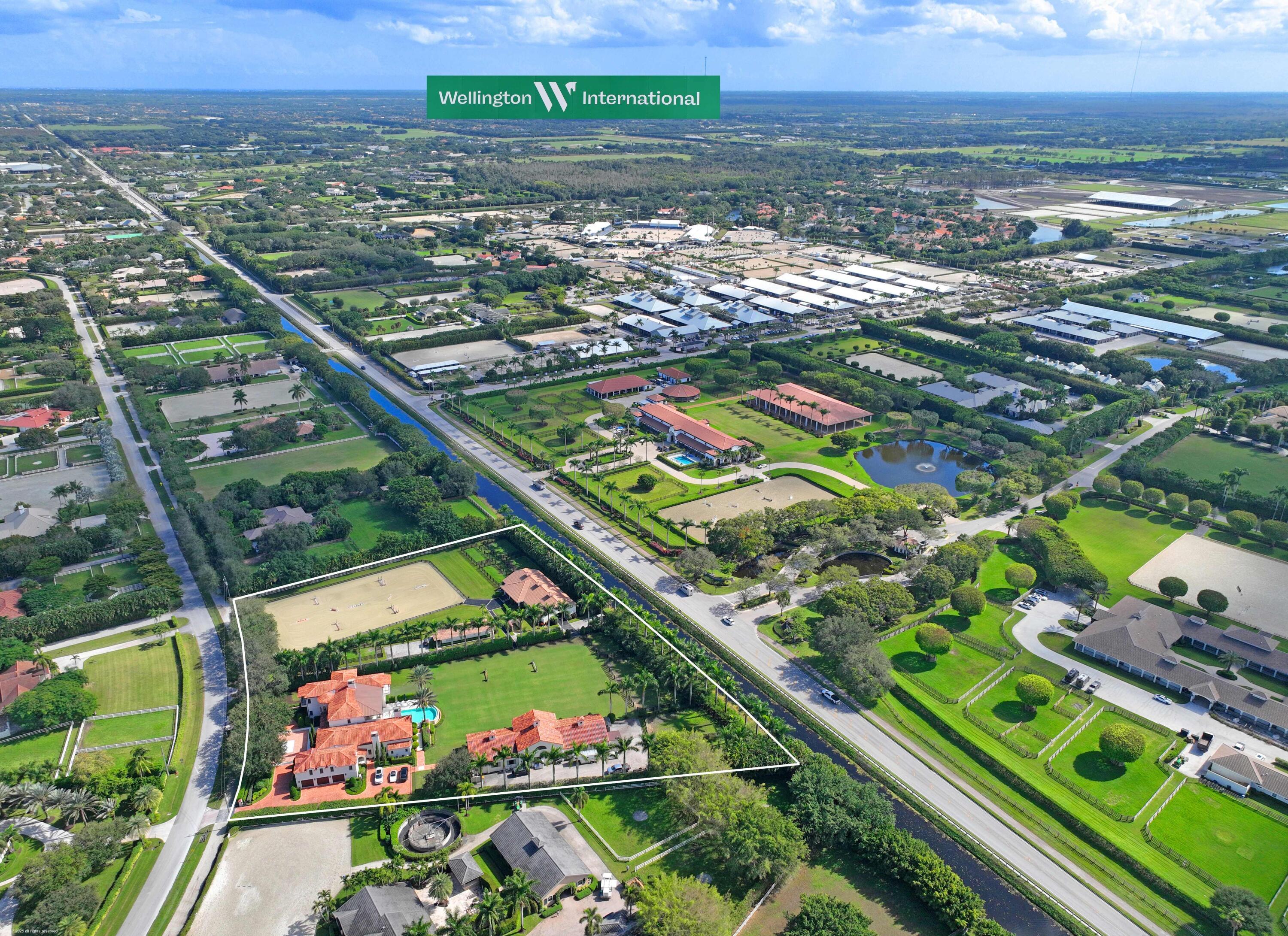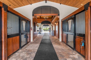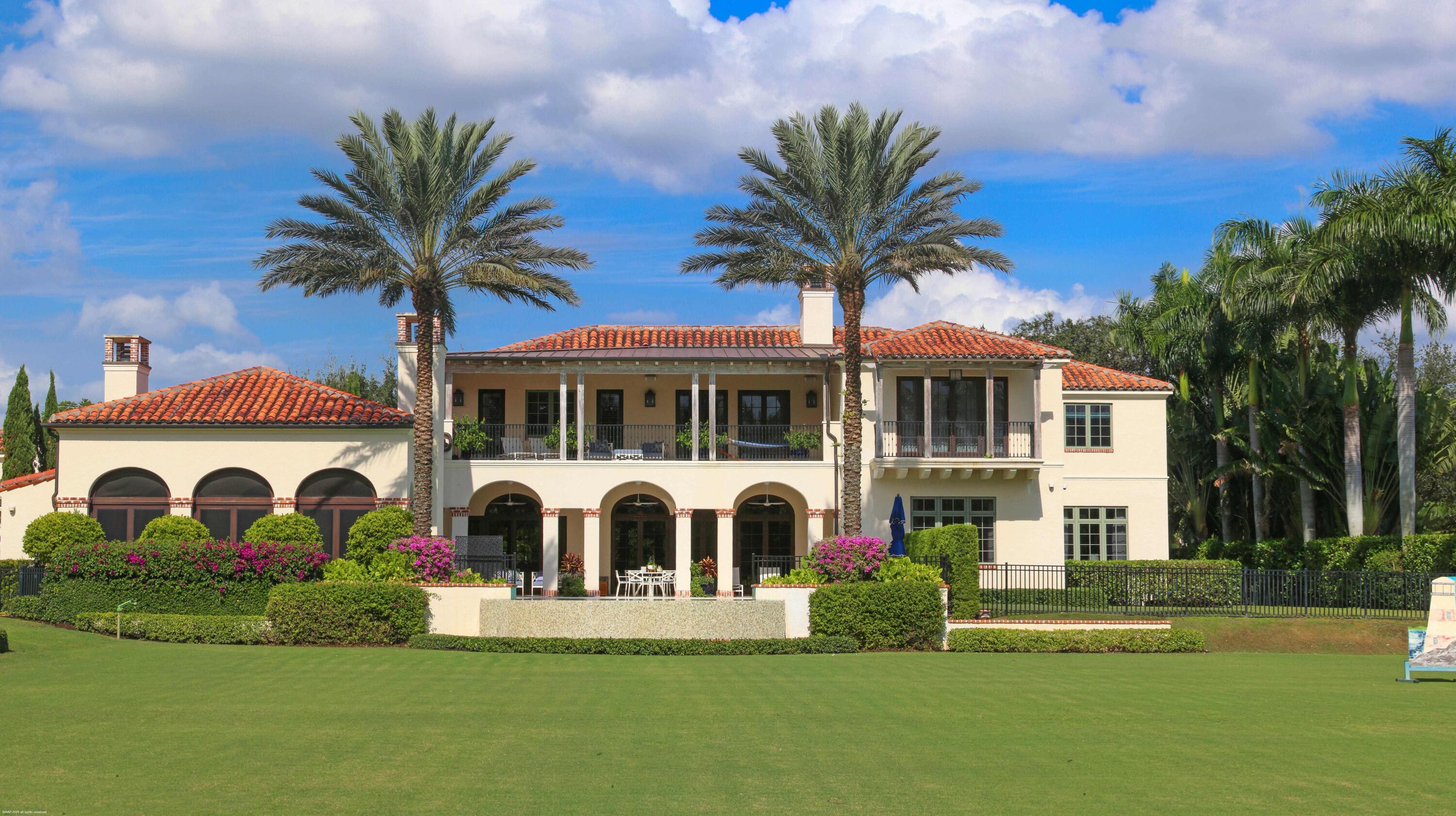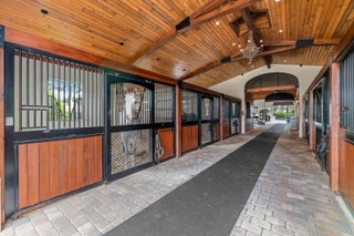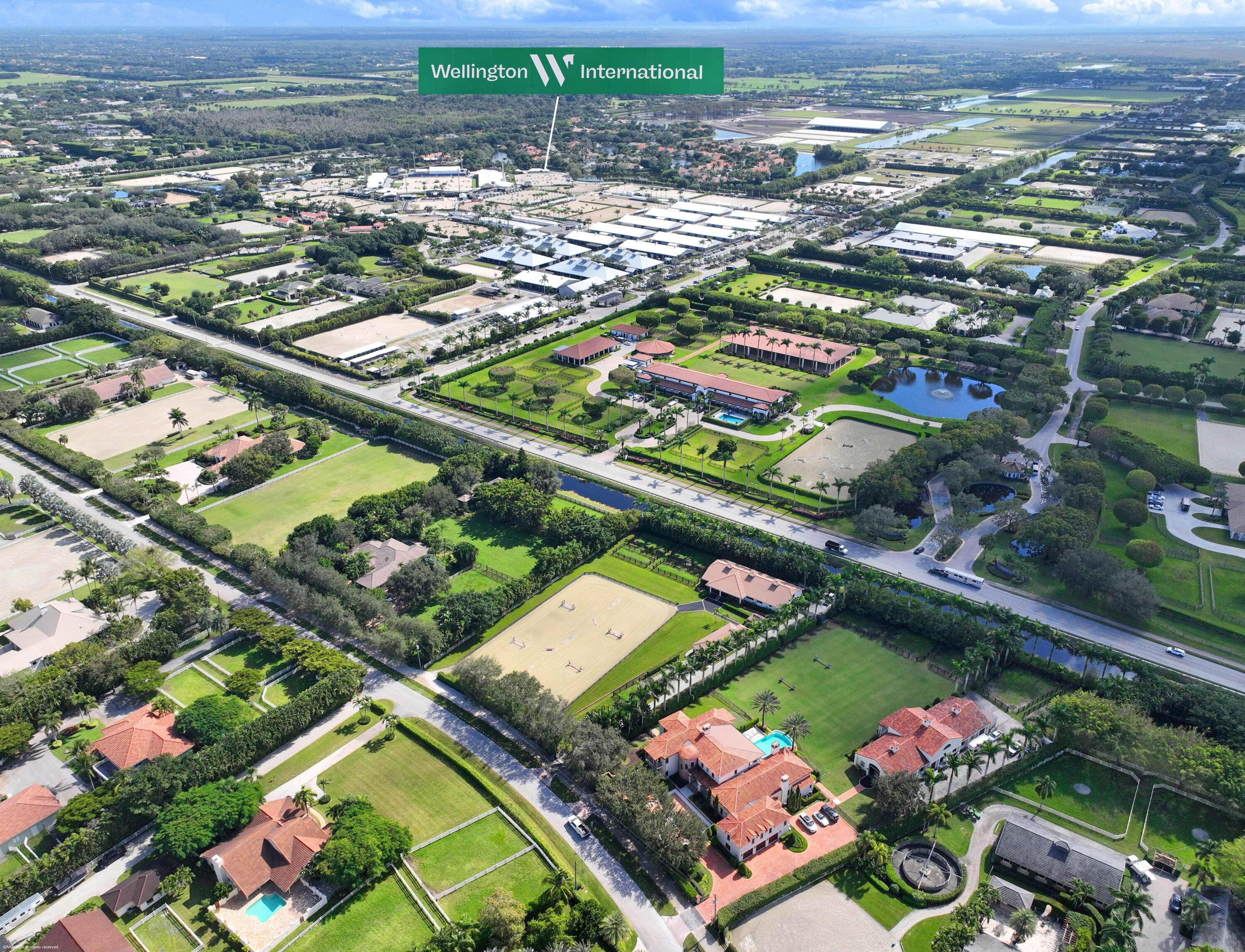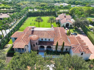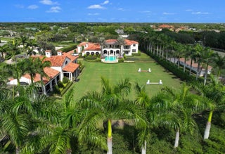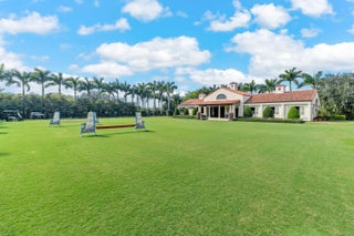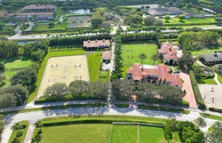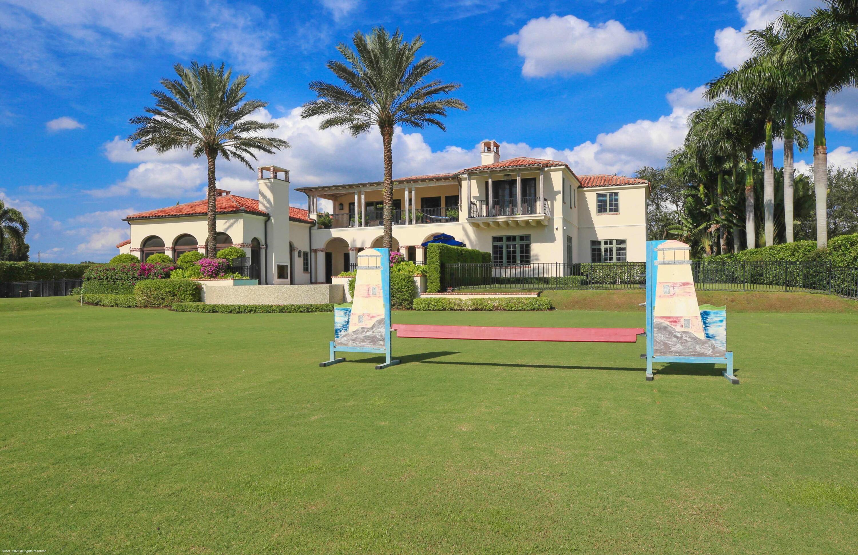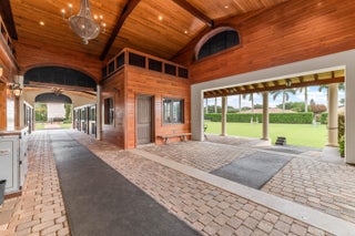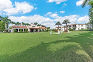 A true masterpiece! Unmatched equestrian estate positioned next to Wellington International horse show grounds. Mere minutes walking to the competition arenas. The main home and owners barn were constructed with the highest quality and finest design. A standing work or art! This Mediterranean style equestrian compound boasts Palm Beach Island level finishes and spans over 4 acres across two lots and includes an exquisite, 11,359 sq ft (7878 sq ft under air), 5-bedroom plus office main residence with a guest apartment, two 8-stall barns, a 3-bedroom staff apartment, an oversized NEW, sub-irrigated riding arena that measures 210x125ft, a grand prix field and 10 paddocks. A rare opportunity to own one of the finest equestrian estate in Wellington.Designed by architect Roger Janssen, the main home features elegant living and dining spaces, a billiards room, office, screened porch, butler's kitchen and well-appointed kitchen and family areas. Upstairs hosts the primary suite and three additional bedrooms. Premium finishes include cypress ceilings, custom cabinetry, hardwood flooring, a full-house generator, Infinity pool overlooking the field and much more.