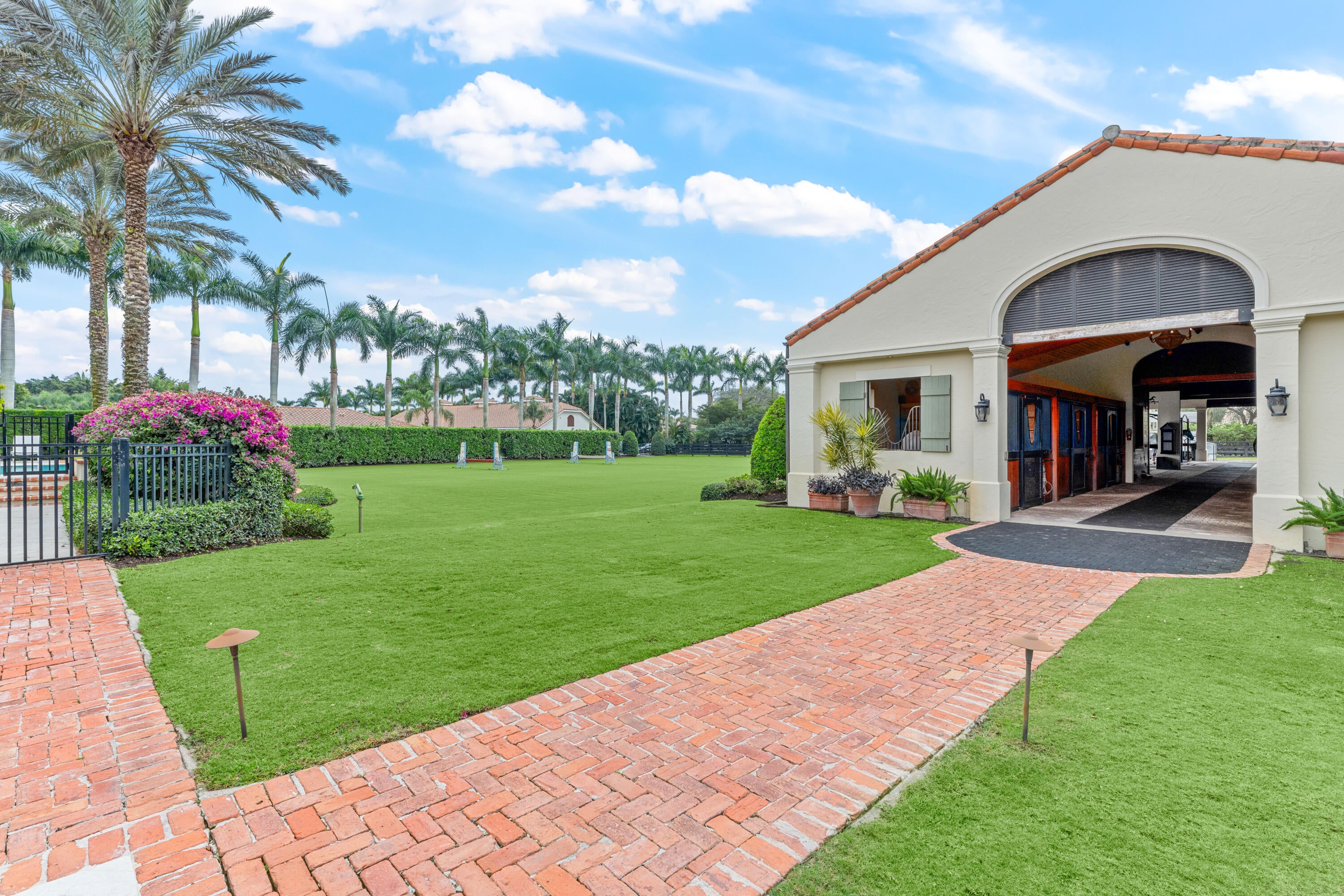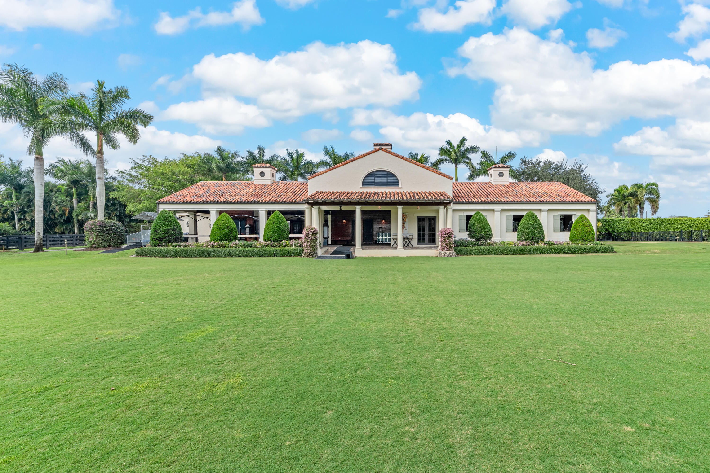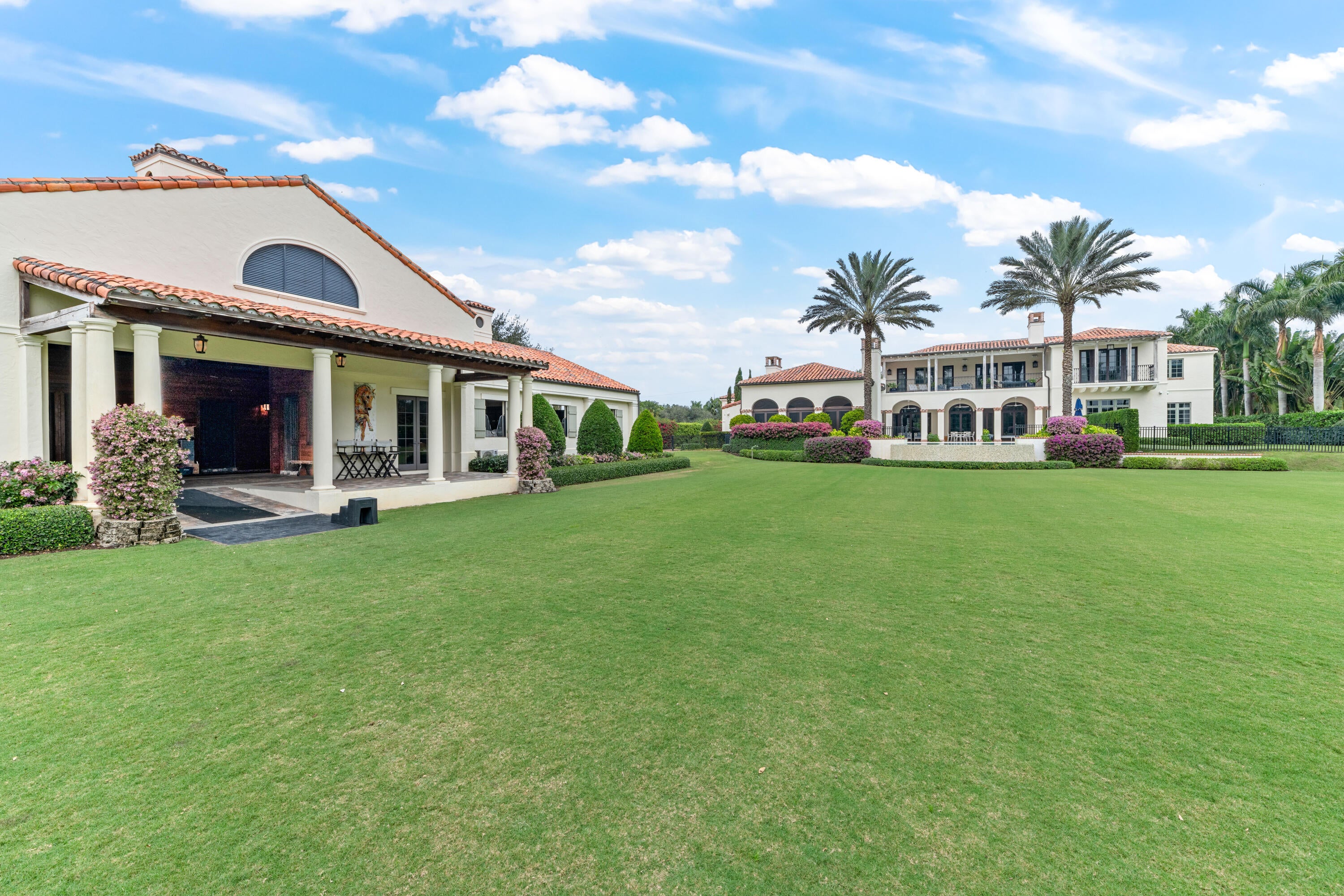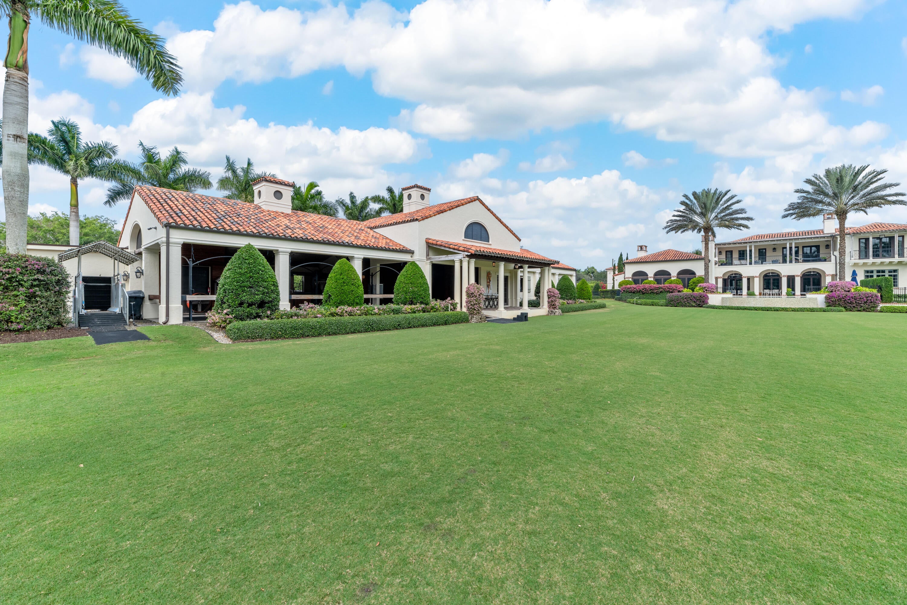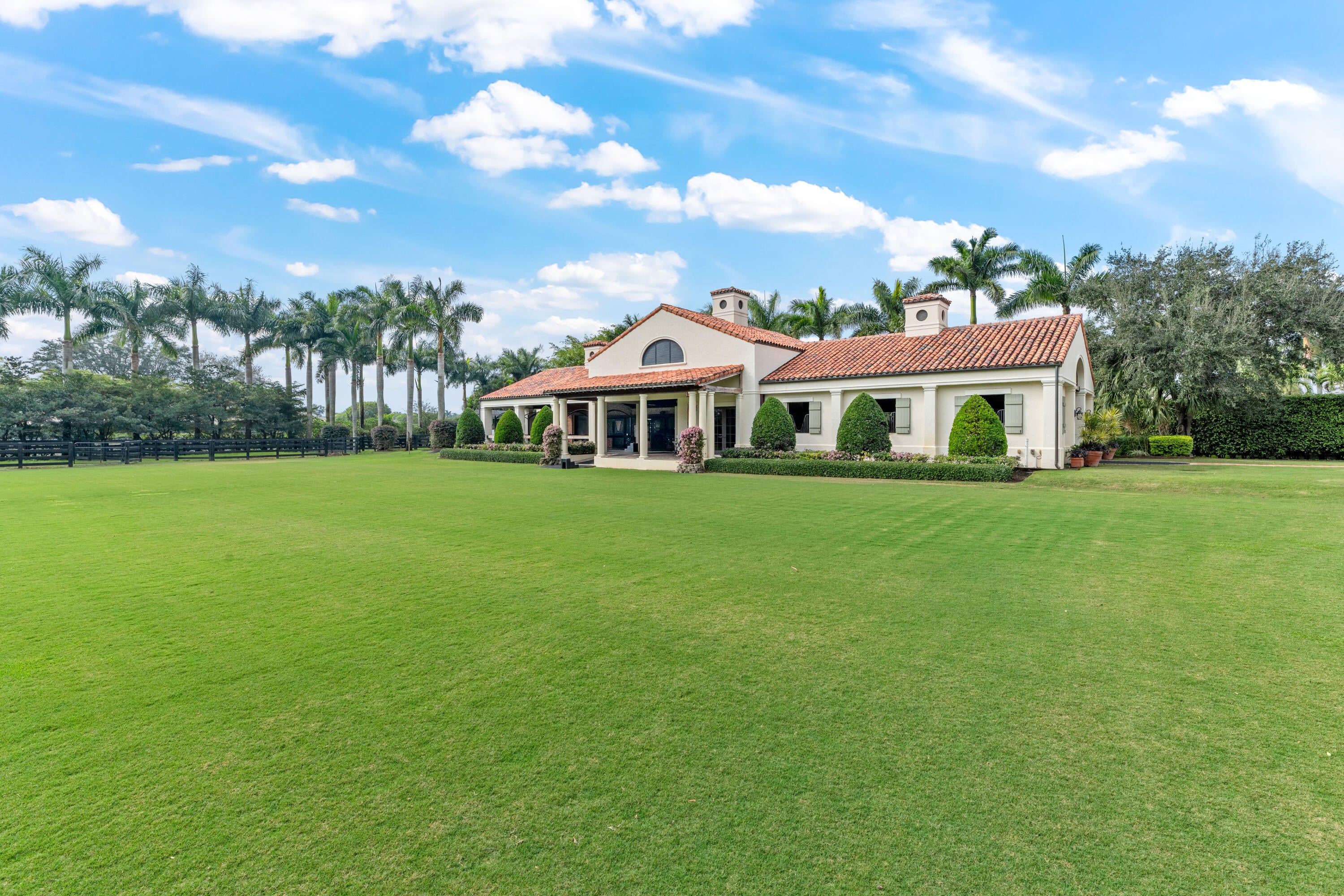 A true masterpiece! Unmatched equestrian estate positioned next to Wellington International horse show grounds. Mere minutes walking to the competition arenas. The main home and owners barn were constructed with the highest quality and finest design. A standing work or art! This Mediterranean style equestrian compound boasts Palm Beach Island level finishes and spans over 4 acres across two lots and includes an exquisite, 11,359 sq ft (7878 sq ft under air), 5-bedroom plus office main residence with a guest apartment, two 8-stall barns, a 3-bedroom staff apartment, an oversized NEW, sub-irrigated riding arena that measures 210x125ft, a grand prix field and 10 paddocks. A rare opportunity to own one of the finest equestrian estate in Wellington.Designed by architect Roger Janssen, the main home features elegant living and dining spaces, a billiards room, office, screened porch, butler's kitchen and well-appointed kitchen and family areas. Upstairs hosts the primary suite and three additional bedrooms. Premium finishes include cypress ceilings, custom cabinetry, hardwood flooring, a full-house generator, Infinity pool overlooking the field and much more.