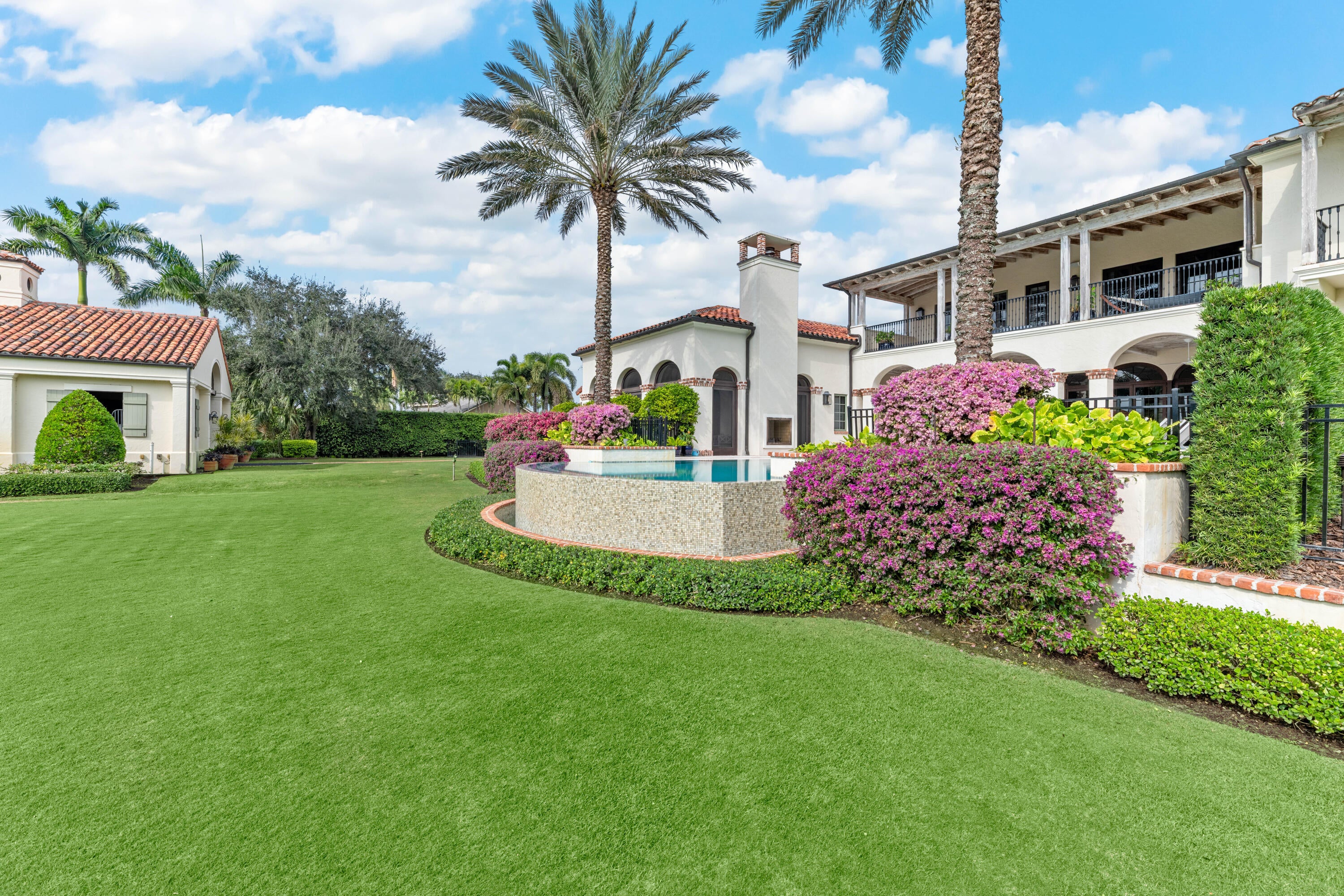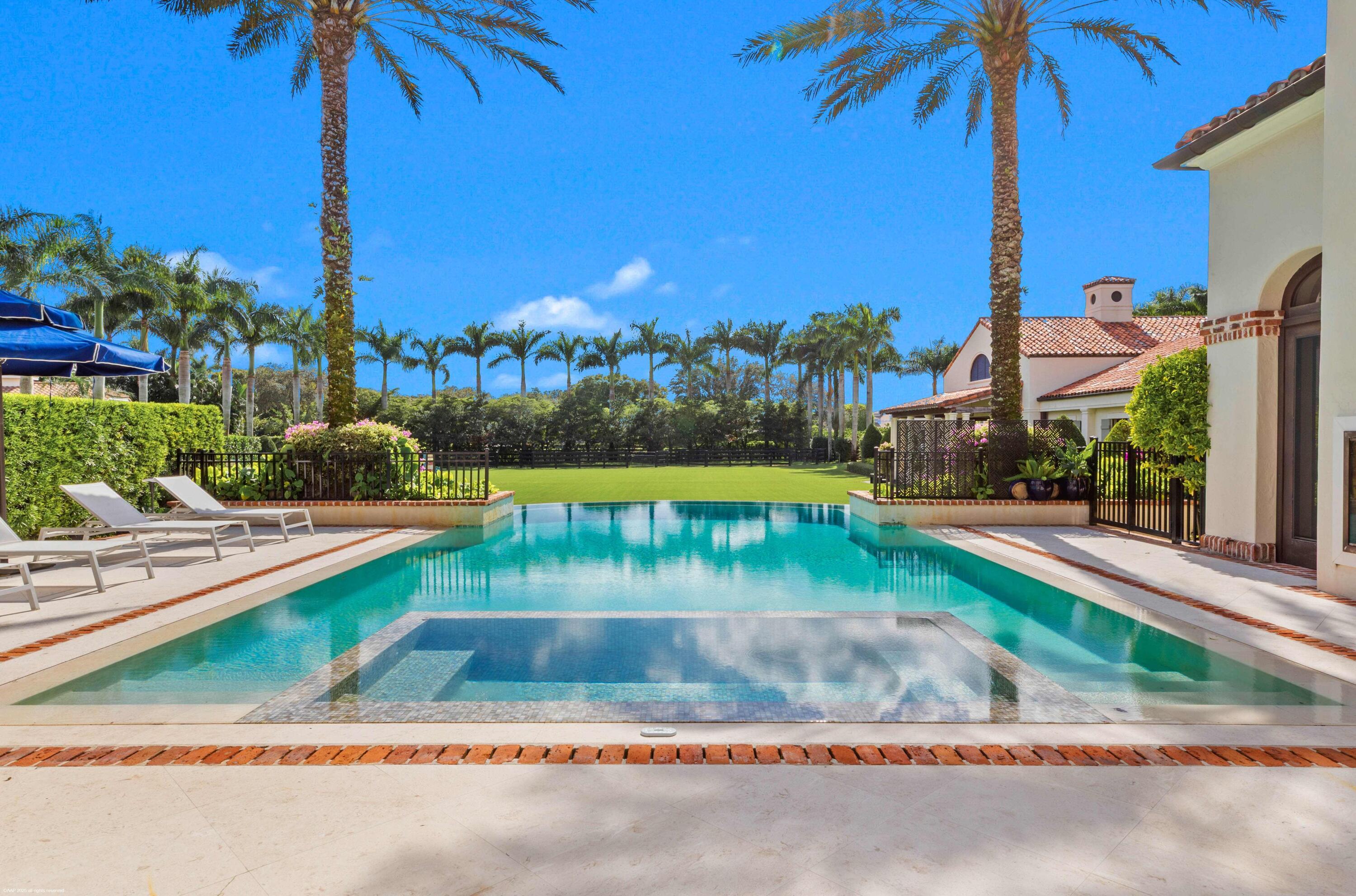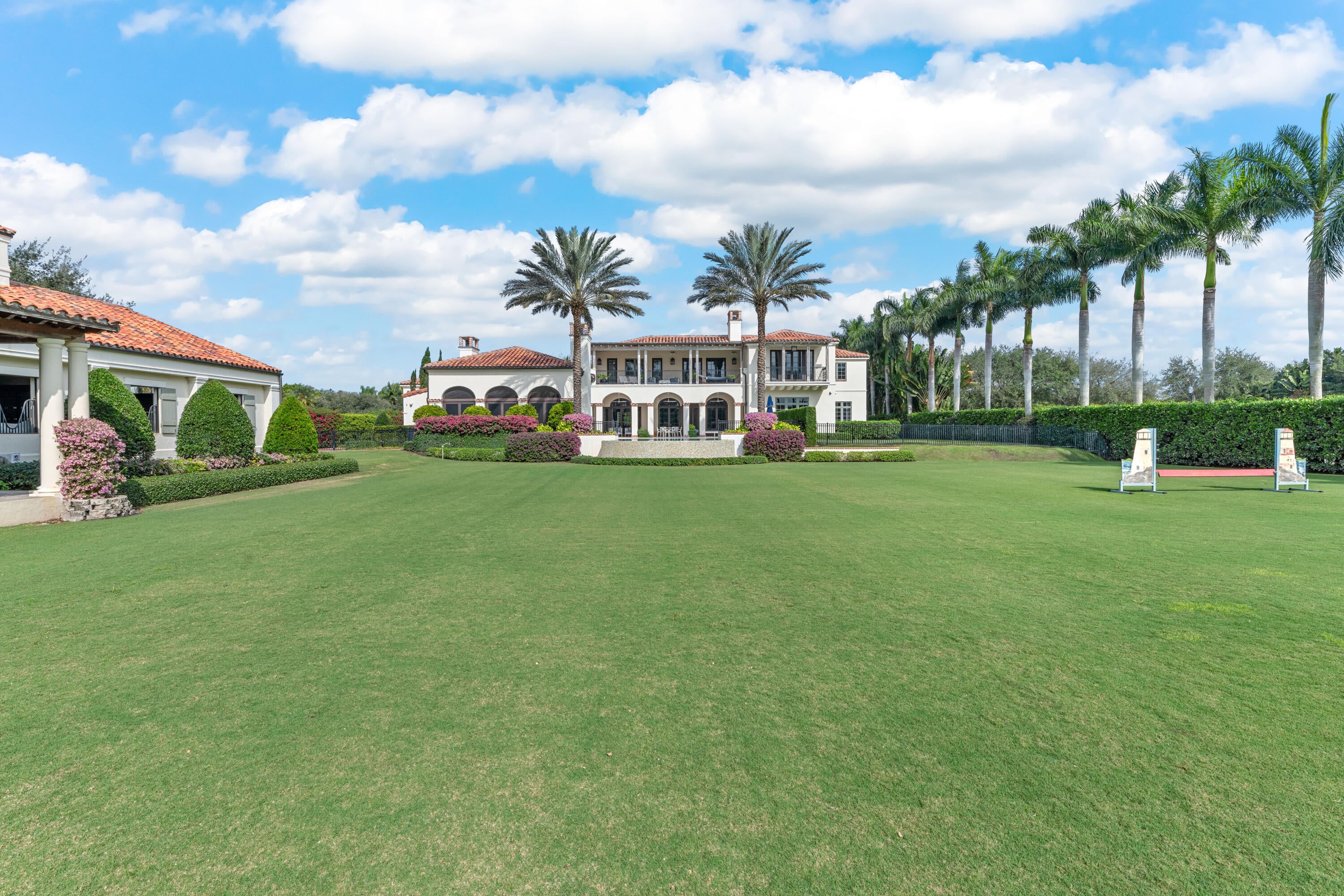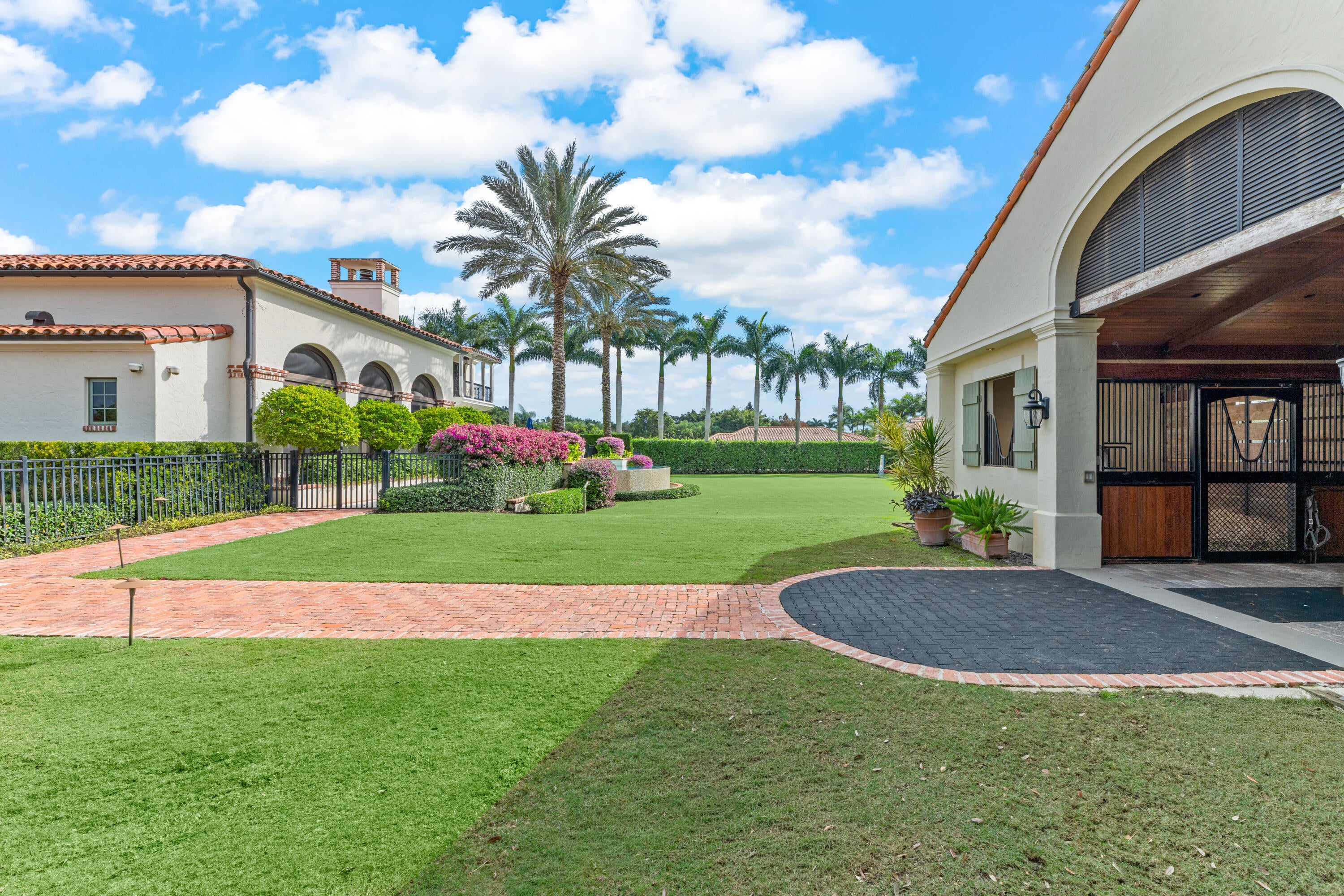 A true masterpiece! Unmatched equestrian estate positioned next to Wellington International horse show grounds. Mere minutes walking to the competition arenas. The main home and owners barn were constructed with the highest quality and finest design. A standing work or art! This Mediterranean style equestrian compound boasts Palm Beach Island level finishes and spans over 4 acres across two lots and includes an exquisite, 11,359 sq ft (7878 sq ft under air), 5-bedroom plus office main residence with a guest apartment, two 8-stall barns, a 3-bedroom staff apartment, an oversized NEW, sub-irrigated riding arena that measures 210x125ft, a grand prix field and 10 paddocks. A rare opportunity to own one of the finest equestrian estate in Wellington.Designed by architect Roger Janssen, the main home features elegant living and dining spaces, a billiards room, office, screened porch, butler's kitchen and well-appointed kitchen and family areas. Upstairs hosts the primary suite and three additional bedrooms. Premium finishes include cypress ceilings, custom cabinetry, hardwood flooring, a full-house generator, Infinity pool overlooking the field and much more.