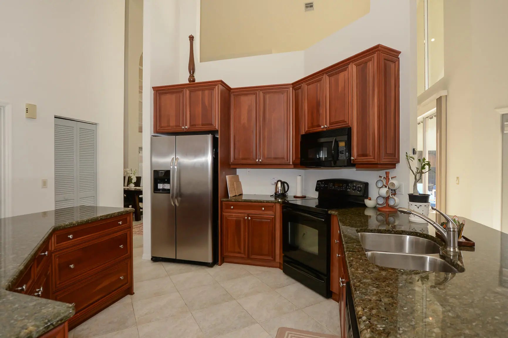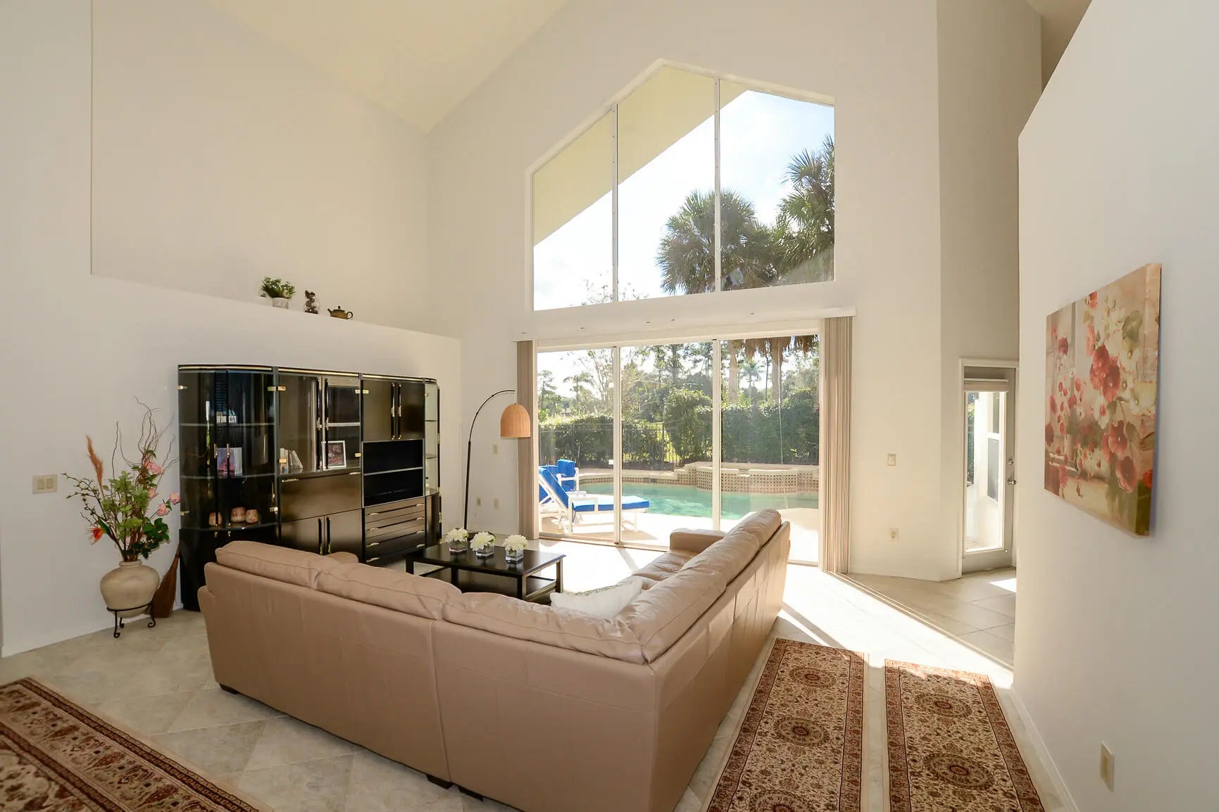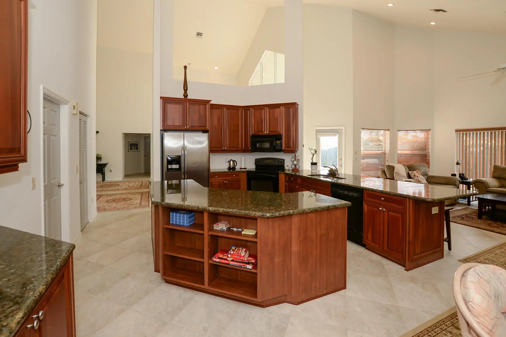 This home does not disappoint, from the soring 25'' ceilings in entry and formal living room to the rich wood cabinets in the kitchen with granite counters. Family room, formal dining, private primary with access to the pool, all overlooking the 11th hole of the St Lucie Trail golf course. Private guest wing has 3 spacious bedrooms and bath. Property can be purchased furnished. Come see this beautiful home located in Country Club estates a mature community of tall pines and majestic oaks.