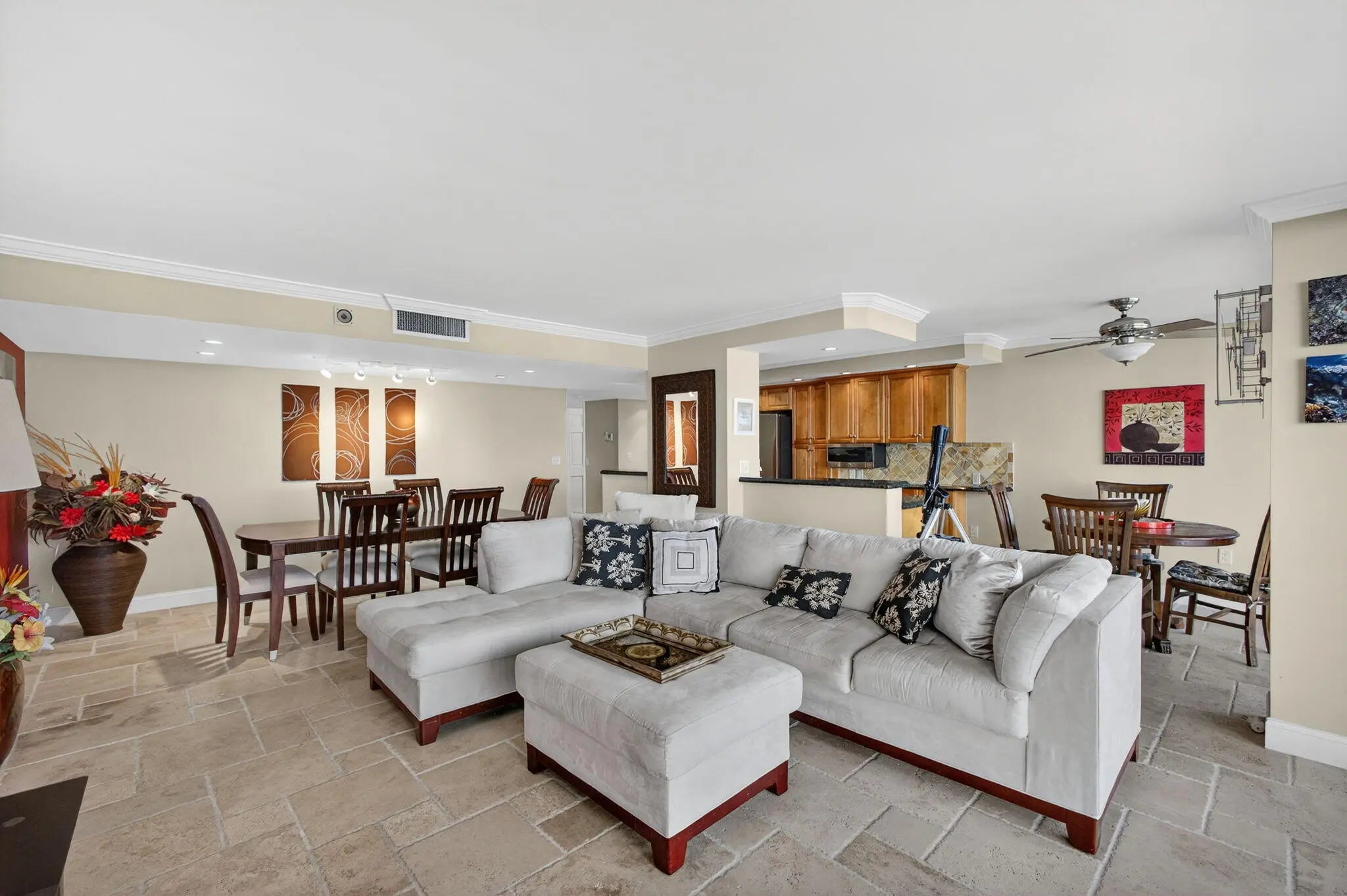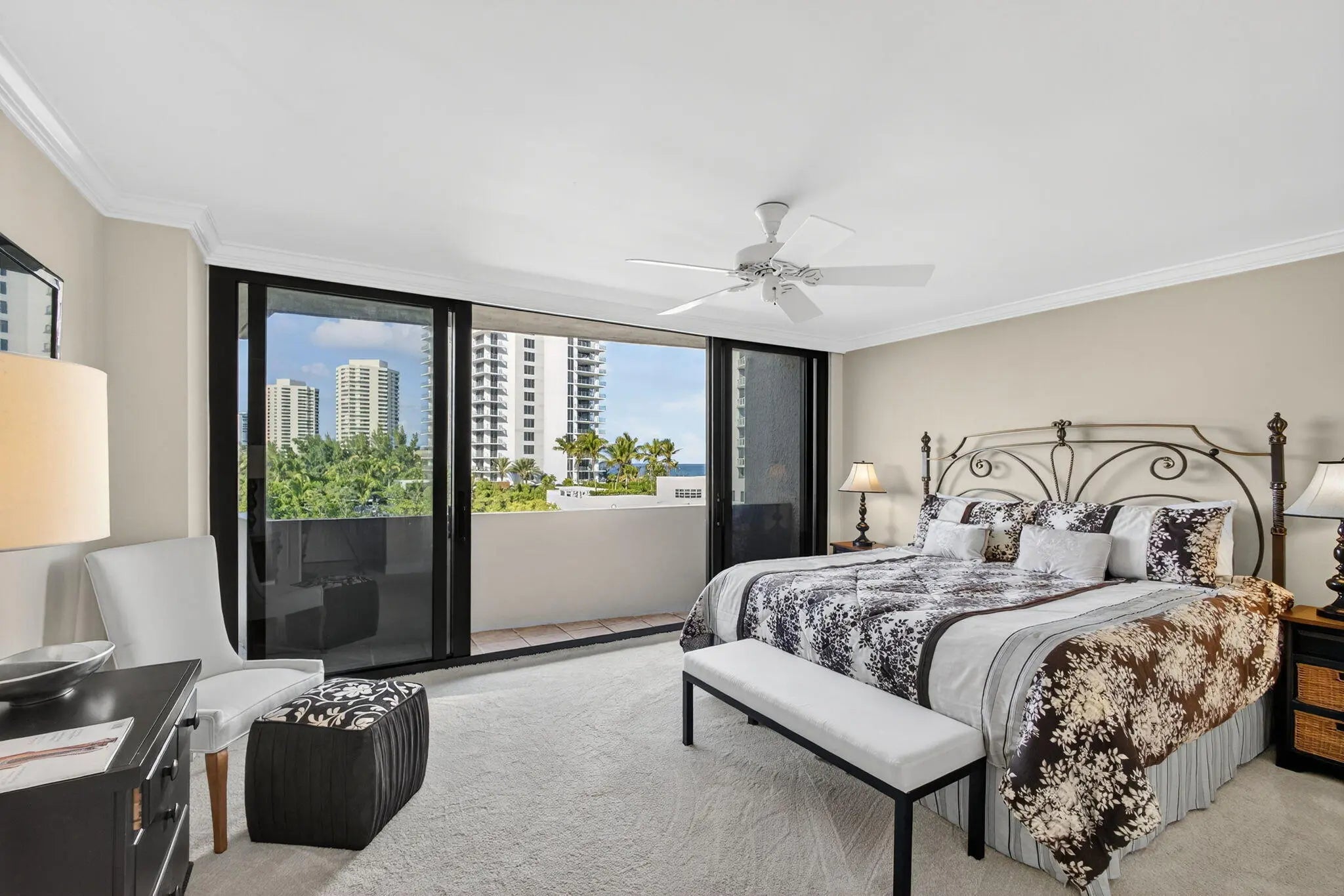 Wake up steps from the sand with friendly neighbors in this turnkey, elegantly renovated, fully furnished 2BR/2BA home with high-quality pieces. This stunning residence offers a sought-after open-concept layout and the desirable north view in Building Two at the Cote d'Azur. . Enjoy dazzling ocean and Intracoastal views from every room and the oversized balcony. Features include tile in the kitchen, hallways, and baths, plus soft carpet in living areas and bedrooms. The kitchen has wood cabinetry and granite counters. The primary suite offers double sinks, granite, a glass shower, and great storage, with walk-in closets in both bedrooms. Coastal living at its finest.