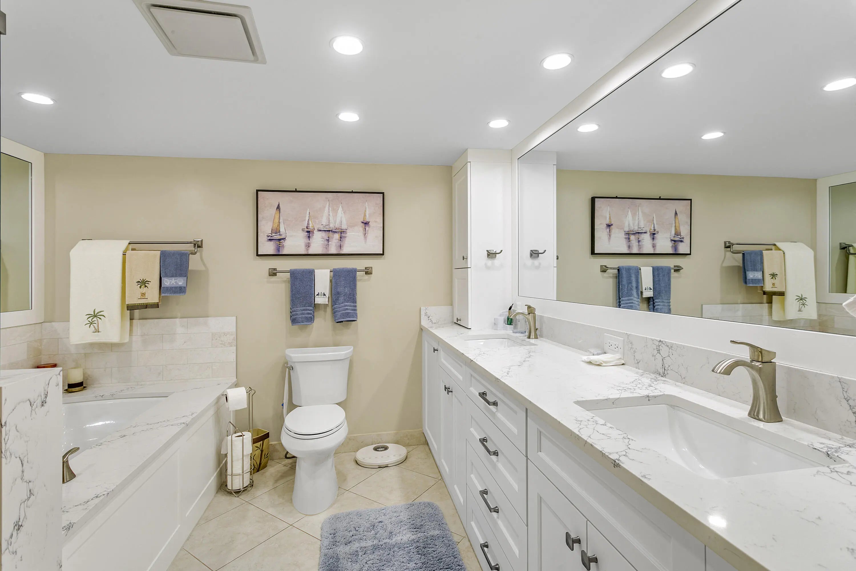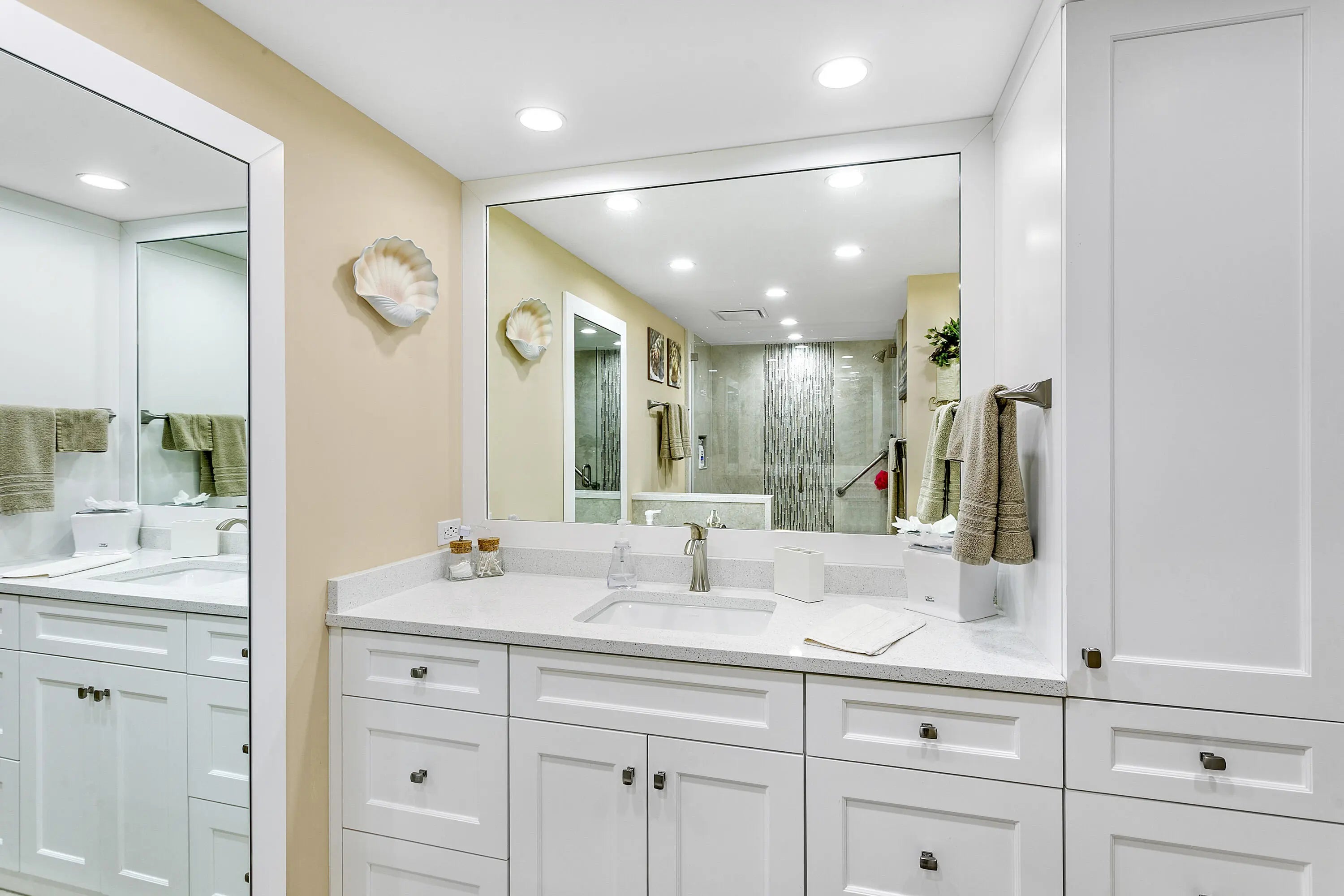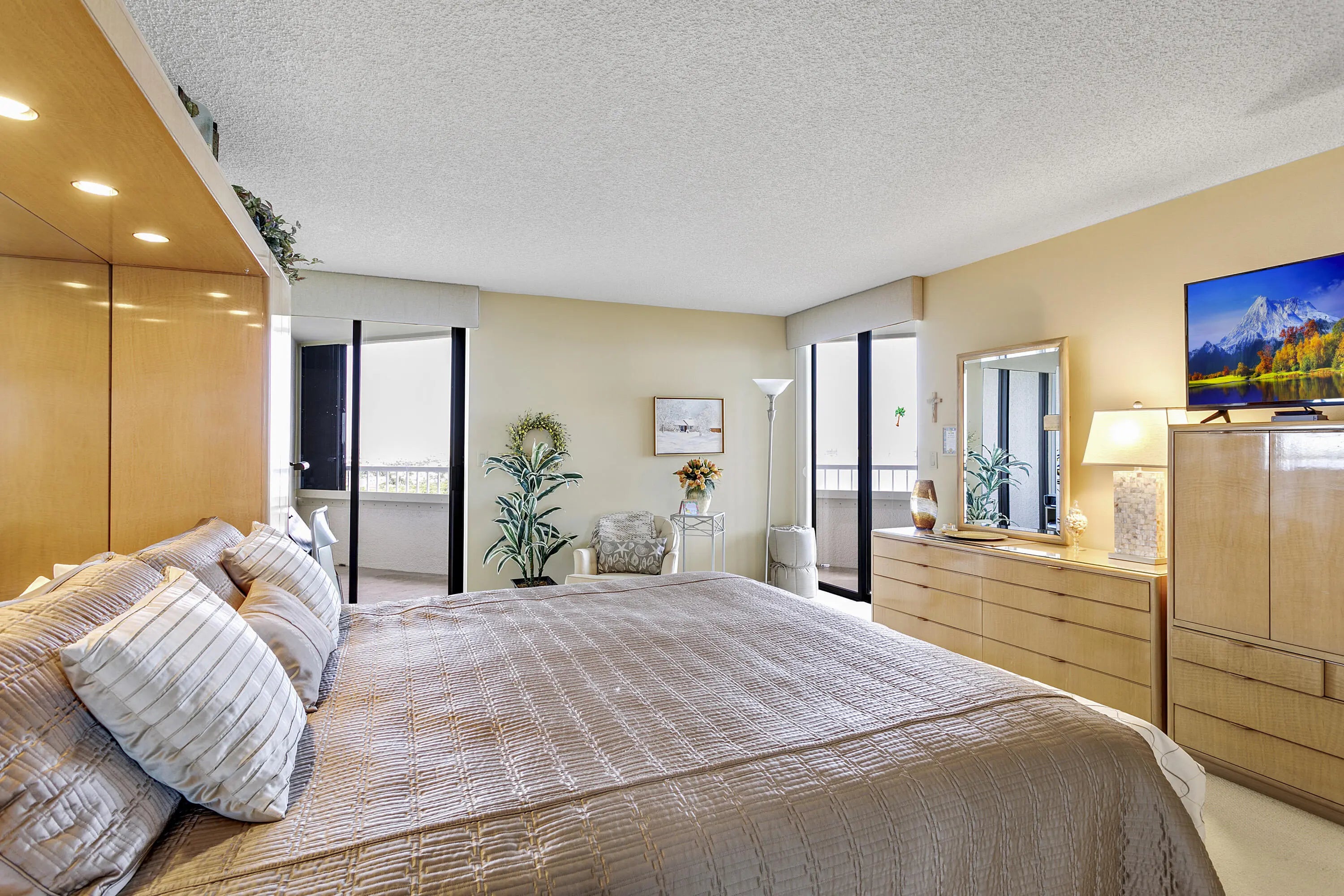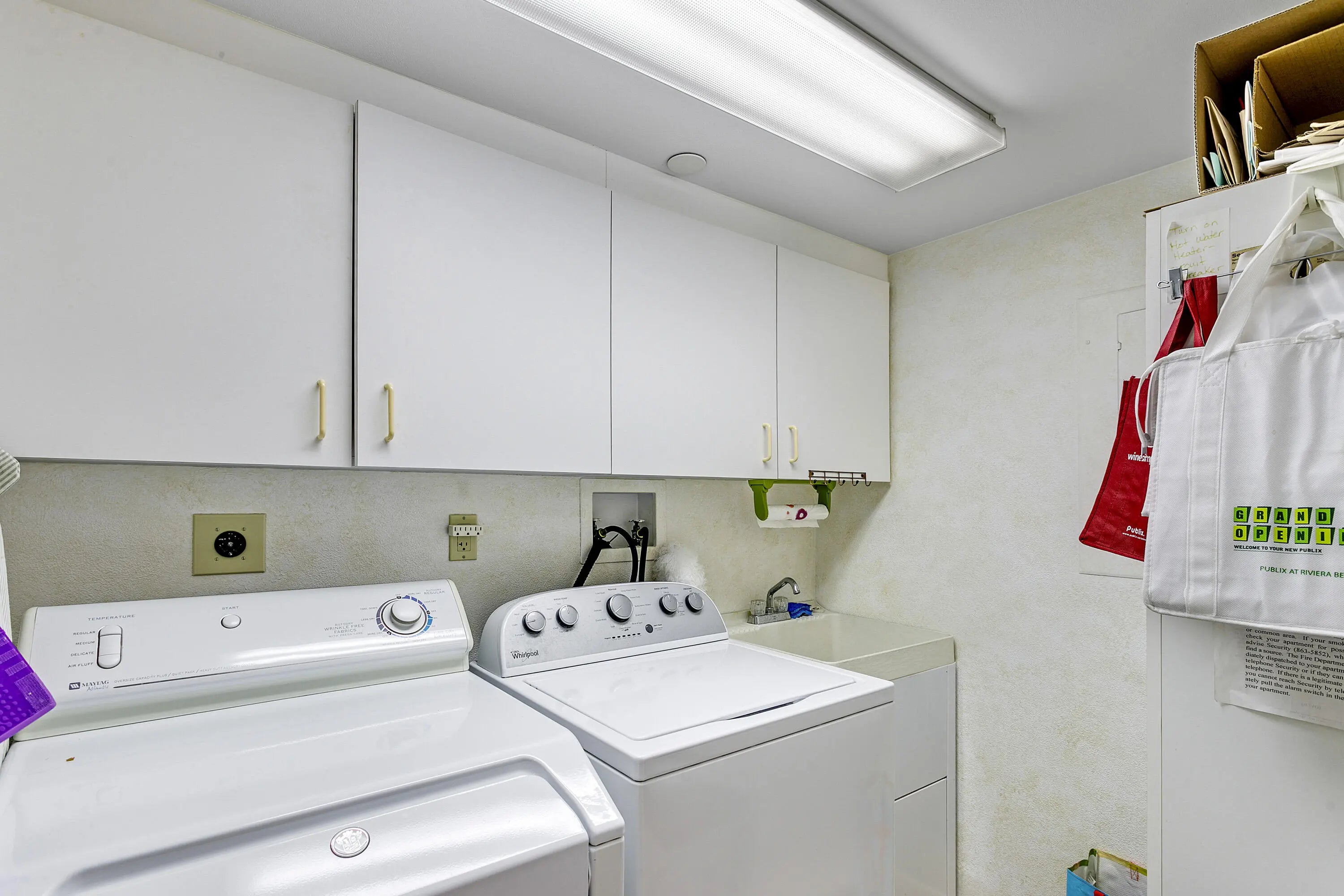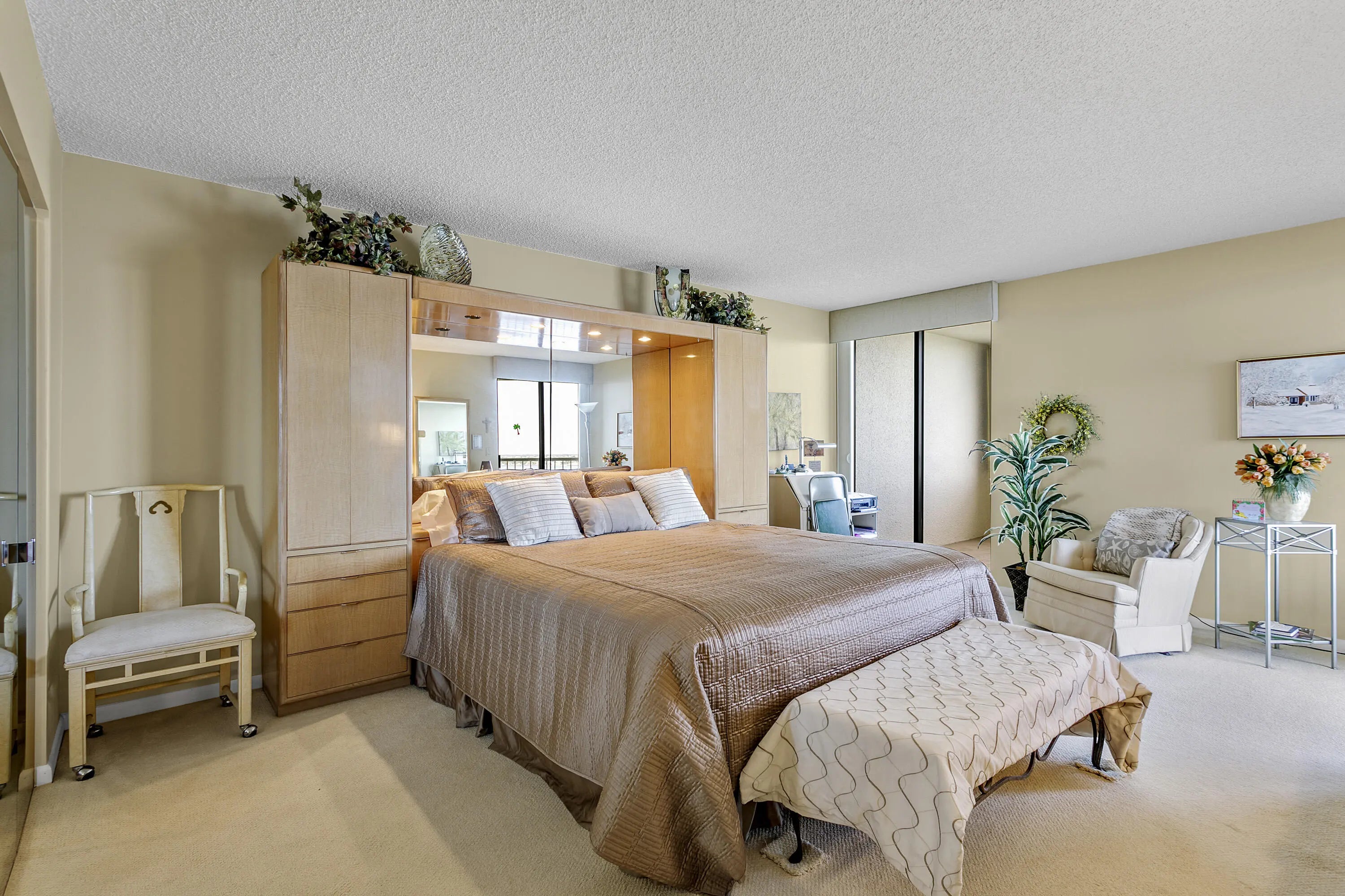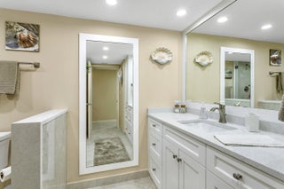 Stylish, pristine, and elegantly appointed, this sunny condo is waiting for you. Modern kitchen and 2 recently completely remodeled bathrooms are perfection. Lots of cabinet space in the kitchen and dining room, large living room with oversized television, comfortable seating, and views from 2 wrap around balconies. The two large bedrooms complete the living space and each room has a water view. You'll love the ensuite laundry with a sink and vented dryer, garage parking, and 24 hour manned gate to greet owners and visitors. Resort amenities cover the 14 acre property. There are two pools, Jacuzzis , saunas, a fitness center, community rooms for social activities, shuffleboard, tennis, pickleball, and a fitness center.