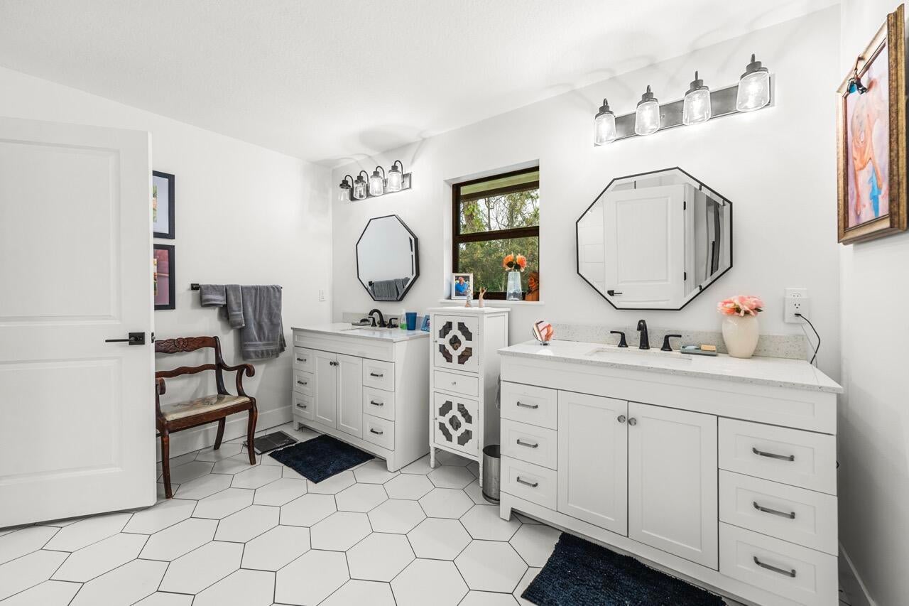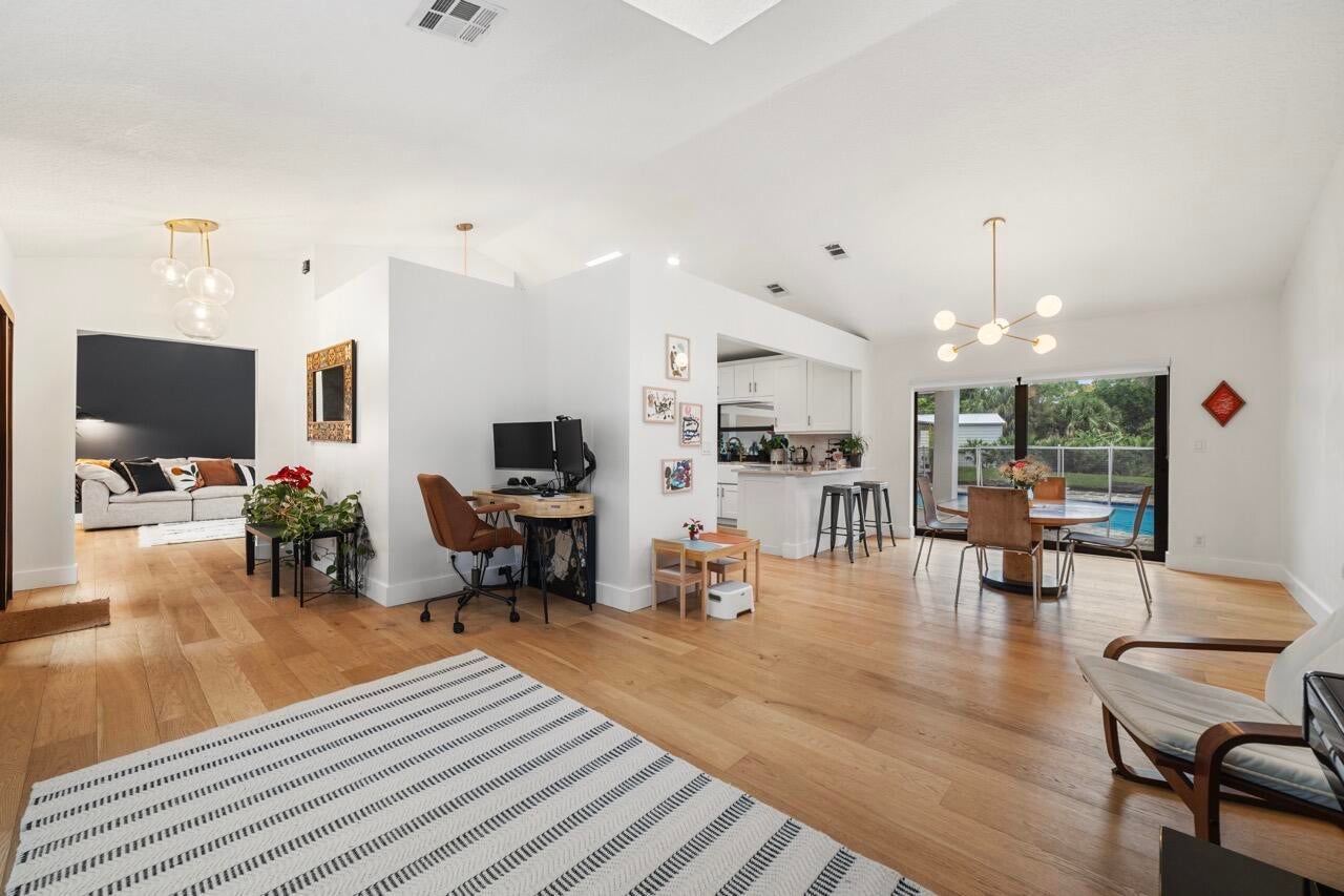 Modern multigenerational house on 1.55 acres with a full 2BR/2BA guest house, pool, 2025 workshop, and solar just minutes to A-rated Jupiter schools. The renovated main home (3,657 SF living) features impact glass, vaulted ceilings, engineered wood flooring, fireplace, sky lights, and an open, flexible layout with den/office, family room, Florida room, and cabana bath. Designer kitchen offers custom cabinetry, pantry storage, and views of the screened, app-controlled saltwater pool & spa.The detached guest house is a true second residence with its own full kitchen, living room, 2 bedrooms, 2 baths, garage, and ADA-friendly layout, ideal for in-laws, adult children, guests, multigenerational living, or rental income. A 2025 detached workshop provides the perfect space for hobbies,storage, trades, or home business needs. Energy-efficient solar with Enphase microinverters keeps utility costs low (transferable warranties). Full impact protection, metal roof, fenced grounds, fruit trees, and plenty of space for RVs/boats. No HOA. Minutes to Indiantown Rd, parks, dining, Publix, and Jupiter amenities. Ask for the full upgrades list, solar report, and virtual tour.