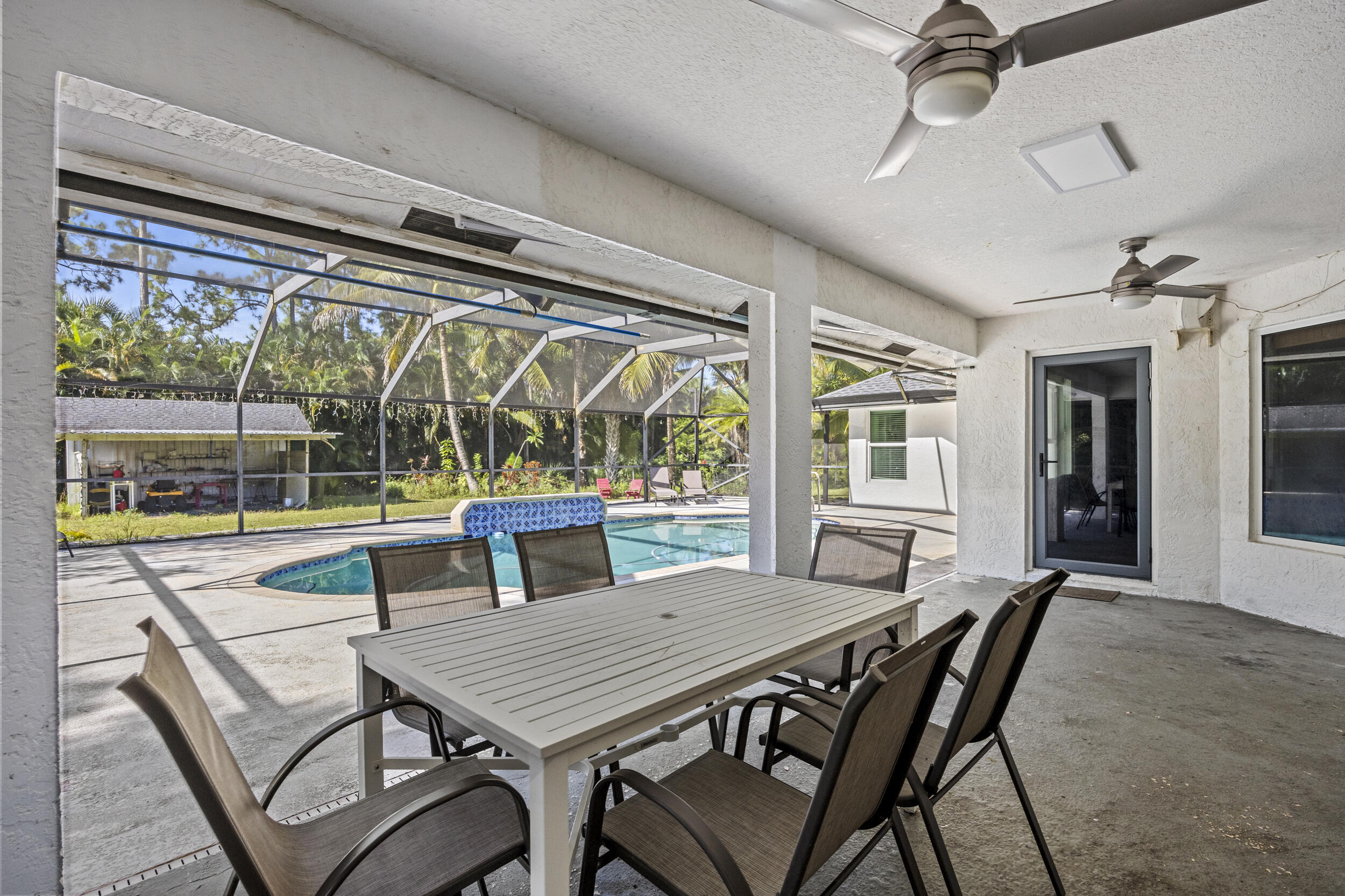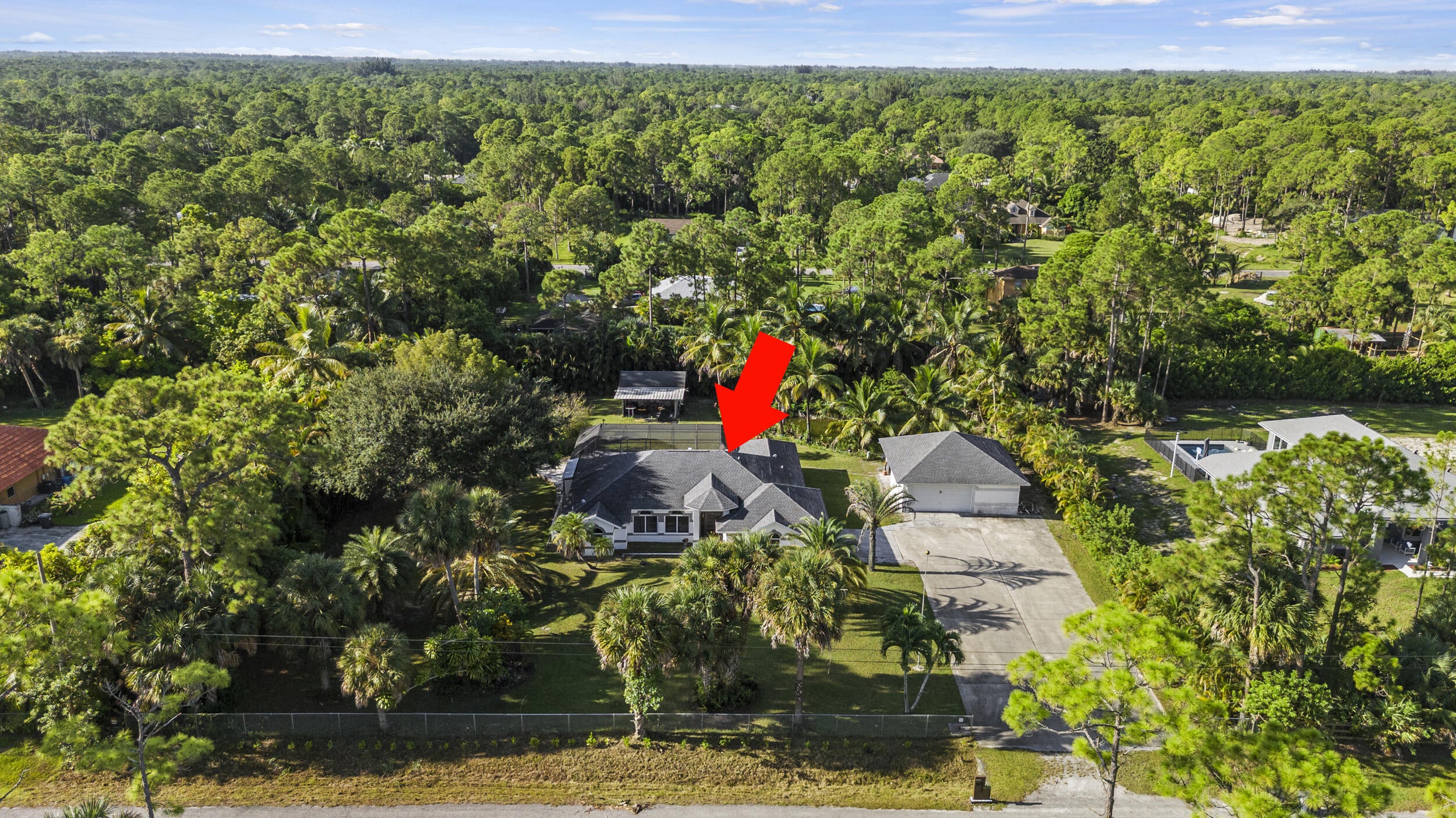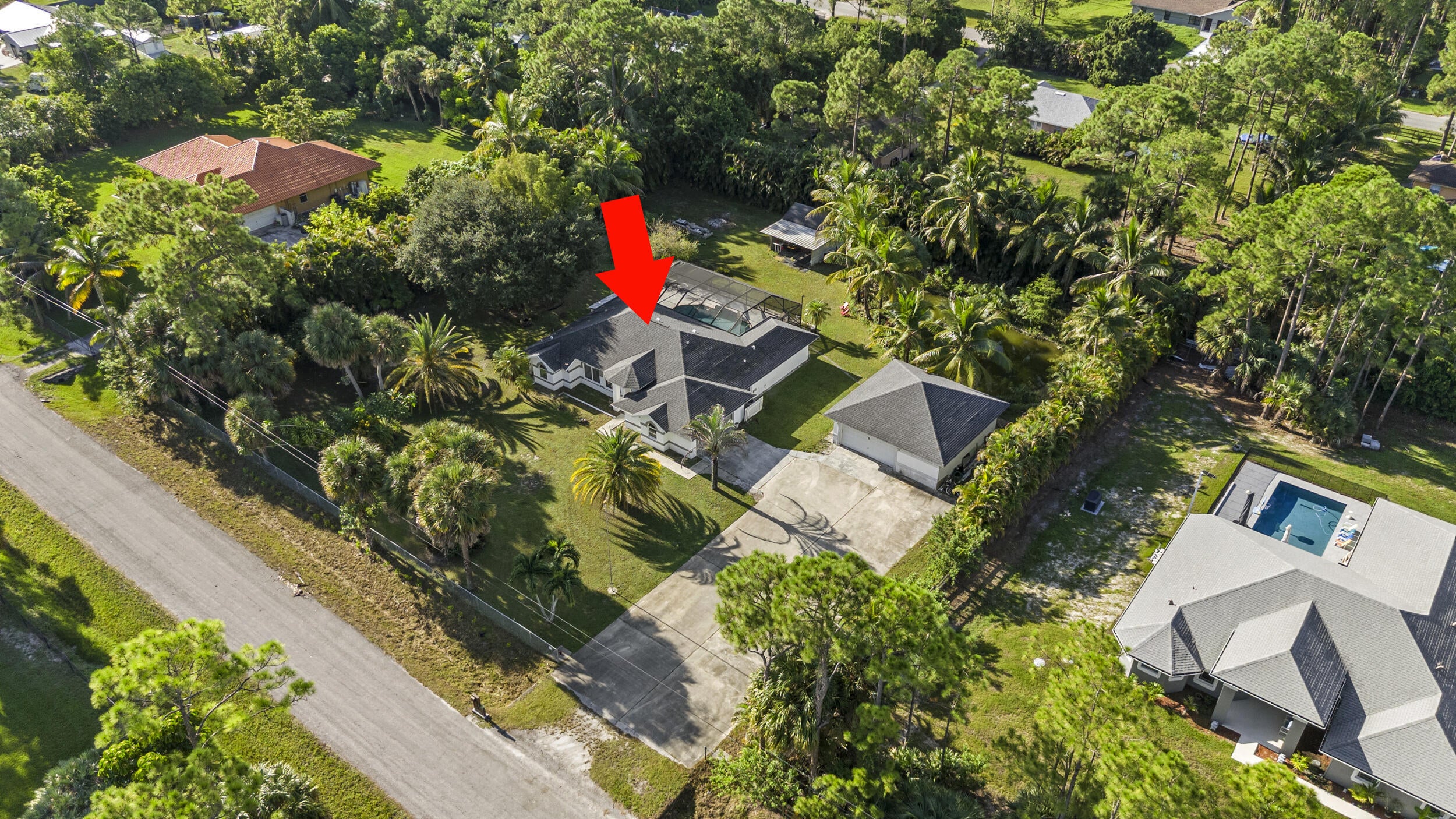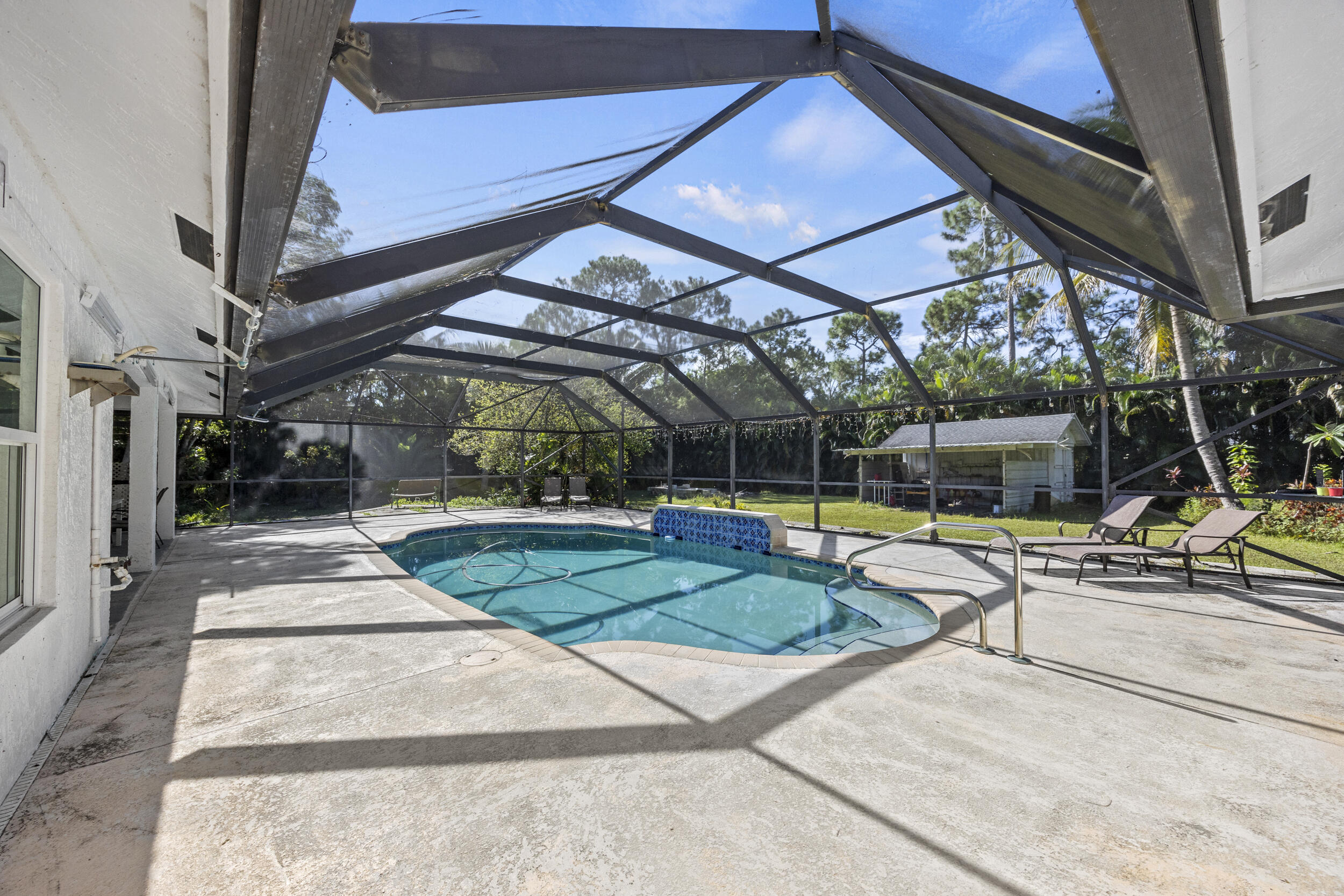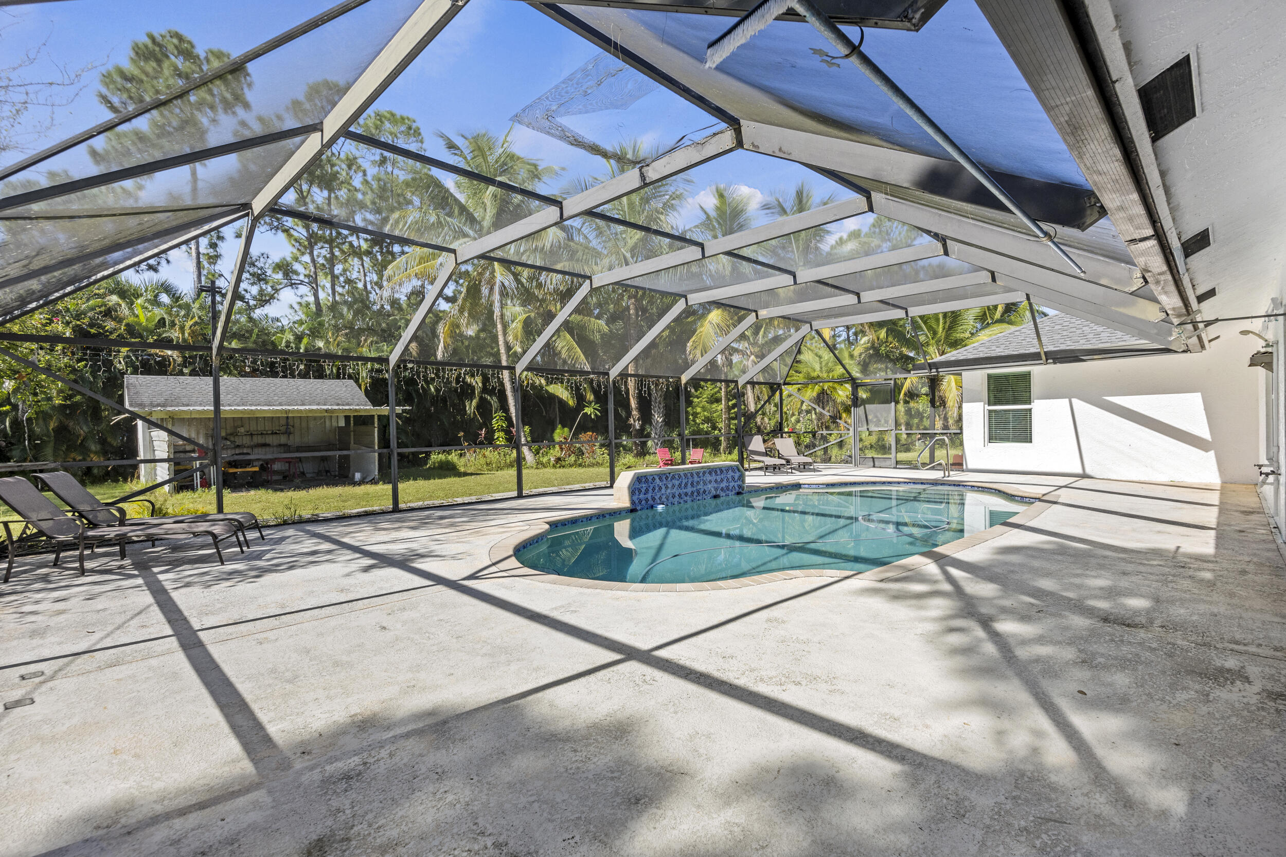 Well maintained 3 bedroom, 2 bathroom, Pool home located on 1.14 acres in the heart of Loxahatchee, only minutes from Westlake, Avnir, gas stations, and shopping centers. The property features an attached 2 car garage + a 900 sq ft detached 4 car garage, impact rated doors and windows, newer roof, newly renovated kitchen that opens to bring living spaces, cathedral ceilings, screened pool and back porch, extended driveway, and paved road. The property also includes a separate shed, a serene pond, and ample room for gardening and/or raising animals, including horses. With NO HOA restrictions, you'll enjoy the freedom to bring your boat, truck, trailer or RV. The detached garage can be turned into a workshop area or possibly a guest house. This property offers the perfect blend of privacy,functionality, and Florida country living. Make this lovely house your forever home today!