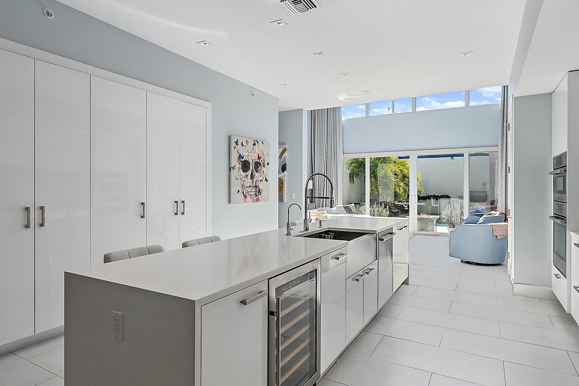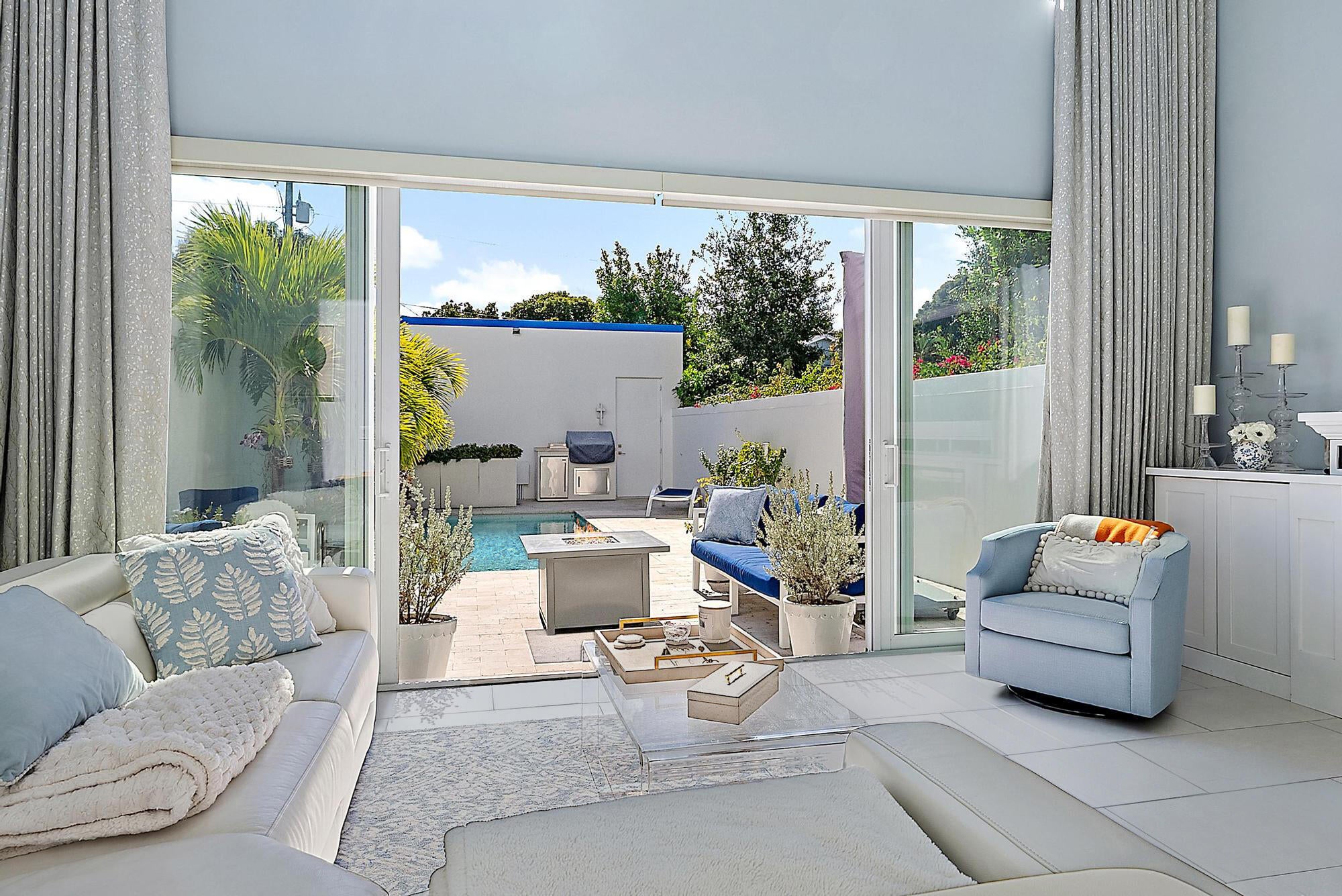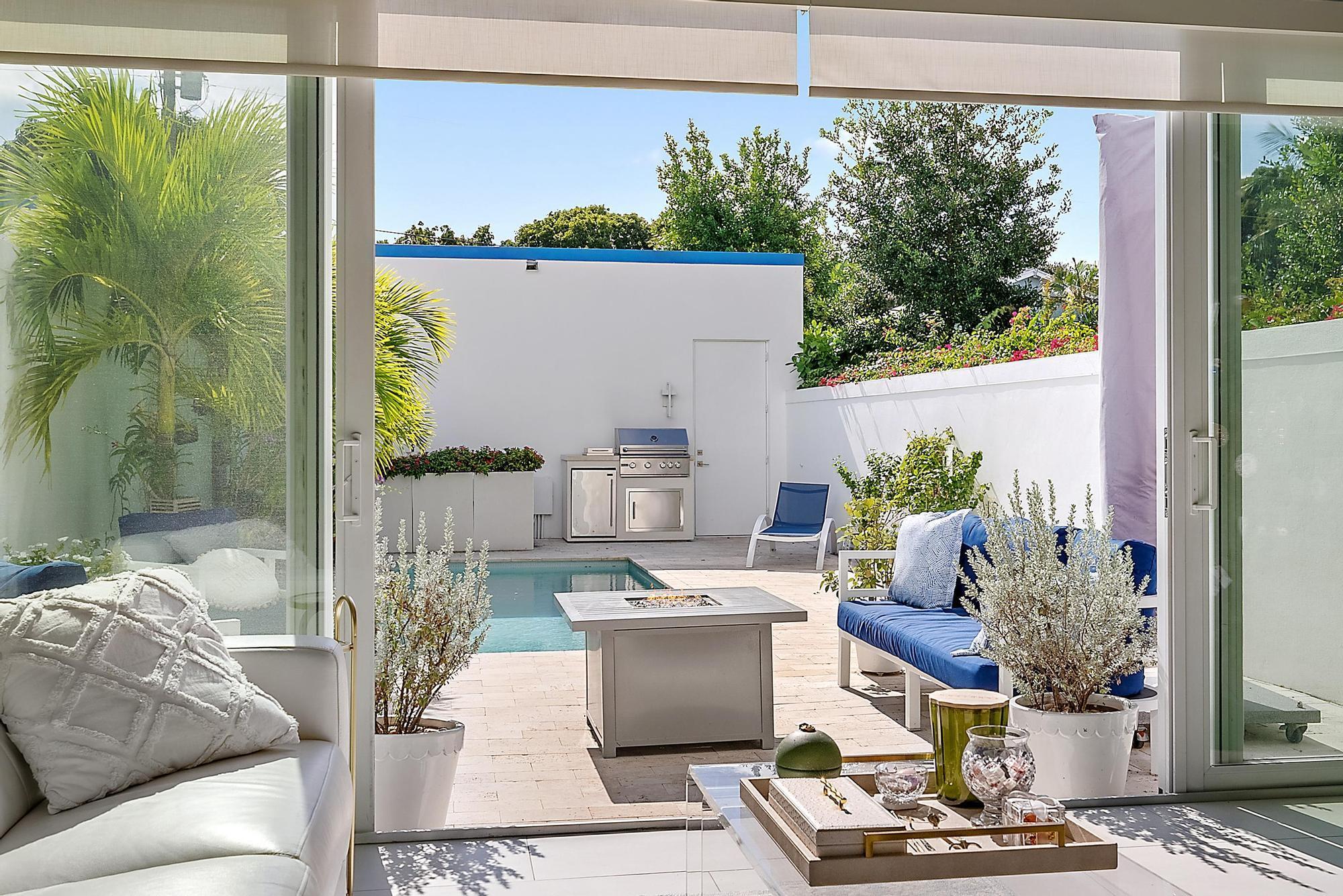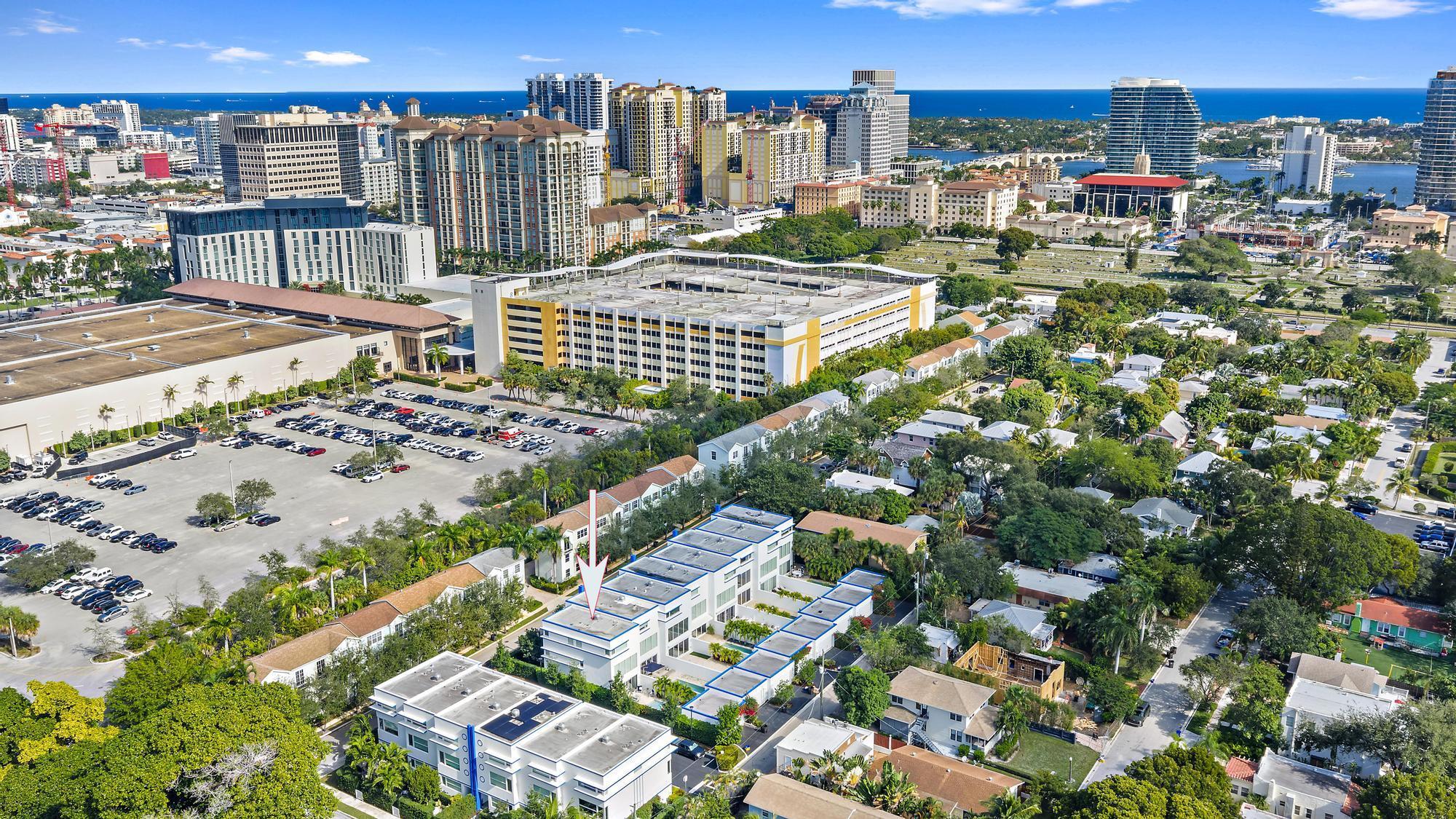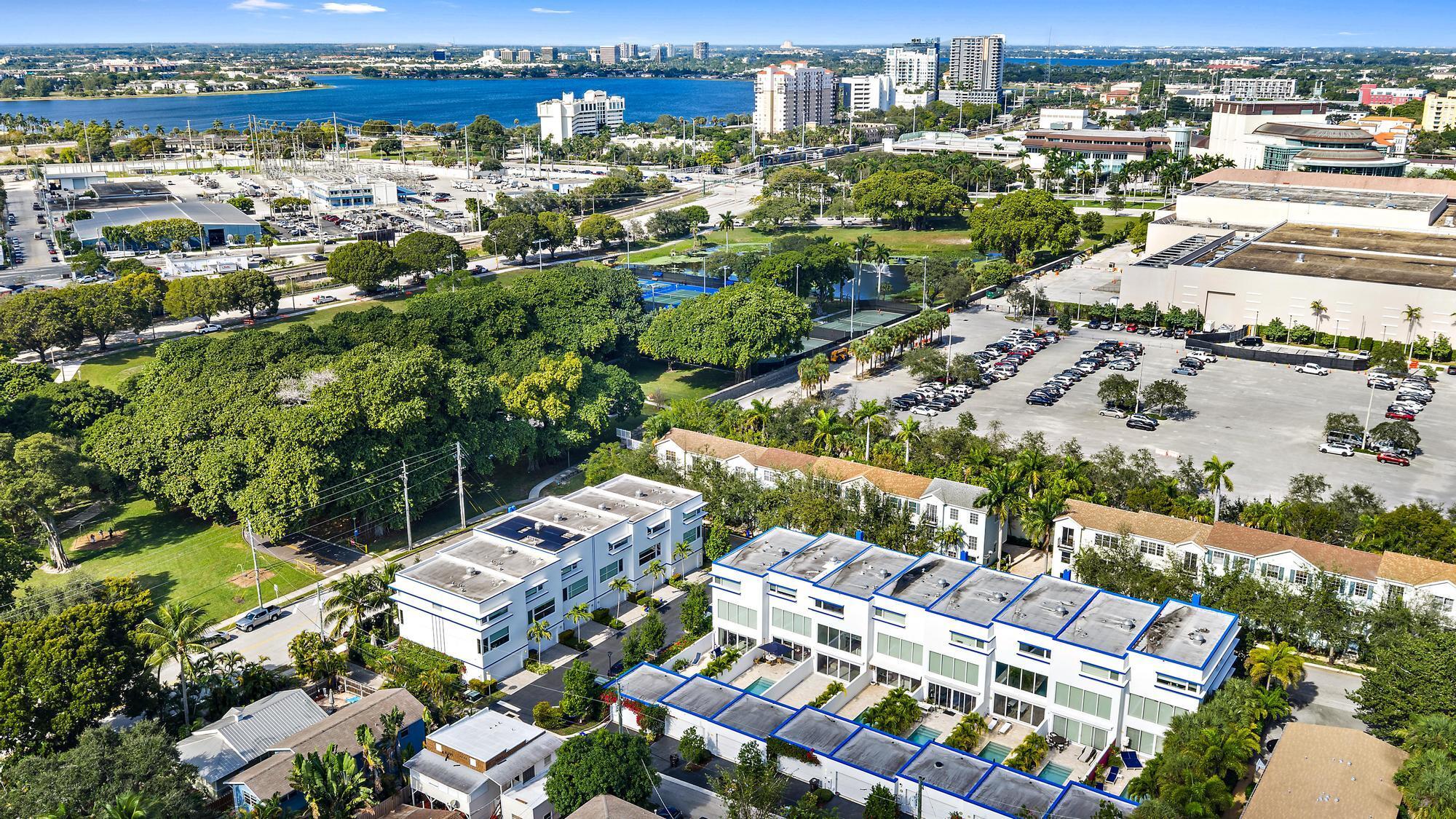 Combine the vibrancy of downtown living with the comfort and privacy of suburbia in this boutique luxury townhome community. Tucked within the historic Grandview Heights District, Park Slope consists of just 14 exclusive Art-deco-inspired residences. This corner unit has been meticulously upgraded from top to bottom with high-end enhancements throughout. Recent improvements include: a 2024 heated pool pump, 2024 polyurea concrete floor coating, 2023 AC systems with new drain lines and UV lights, new 2025 turf, driveway retaining wall, Wi-Fi-enabled thermostats, oversized internet panel, August smart lock, RO water filtration dispenser, pot filler, motorized shades, custom designer window treatments, bespoke kitchen backsplash, custom closet systems, Haiku living room ceiling fan,and over $20,000 in designer blinds. Step inside to soaring ceilings, abundant natural light, and a spacious open layout. To the right, a casual dining area flows effortlessly into the expansive chef's kitchen. The modern, sleek kitchen features white seamless soft-close cabinetry, Bosch appliances, a Thermador panel-ready refrigerator, gas range with Zephyr hood, pot filler, designer tile backsplash, and a built-in wine fridge. The generous living room impresses with 20-foot ceilings, motorized drapes and shades, and a serene view of the private back patio. A stylish main-floor powder room adds convenience for guests. The second-floor primary suite offers a true retreat, complete with dual walk-in closets with custom built-ins, custom blackout draperies, and a spa-like en-suite bath. The bathroom showcases a soaking tub, frameless walk-in shower with floor-to-ceiling designer tile, double sinks, and Moen fixtures. The third floor hosts two additional guest suites, each with its own en-suite bathroom featuring plantation shutters and frameless walk-in showers with full-height tile. Your private outdoor oasis is ideal for entertaining, boasting a travertine pool deck, saltwater system, 6-foot privacy wall, lush landscaping, and plenty of room to grill or unwind in the Florida sunshine. A newly turfed front courtyard surrounded by mature privacy hedges provides an additional peaceful escape and a charming entrance. Residents of Grandview Heights enjoy walkable access to the endless amenities of downtown West Palm Beach. Just minutes from the beach, Worth Avenue, Palm Beach International Airport, I-95, and the city's premier dining and nightlife, this exceptional home offers luxury living in one of the area's most desirable urban neighborhoods.