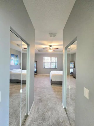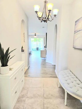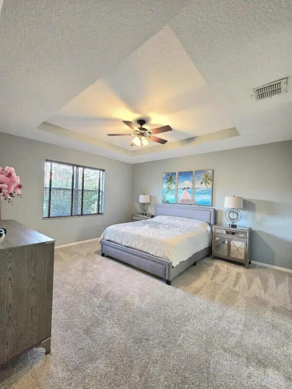This charming gated community home is located in the desired neighborhood of Heritage Oaks at Tradition. The bright and spacious floor plan throughout the living and dining room combo is ideal for relaxing or entertaining and just off the large covered lanai. The kitchen nook is an inviting area to enjoy the views and/or create your coffee bar or lunch area. Upgraded white cabinets and countertops with all stainless steel appliances. Split bedrooms with upgraded vinyl flooring throughout and carpets in the bedrooms. The Master Bedroom has a tray ceiling that gives a you a spacious feel with 2 walk-in mirrored closets and dual vanities in the bathroom and a large shower and soaking tub.