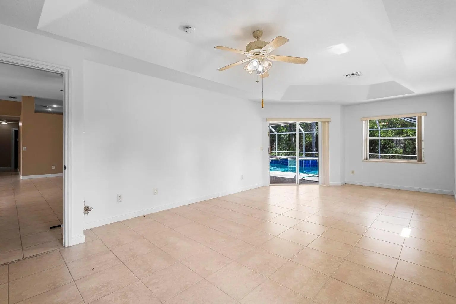 Three bedroon two bath with a den/office/4th bedroom. Cul de sac location. Screened lanai over the heated pool and spa. Formal Dining Room. 2016 A/C. Golf cart parking in garage.