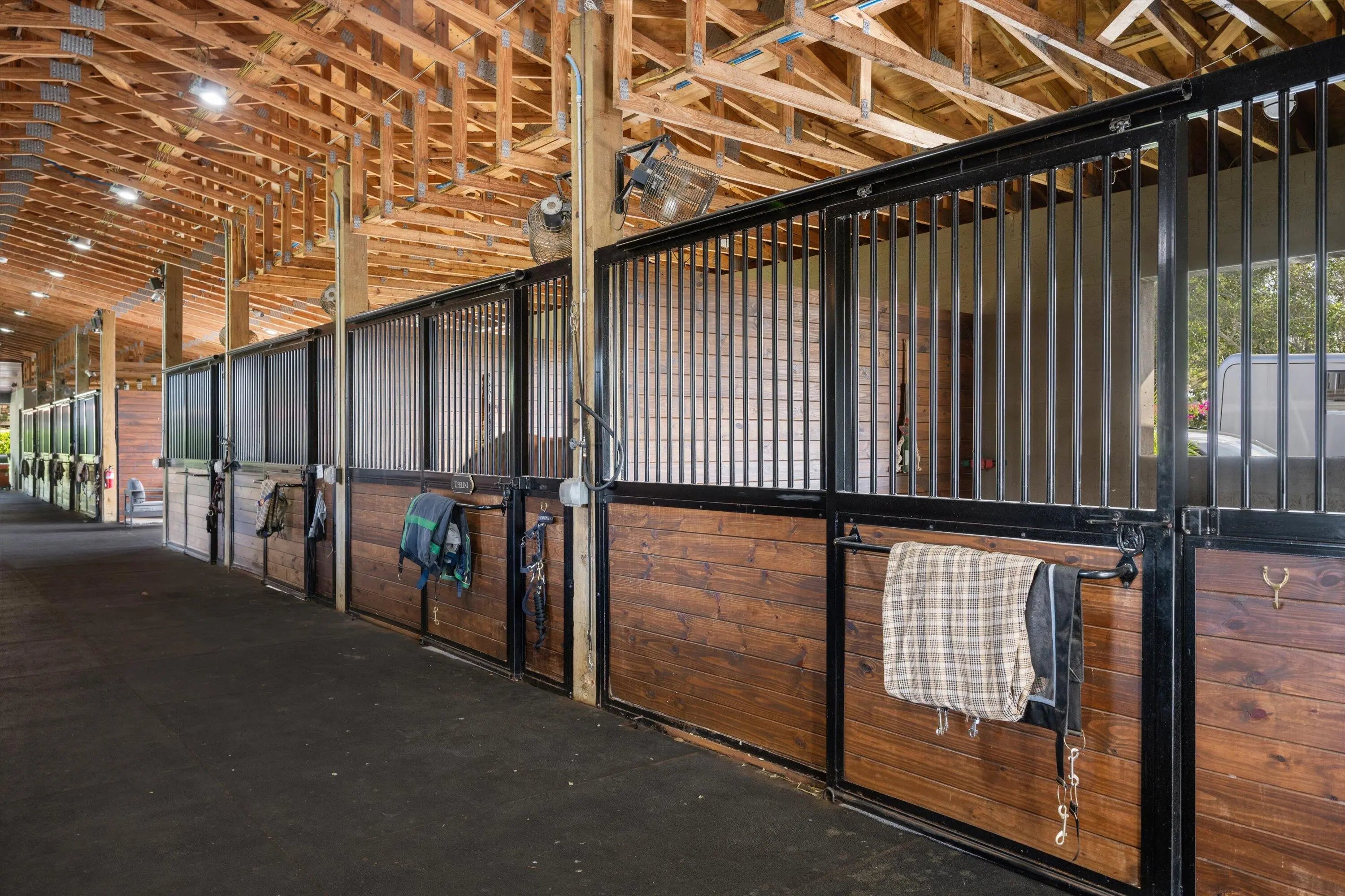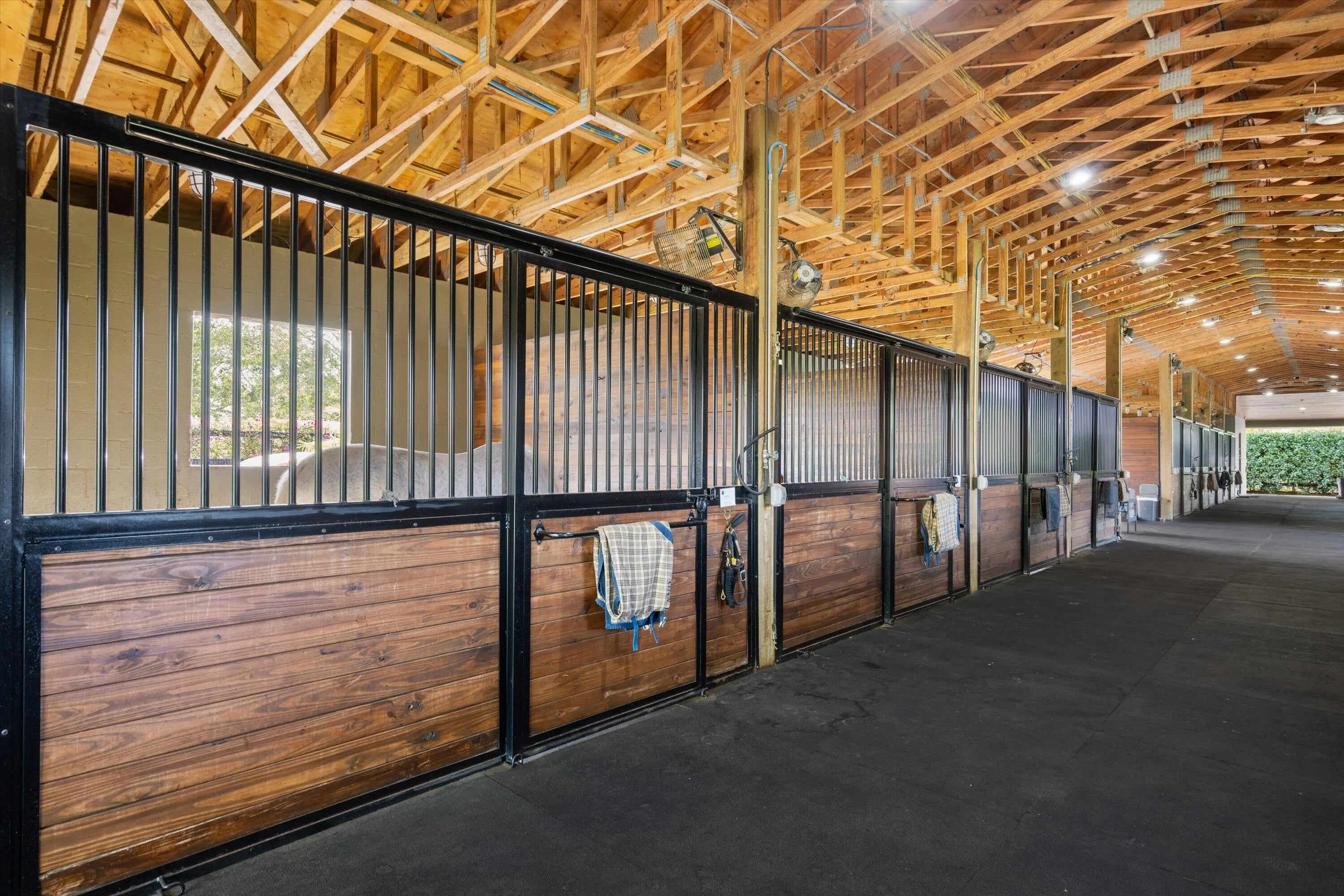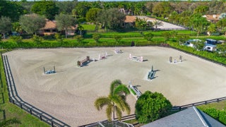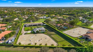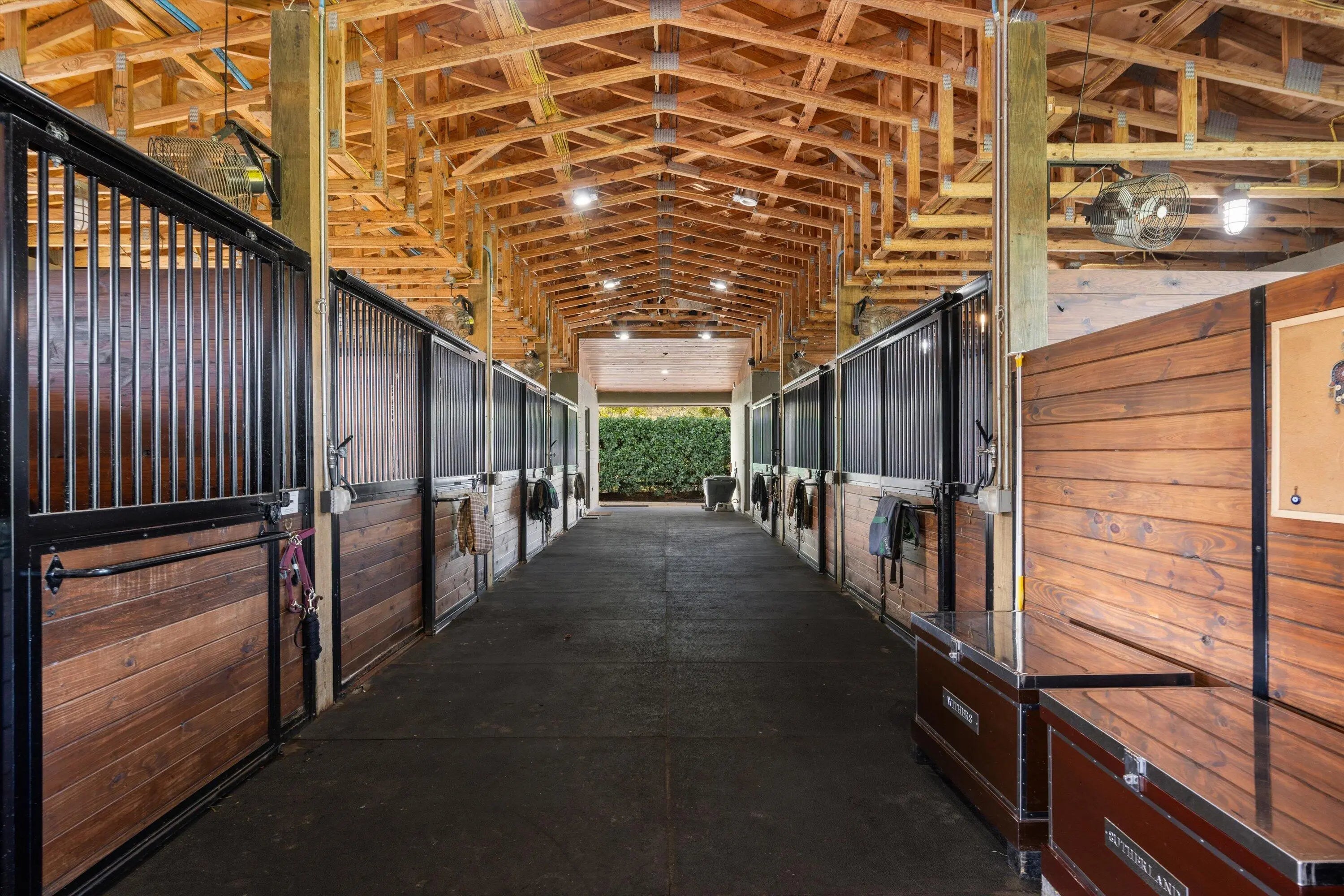 Beautifully renovated property with new roof, impact windows/doors, updated HVAC, LED lighting, 26kW generator, 4K security system, and new gates. Features a remodeled GE Cafe kitchen, luxury master suite, upgraded baths, saltwater pool, UV water system, new well pump, enhanced irrigation, new garage door/flooring, and water heater with booster. Two updated guest/grooms' quarters include HVAC, kitchenettes, and private baths. Equestrian amenities include a 2021 CBS barn with fly system, A/C tack/feed room with bath, four wash stalls, hay storage, an all-weather Premier ring, six paddocks. 2.15-acre property is located right on the bridle path and is a short hack to the show.