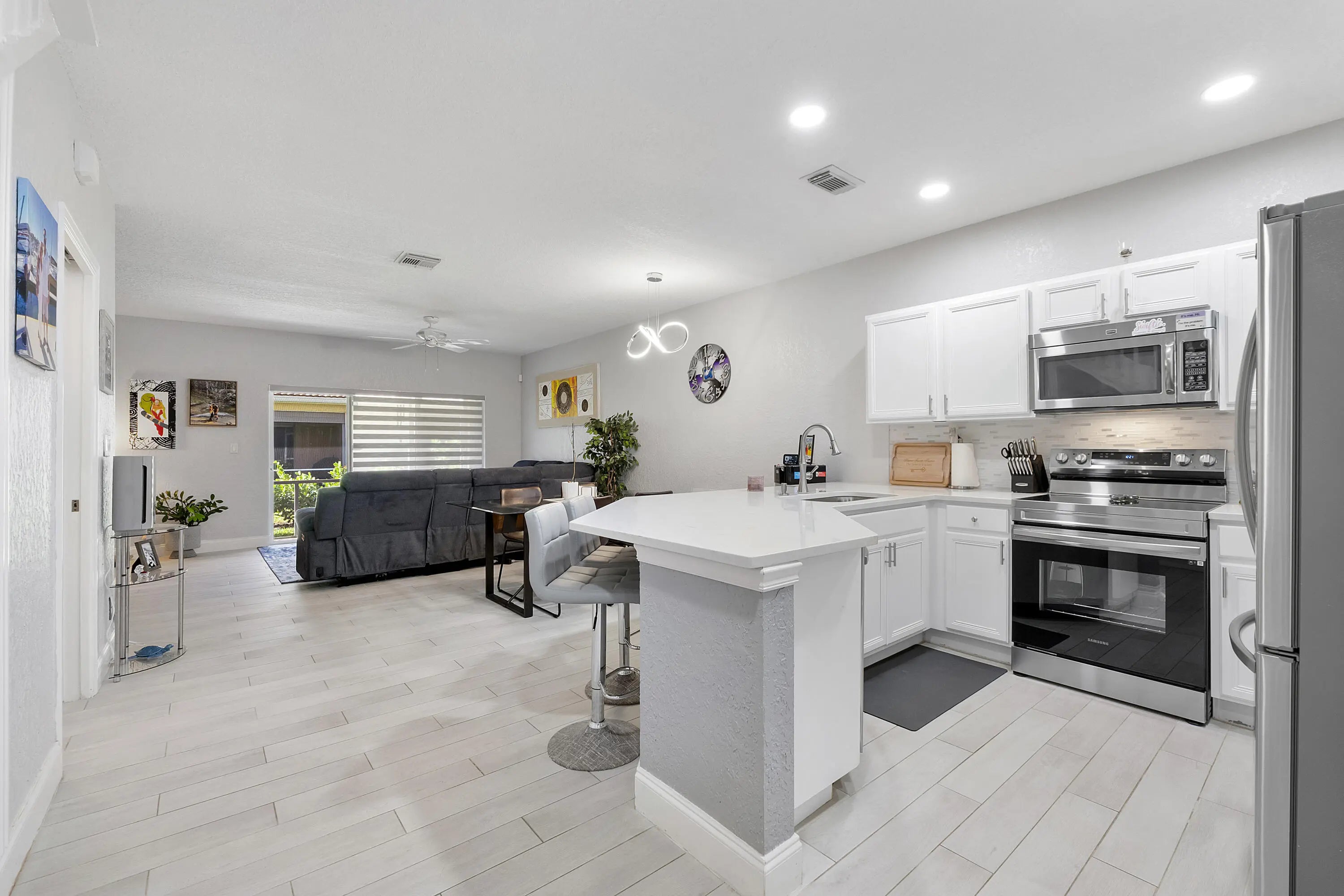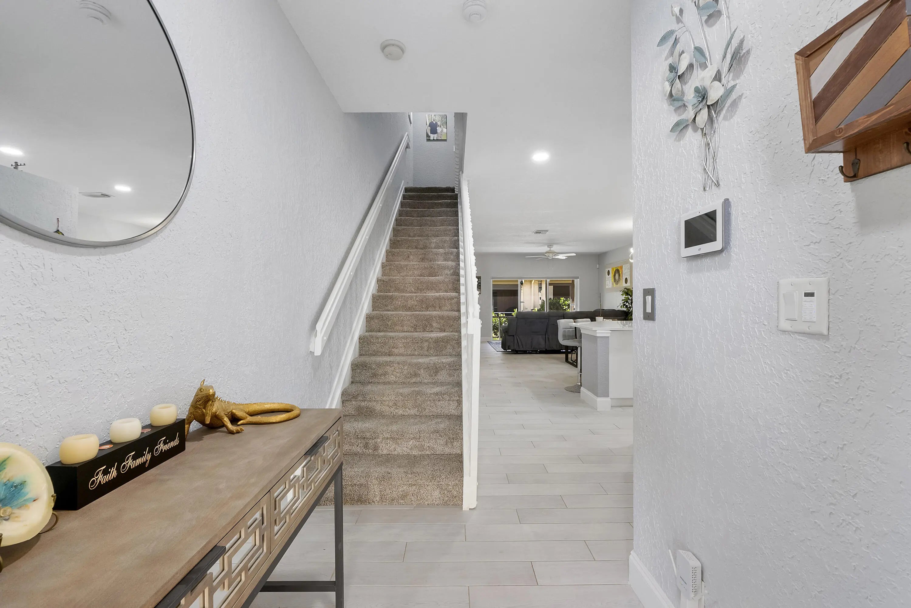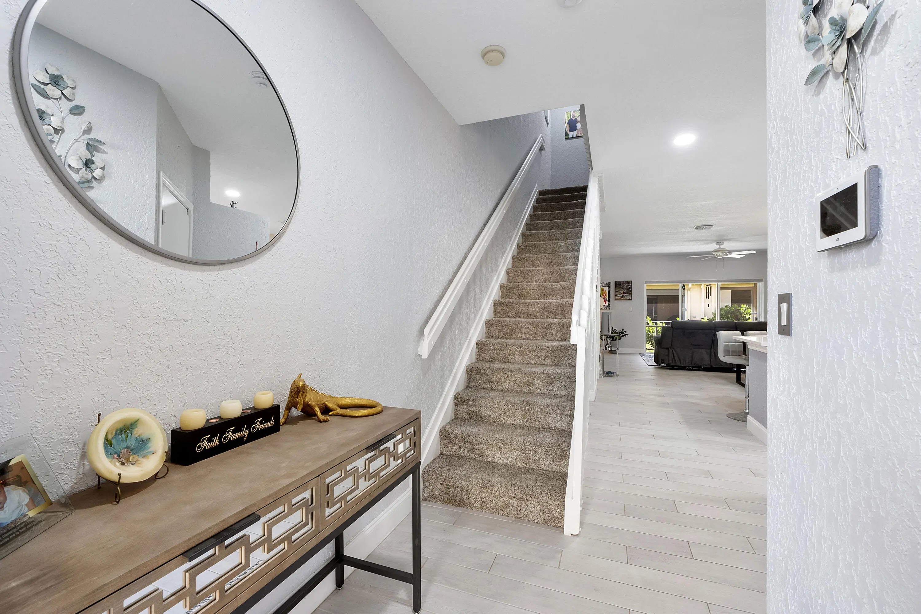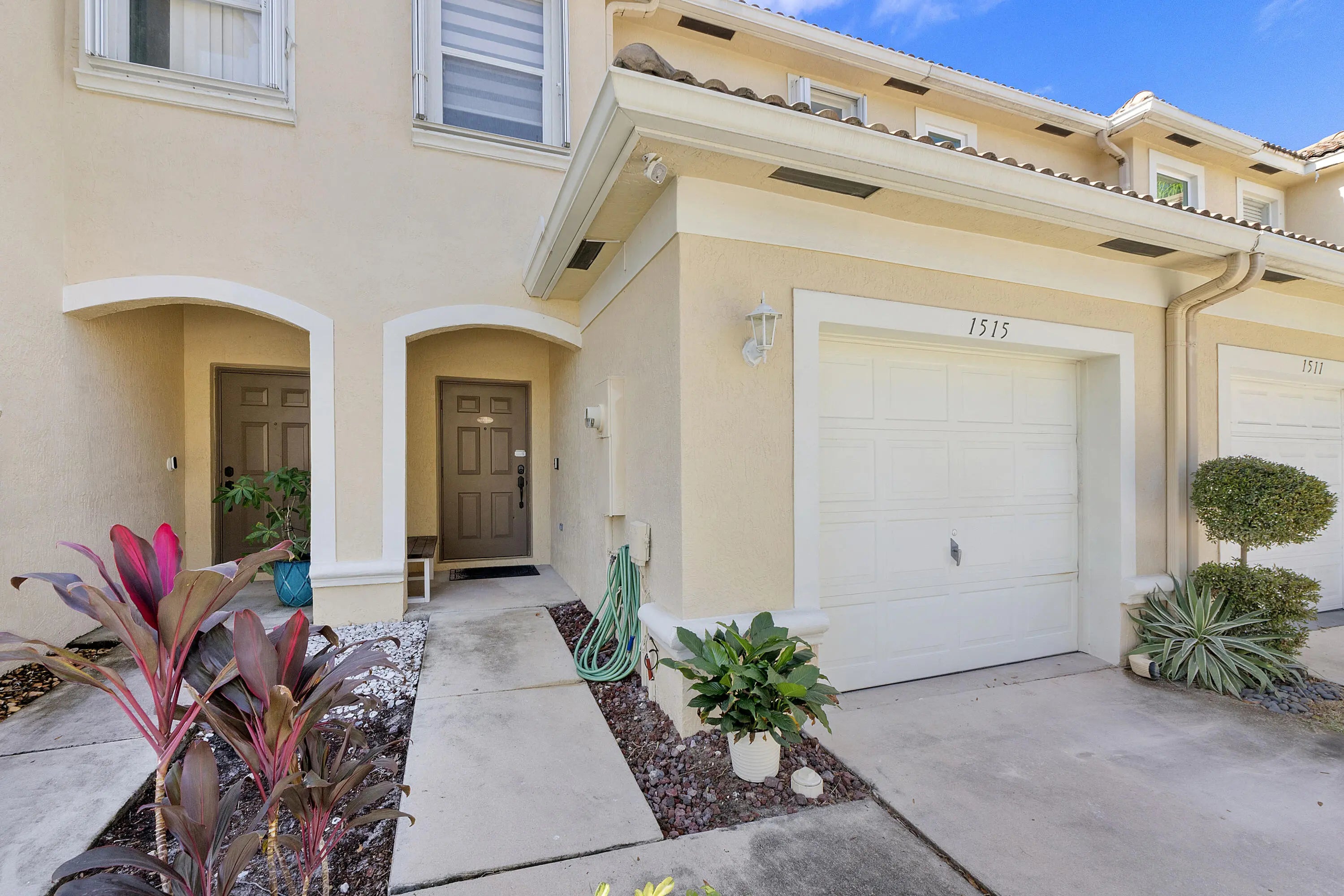 Welcome to your new happy place in the charming Towne Place. All hurricane protection. This spacious townhome features an updated open concept tiled first floor including a newer remodeled kitchen with SS appliances. Large countertop for easy entertaining. Pantry too! Half bath for guests as well. Enjoy screened patio (with storage) off the large open living room, for morning coffee or evening refreshments. Newer luxury window treatments. Upstairs boasts 2 large bedrooms with private bathrooms. Ample sized loft/flex room for office, BR or workout area. Primary suite includes a generous walk-in closet and brand new carpeting. Home includes one car garage, steps to community pool. Minutes to shopping, entertainment and top rated schools. Enjoy everything Equestrian in the city of Wellington