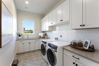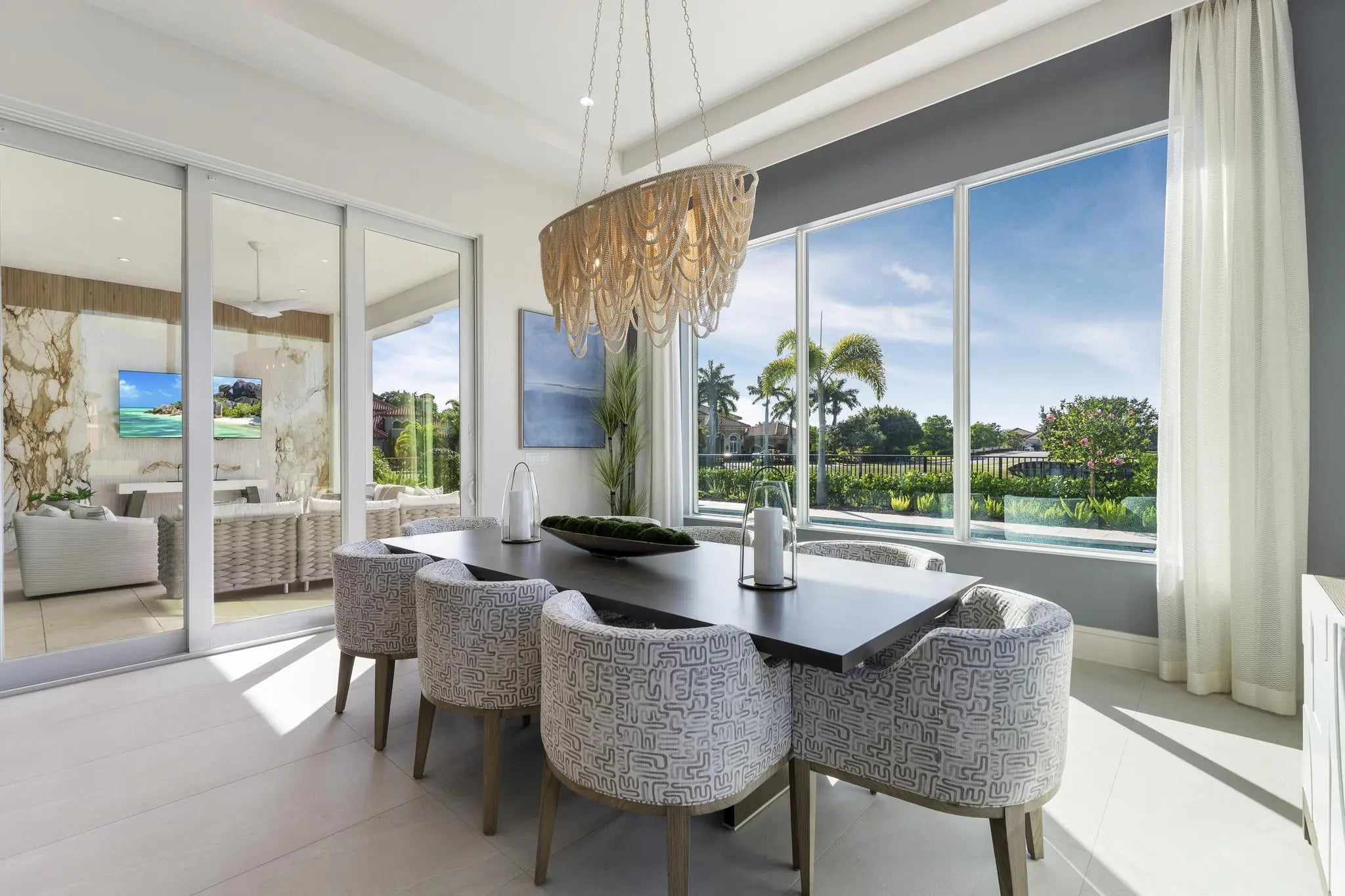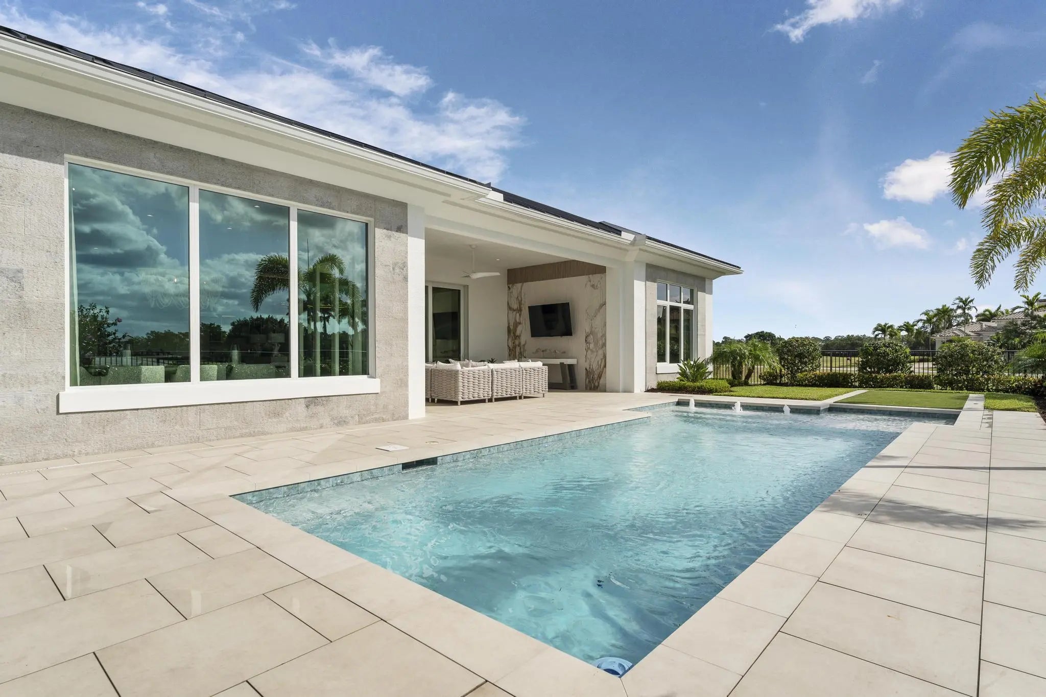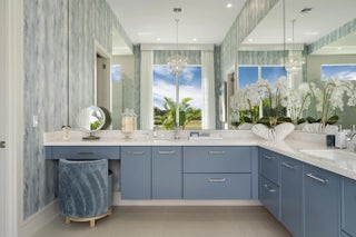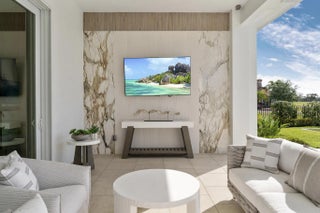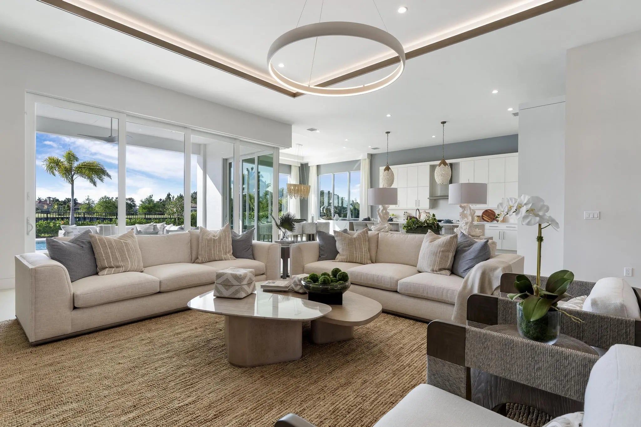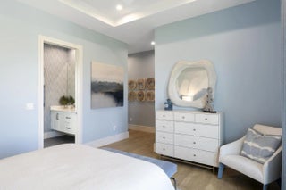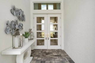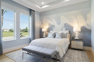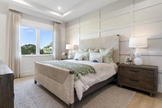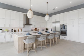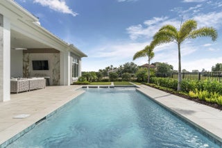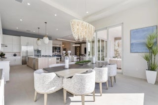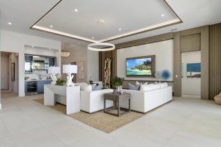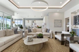 Beyond the gates of Tesoro awaits a lifestyle of luxury in this stunning model home by Ecclestone Signature Homes. Featuring three bedrooms plus a flexible den, the residence offers sweeping golf course and water views, premium upgrades, and designer finishes throughout. The Coastal Modern open floor plan boasts soaring ceilings and seamless indoor-outdoor living, highlighted by a spacious patio with a custom TV wall. Impact windows and doors add peace of mind, while the home's impeccable decor curated by a renowned South Florida designer completes this exceptional offering.