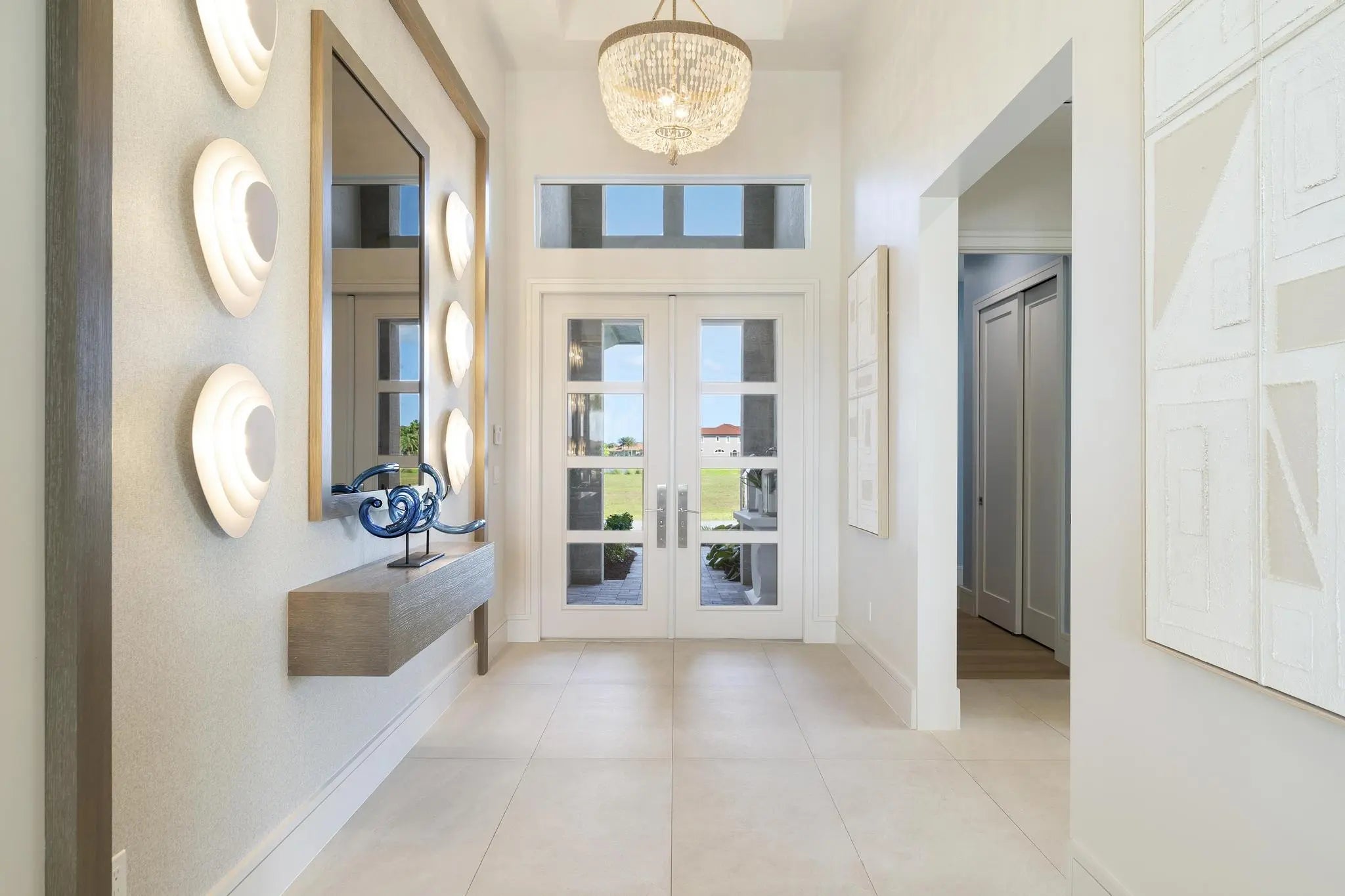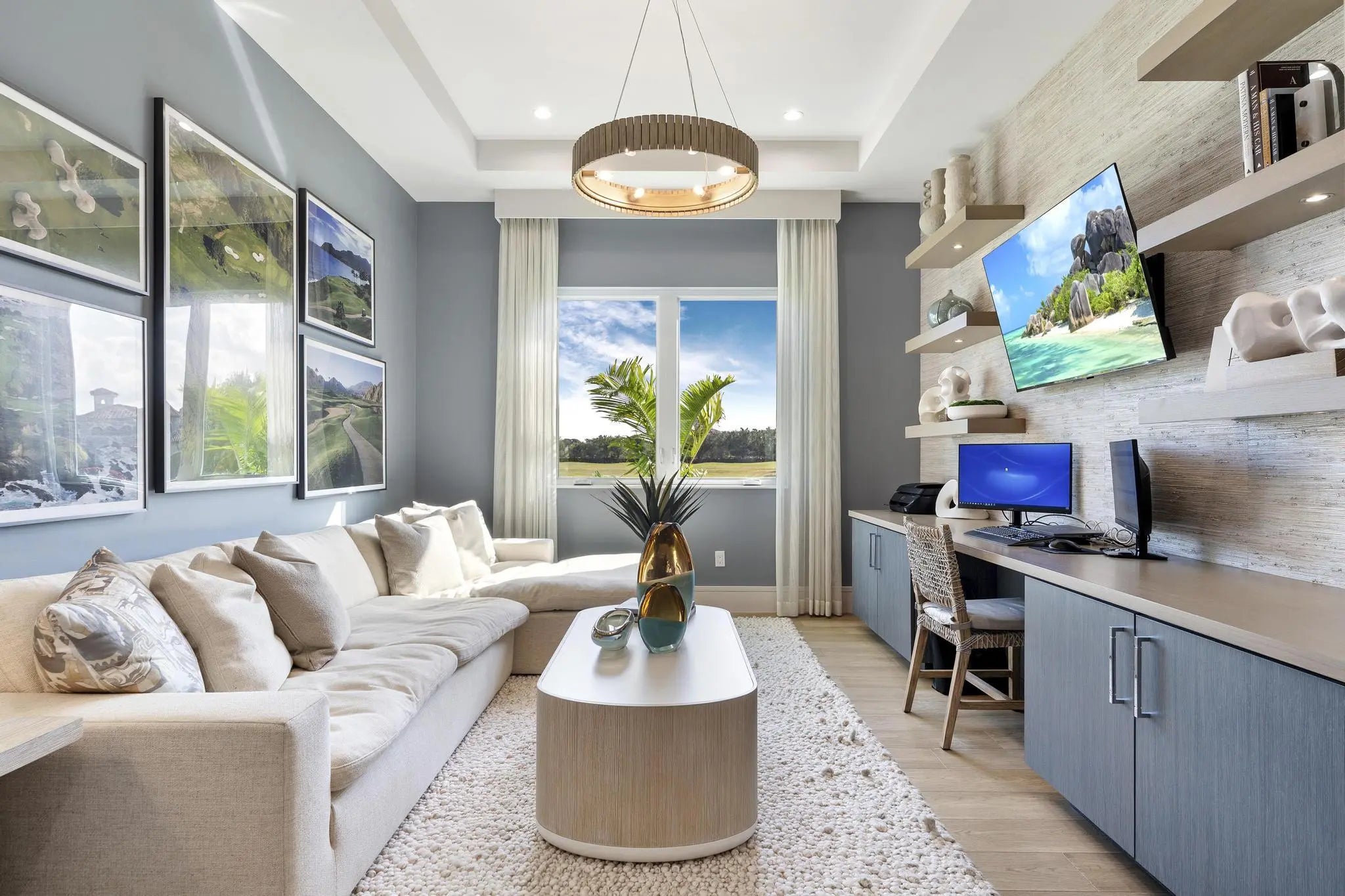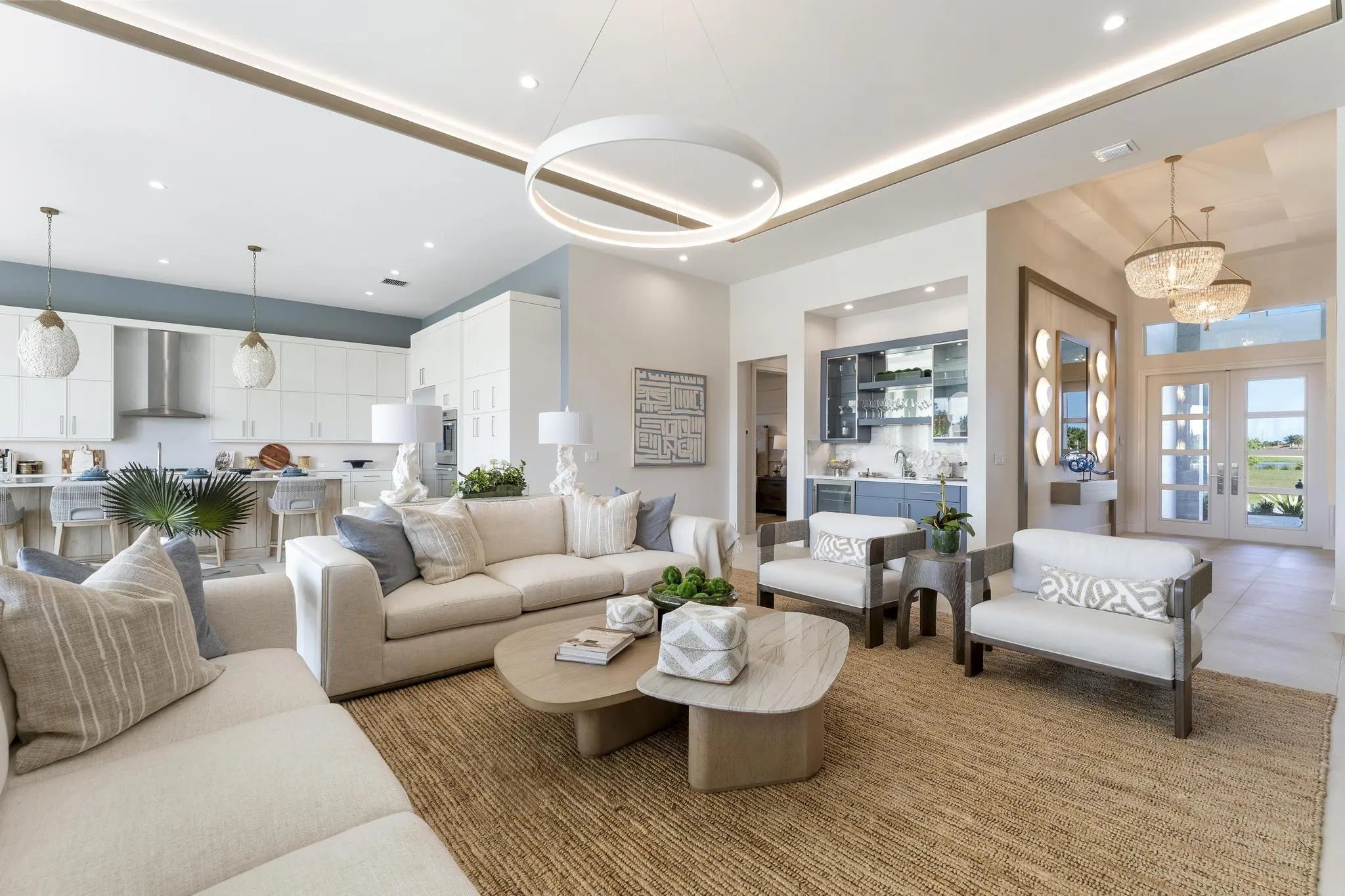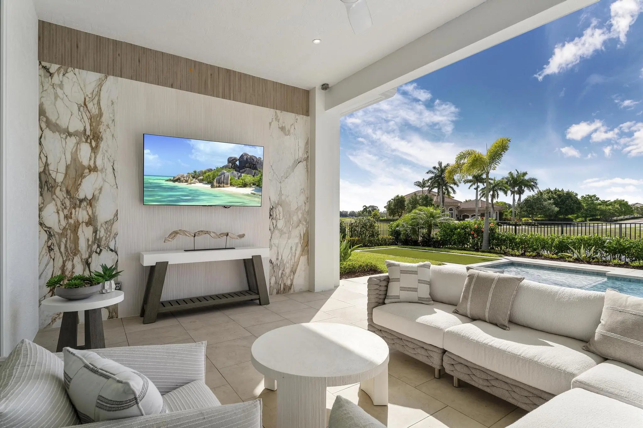 Beyond the gates of Tesoro awaits a lifestyle of luxury in this stunning model home by Ecclestone Signature Homes. Featuring three bedrooms plus a flexible den, the residence offers sweeping golf course and water views, premium upgrades, and designer finishes throughout. The Coastal Modern open floor plan boasts soaring ceilings and seamless indoor-outdoor living, highlighted by a spacious patio with a custom TV wall. Impact windows and doors add peace of mind, while the home's impeccable decor curated by a renowned South Florida designer completes this exceptional offering.