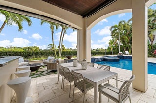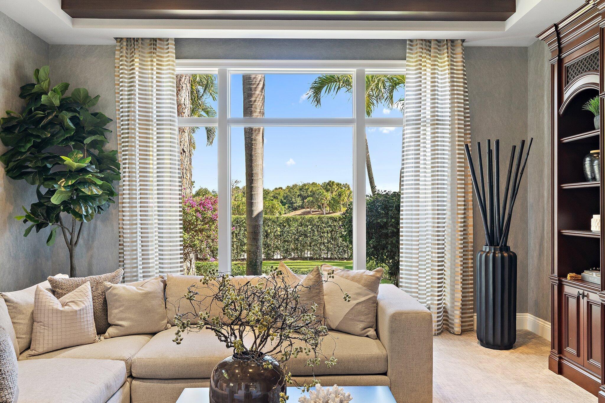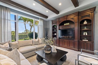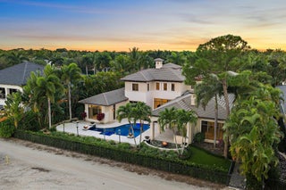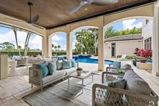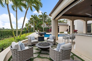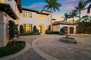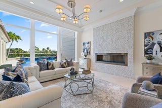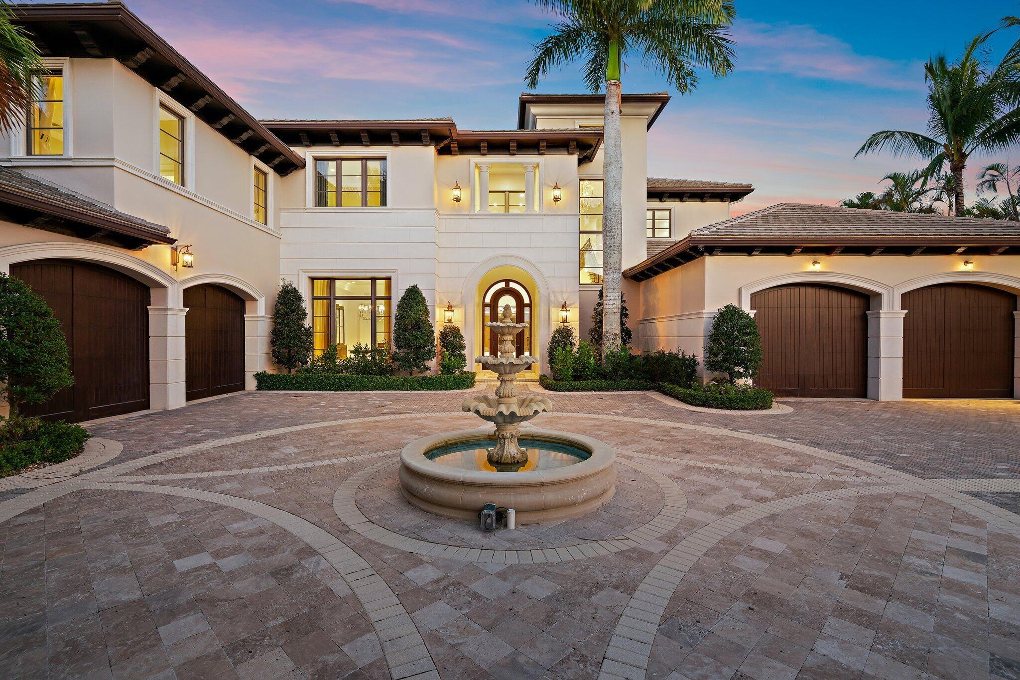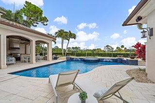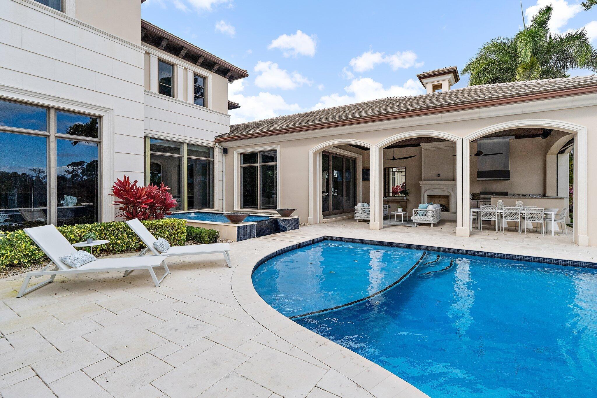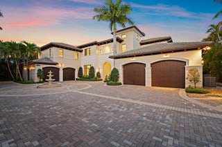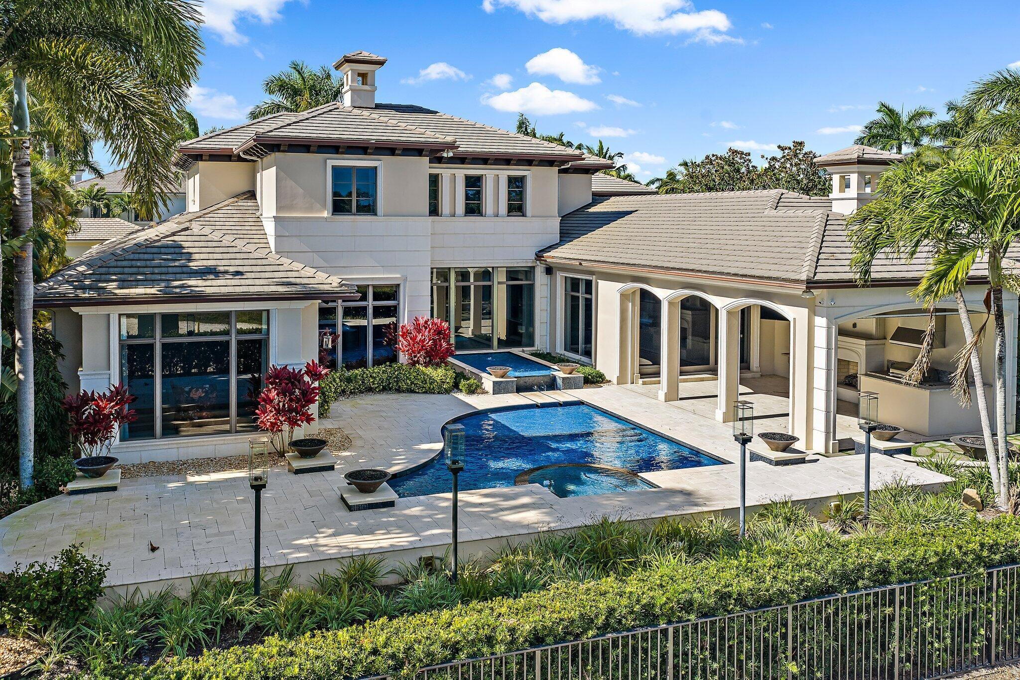 Exquisite two-story estate located in the prestigious Old Palm Golf Club. This exceptional residence offers nearly 7,400 sf of refined, modern living space, set on a half-acre lot with breathtaking golf course views. The home features five bedrooms plus an expansive office, spacious media room, and a total of 6 full and 2 half bathrooms. Upon entry, dramatic exterior water features and sweeping golf course vistas are revealed through an entire wall of floor-to-ceiling windows, complemented by soaring ceilings that enhance the home's grandeur. The elegant interior showcases arched doorways, a family room with a sleek modern fireplace, formal dining room, and a temperature-controlled wine room, all accented by stunning marble and luxurious wood flooring throughout,creating a sophisticated yet welcoming ambiance. The chef's kitchen opens effortlessly to the main entertaining areas, offering a seamless indoor-outdoor living experience. It is beautifully appointed with quartz countertops, double islands, rich wood-beam ceiling accents, a six-burner gas range, premium Thermador appliances, and a built-in Miele coffee maker. The first-floor primary suite is a private retreat, featuring custom wood built-in, a tray ceiling, and floor-to-ceiling windows overlooking the beautiful grounds. The luxurious spa-inspired his and her primary bathrooms offer dual custom walk-in closets, spacious glass-enclosed shower, and a soaking tub framed by picturesque garden views. The first level includes the primary suite, main living spaces, a private office, and a media/club room. The second floor hosts three ensuite bedrooms with a loft or office space along with a separate guest suite with separate access providing ultimate privacy. Outdoor living is equally impressive, featuring serene golf and lake views, a saltwater pool, summer kitchen, phantom screens, gas fire pit, and striking poolside torches and cascading water elements perfect for year-round enjoyment. Other notable highlights include a private elevator, 4.5-car garage with lifts, and thoughtfully designed spaces ideal for both everyday living and grand entertaining. This home with complete impact windows & modern conveniences seamlessly blends luxury, comfort, and sophistication in one of Palm Beach Gardens' most coveted communities.