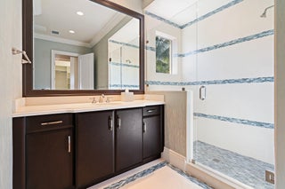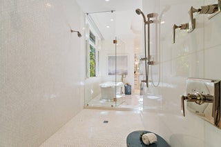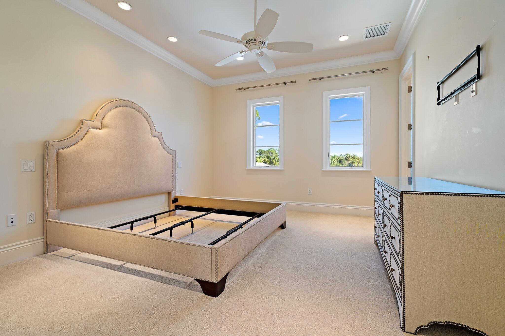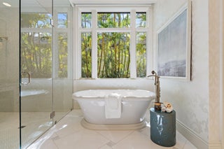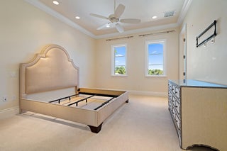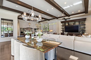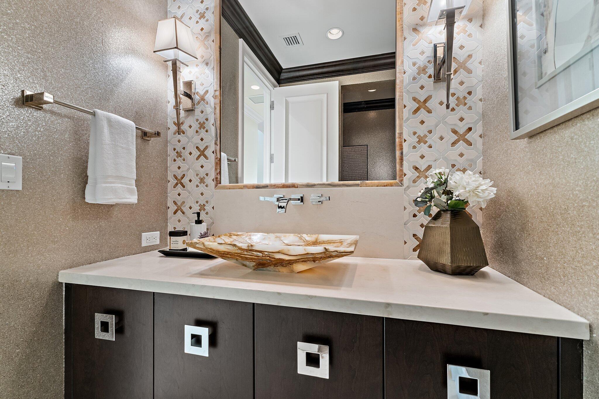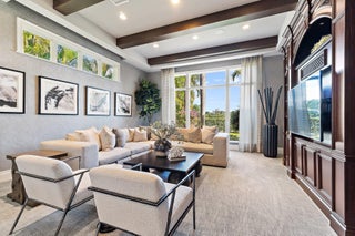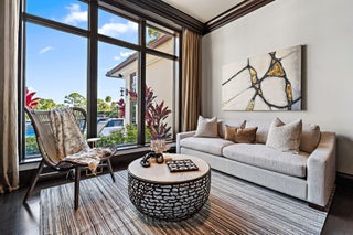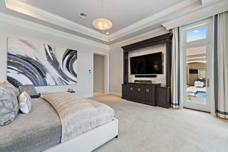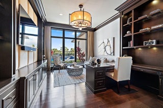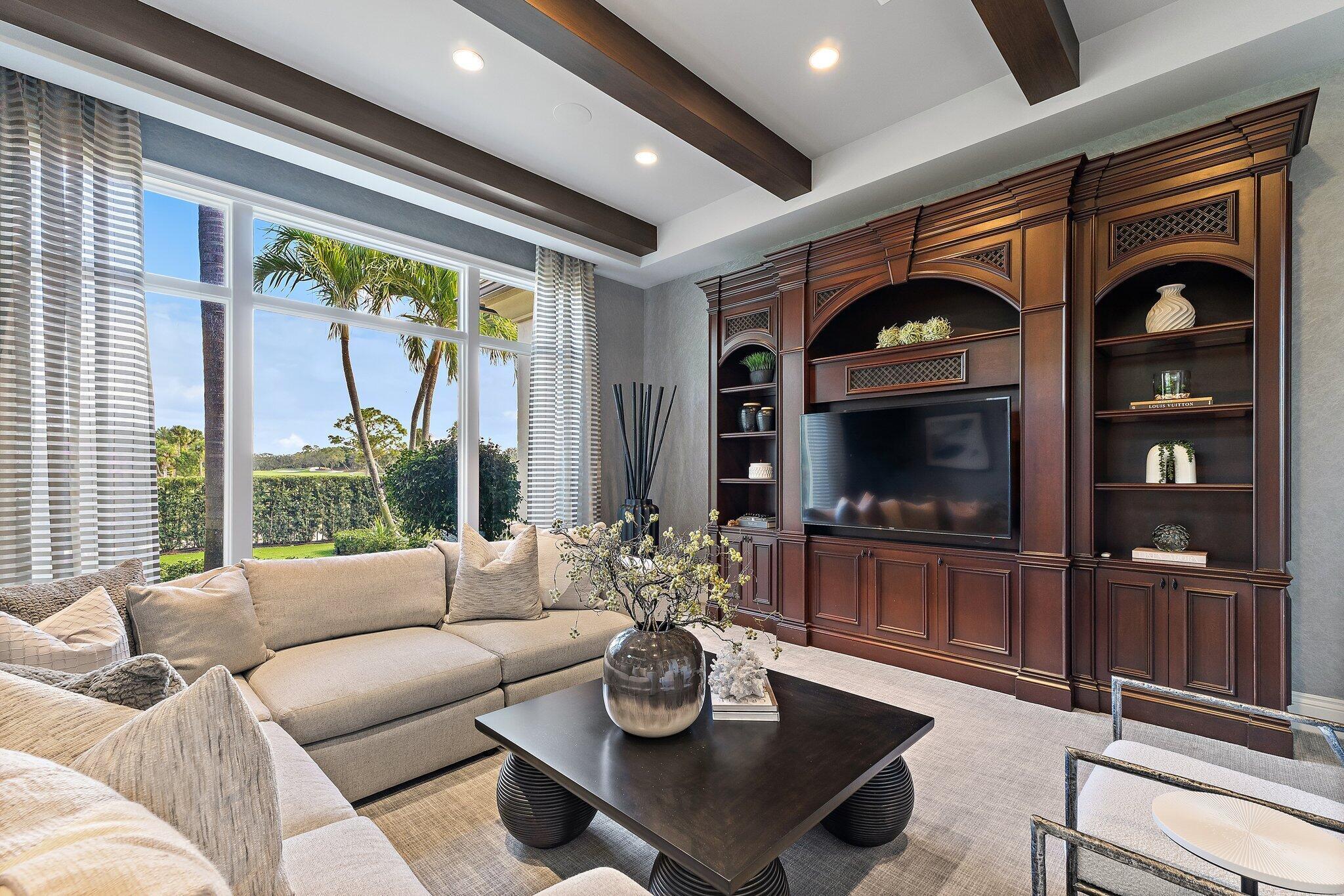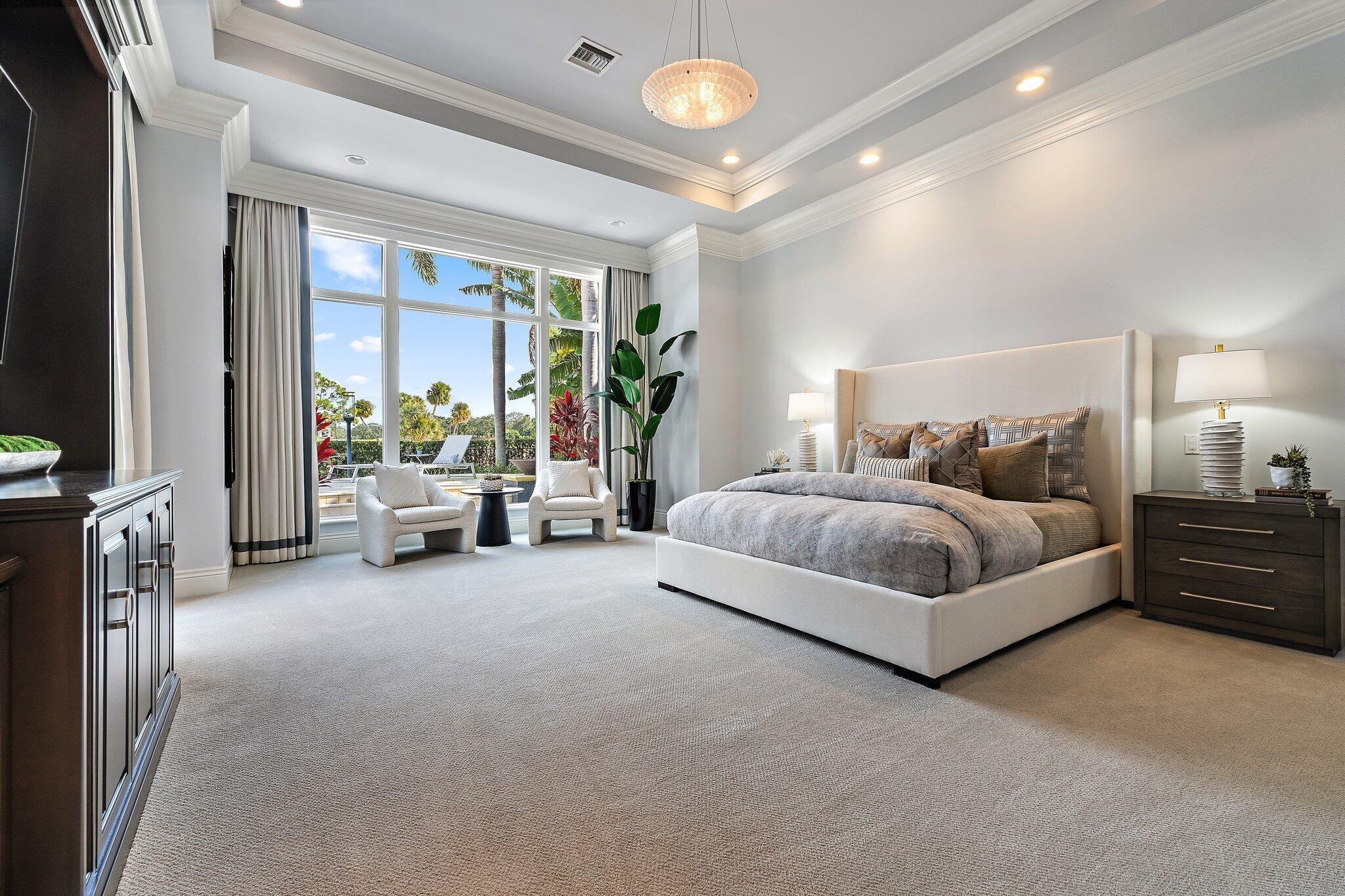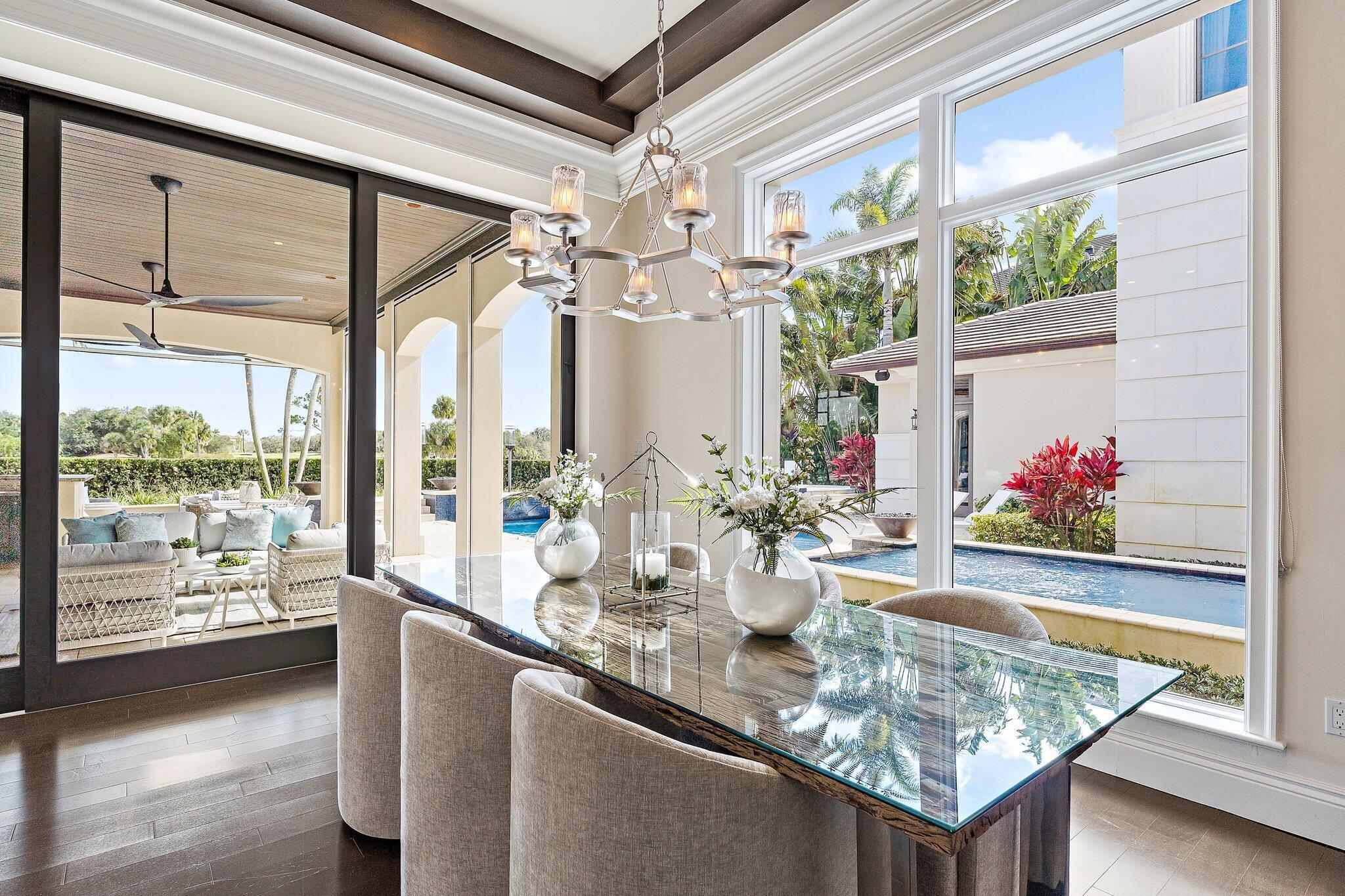 Exquisite two-story estate located in the prestigious Old Palm Golf Club. This exceptional residence offers nearly 7,400 sf of refined, modern living space, set on a half-acre lot with breathtaking golf course views. The home features five bedrooms plus an expansive office, spacious media room, and a total of 6 full and 2 half bathrooms. Upon entry, dramatic exterior water features and sweeping golf course vistas are revealed through an entire wall of floor-to-ceiling windows, complemented by soaring ceilings that enhance the home's grandeur. The elegant interior showcases arched doorways, a family room with a sleek modern fireplace, formal dining room, and a temperature-controlled wine room, all accented by stunning marble and luxurious wood flooring throughout,creating a sophisticated yet welcoming ambiance. The chef's kitchen opens effortlessly to the main entertaining areas, offering a seamless indoor-outdoor living experience. It is beautifully appointed with quartz countertops, double islands, rich wood-beam ceiling accents, a six-burner gas range, premium Thermador appliances, and a built-in Miele coffee maker. The first-floor primary suite is a private retreat, featuring custom wood built-in, a tray ceiling, and floor-to-ceiling windows overlooking the beautiful grounds. The luxurious spa-inspired his and her primary bathrooms offer dual custom walk-in closets, spacious glass-enclosed shower, and a soaking tub framed by picturesque garden views. The first level includes the primary suite, main living spaces, a private office, and a media/club room. The second floor hosts three ensuite bedrooms with a loft or office space along with a separate guest suite with separate access providing ultimate privacy. Outdoor living is equally impressive, featuring serene golf and lake views, a saltwater pool, summer kitchen, phantom screens, gas fire pit, and striking poolside torches and cascading water elements perfect for year-round enjoyment. Other notable highlights include a private elevator, 4.5-car garage with lifts, and thoughtfully designed spaces ideal for both everyday living and grand entertaining. This home with complete impact windows & modern conveniences seamlessly blends luxury, comfort, and sophistication in one of Palm Beach Gardens' most coveted communities.