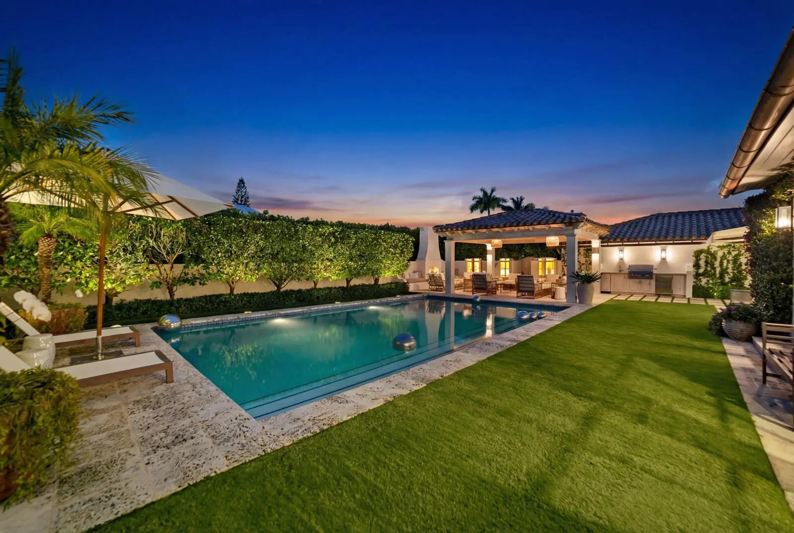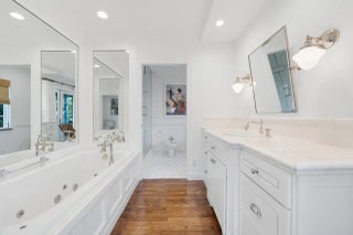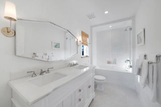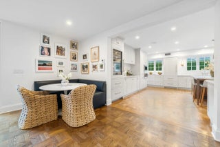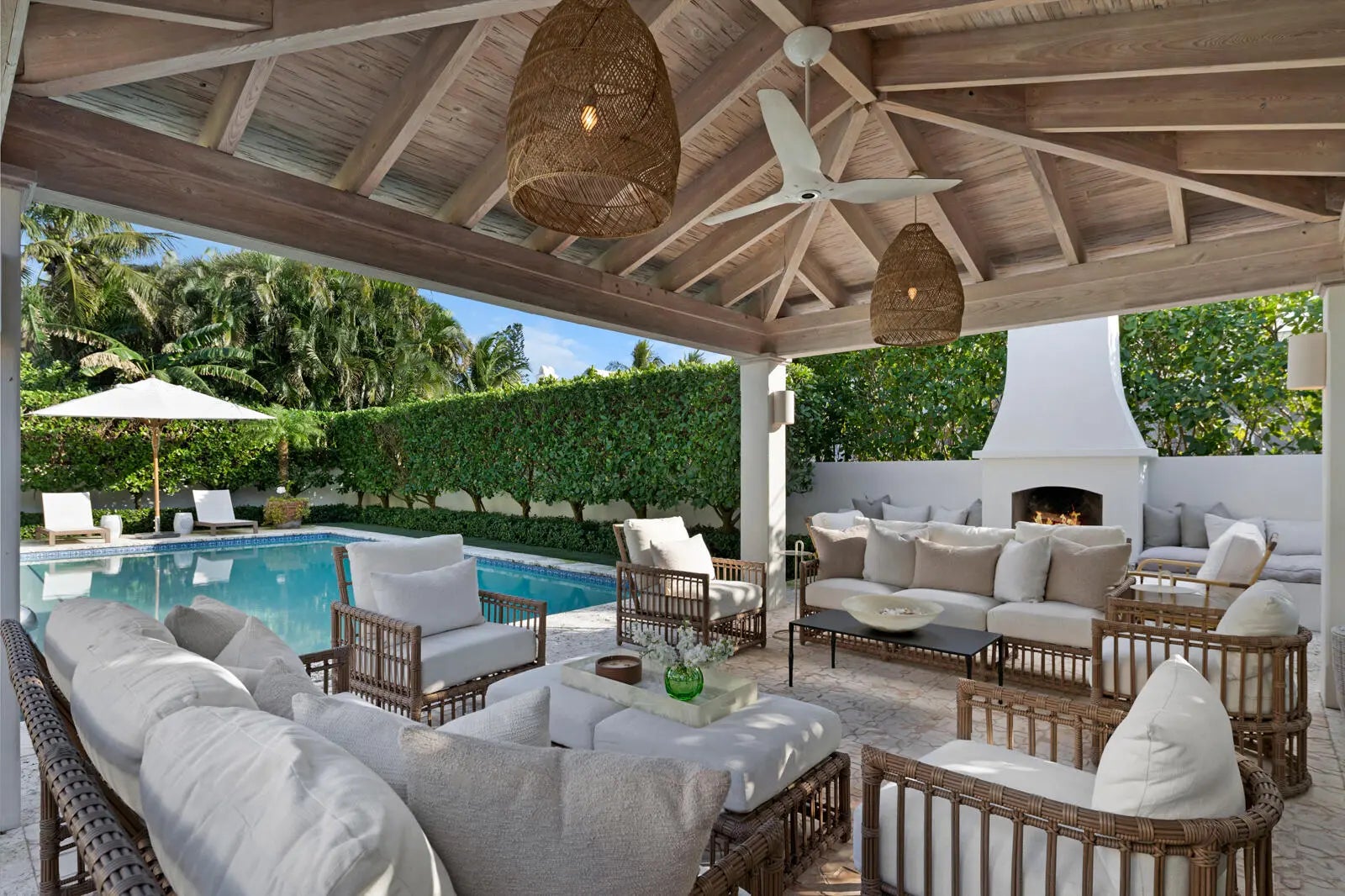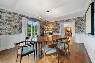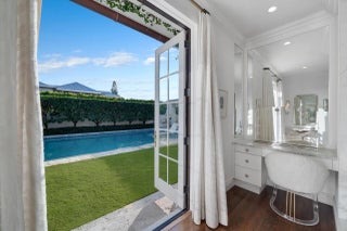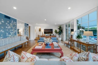Located in Palm Beach's desirable North End, this Monterey-style residence is set on an oversized 121' x 105' lot and offers 6,138+/- total square feet with four bedrooms and four and a half bathrooms. The property features exceptional outdoor space, including a generous front yard, a large south-facing pool with terrace, loggia, summer kitchen, and a service entry with a two-car garage accessed from Via Marila.The foyer, finished with Versailles wood flooring, includes a powder room and introduces the main living areas, with a staircase leading to the second floor. The living room features a gas-burning fireplace, while the formal dining room is filled with natural light and connects directly to the kitchen. The eat-in kitchen is well appointed with a