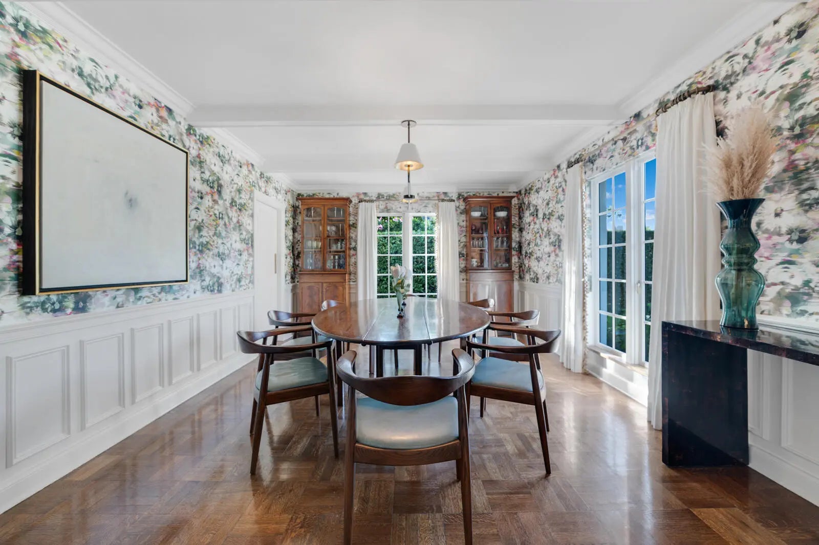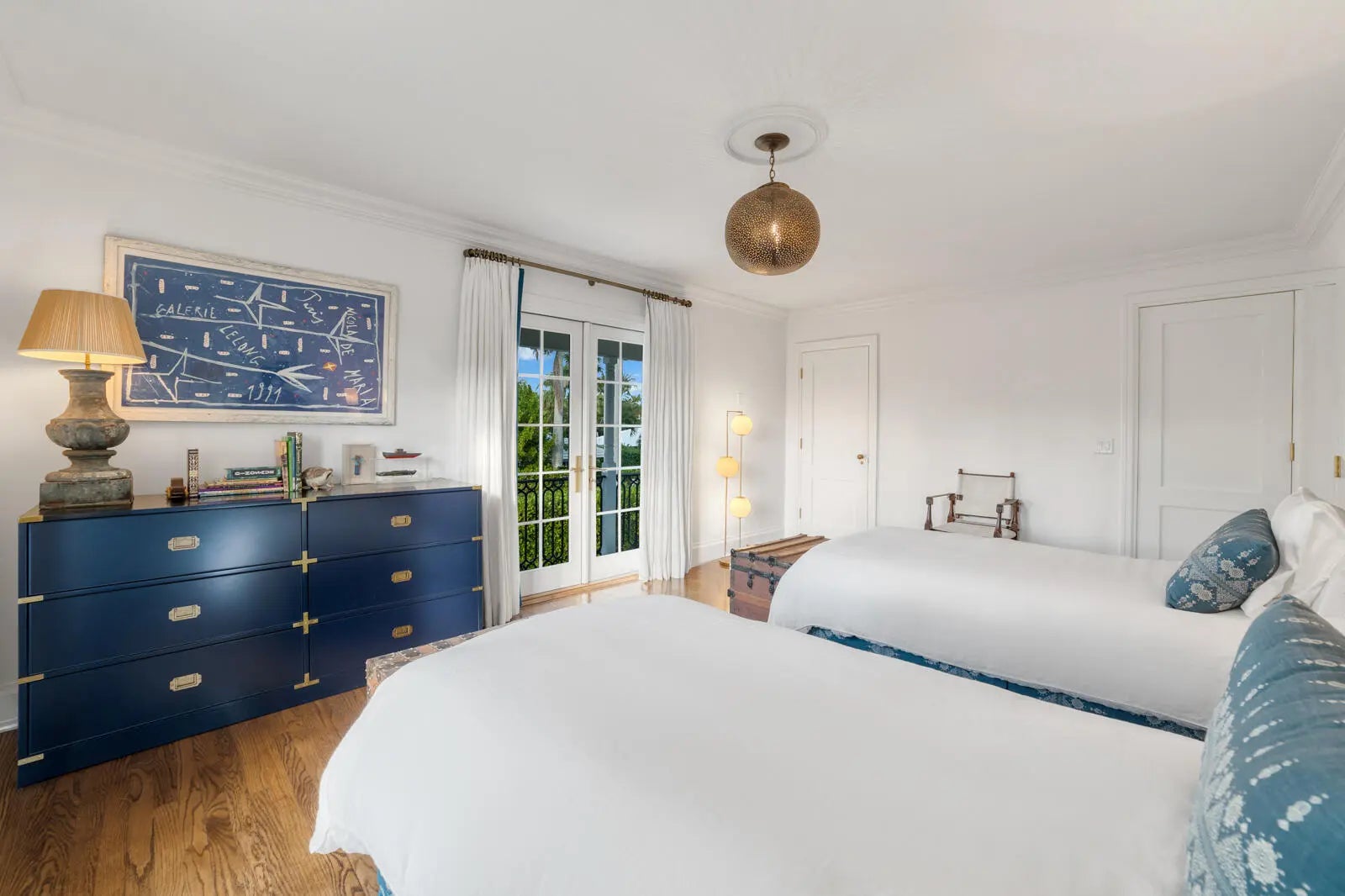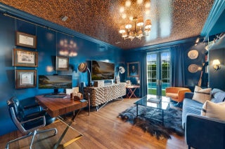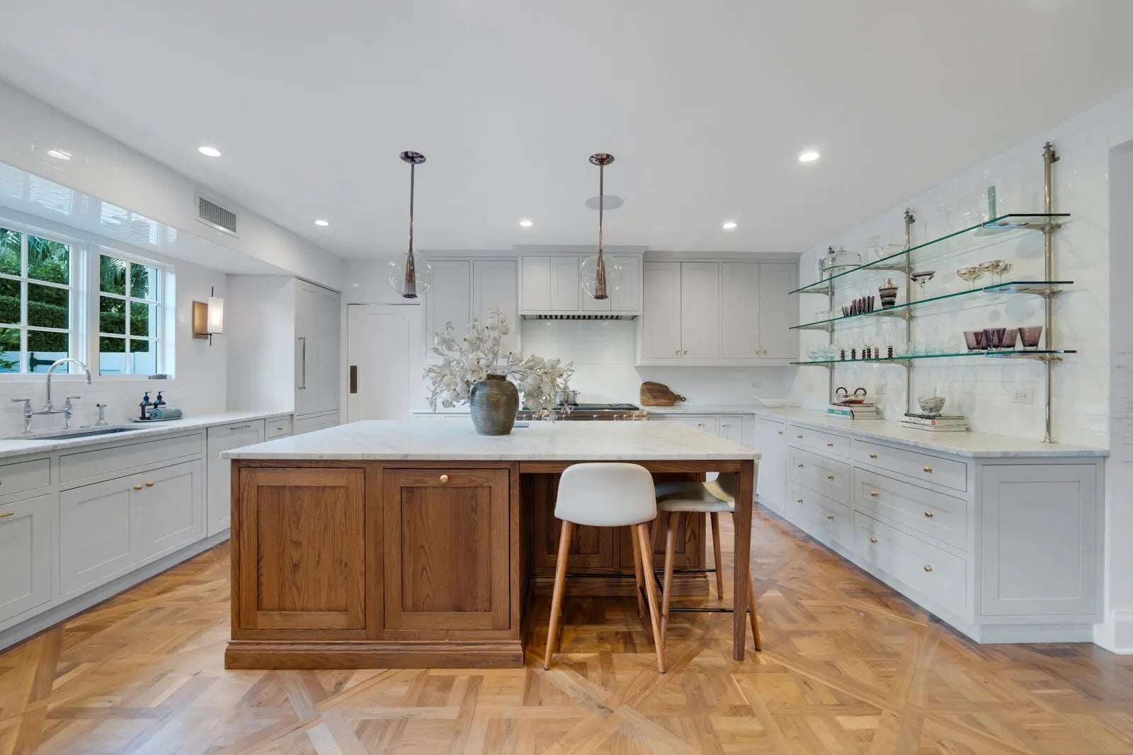 Located in Palm Beach's desirable North End, this Monterey-style residence is set on an oversized 121' x 105' lot and offers 6,138+/- total square feet with four bedrooms and four and a half bathrooms. The property features exceptional outdoor space, including a generous front yard, a large south-facing pool with terrace, loggia, summer kitchen, and a service entry with a two-car garage accessed from Via Marila.The foyer, finished with Versailles wood flooring, includes a powder room and introduces the main living areas, with a staircase leading to the second floor. The living room features a gas-burning fireplace, while the formal dining room is filled with natural light and connects directly to the kitchen. The eat-in kitchen is well appointed with a